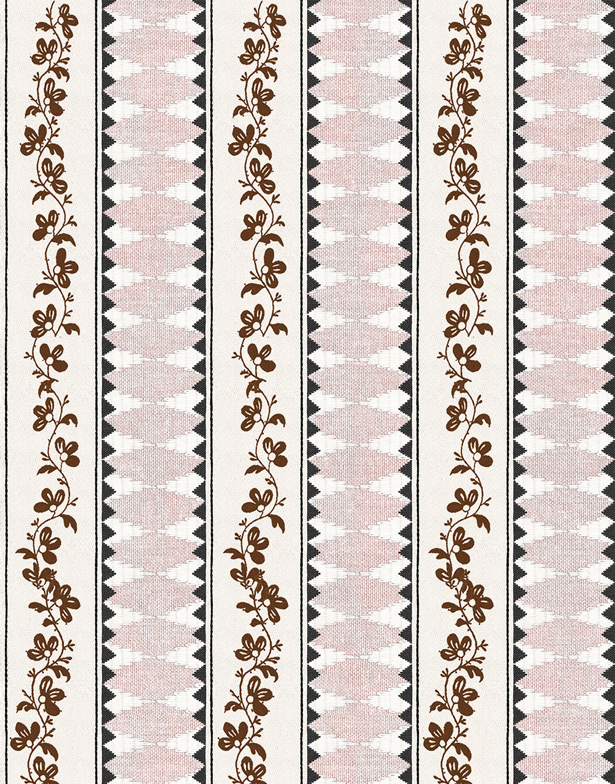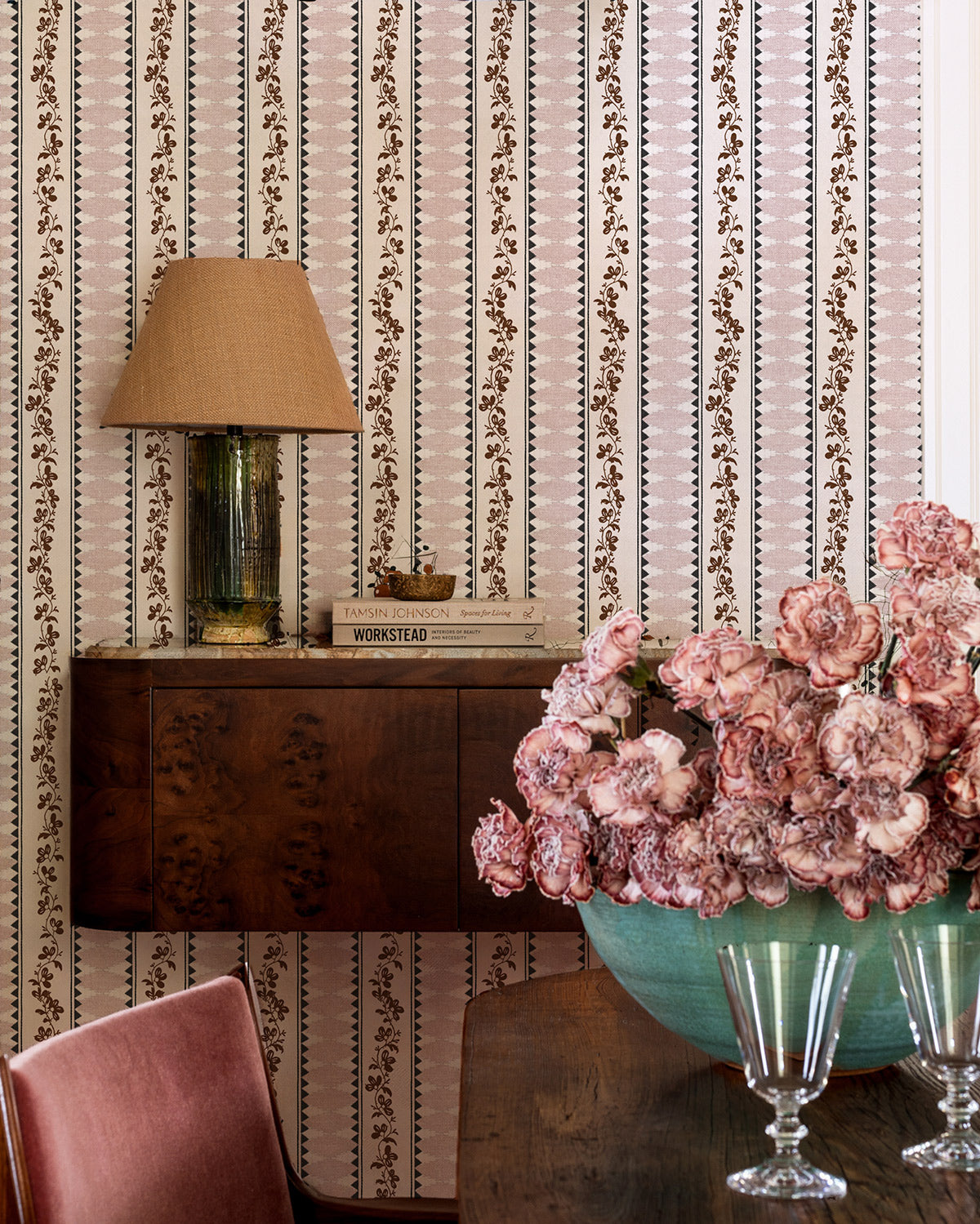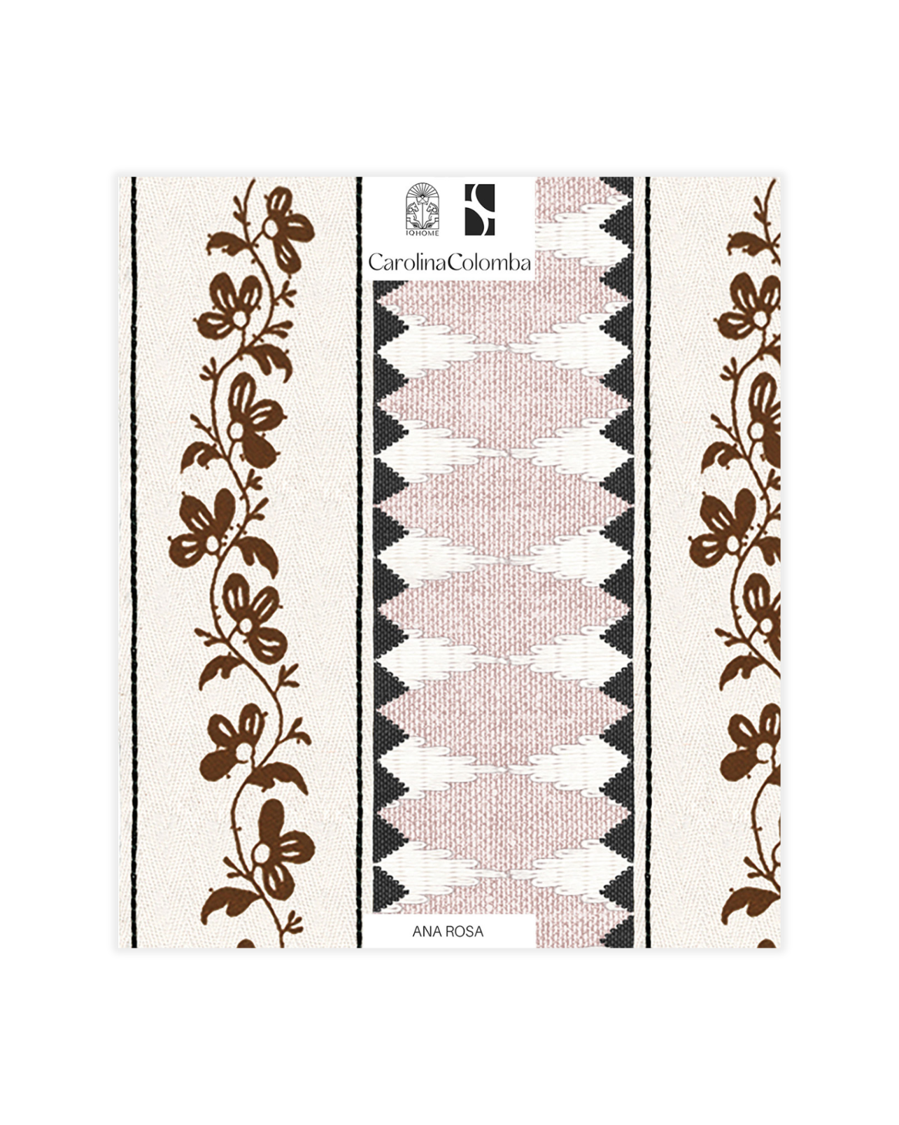 Este hermoso papel pintado ANA ROSA un patrón que combina guardas florales con formas geométricas, fusionando lo clásico con lo moderno, diseño en colaboración con Carolina Colomba.