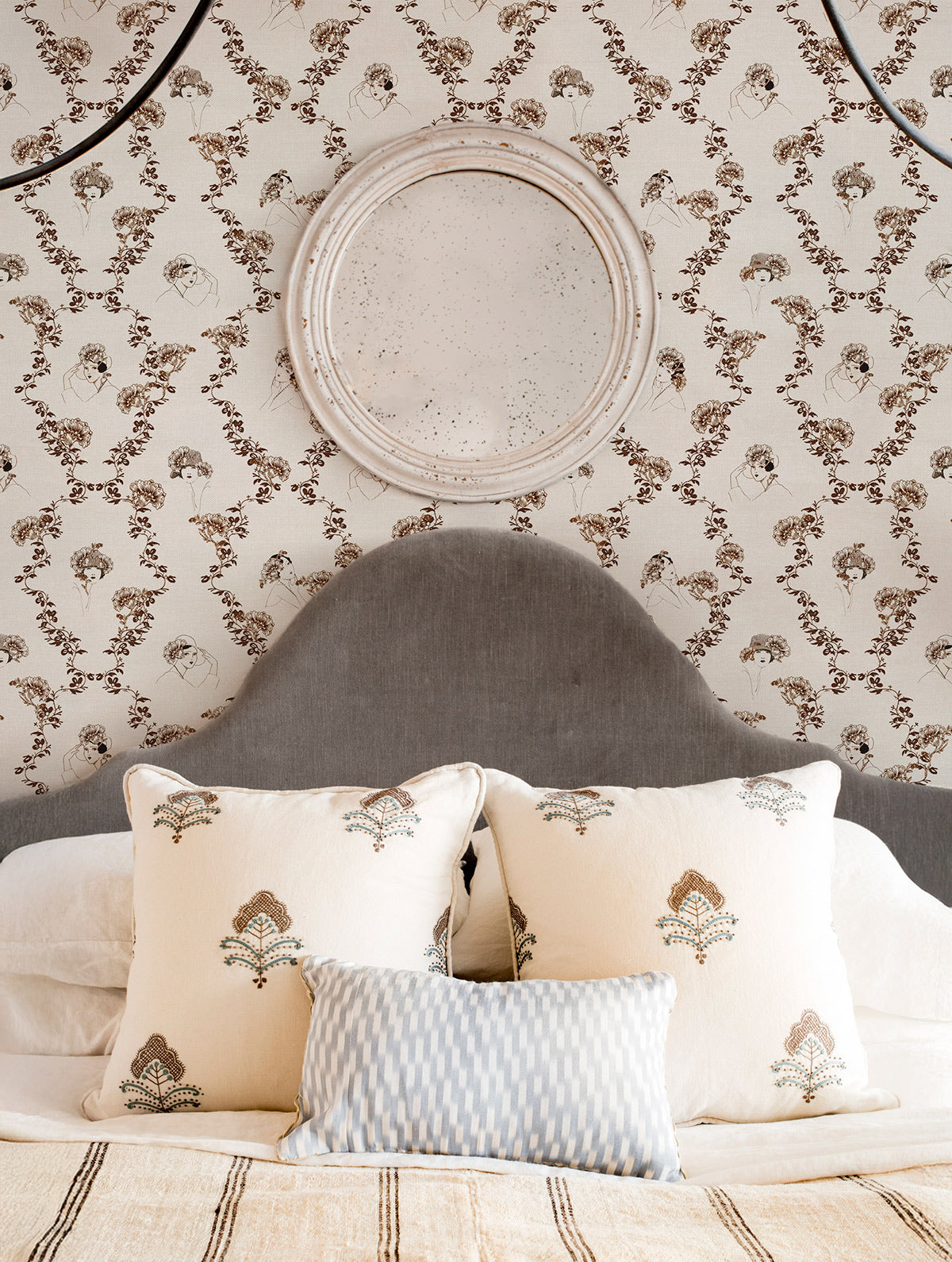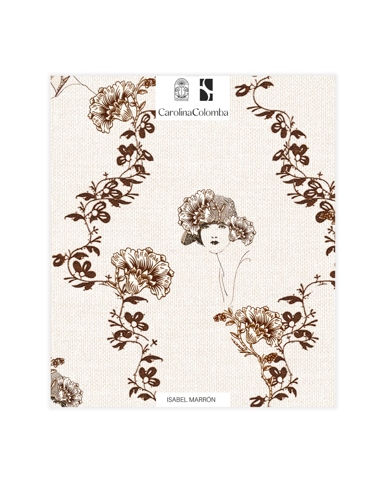 ISABEL MARRÓN es un papel pintado de patrón floral que forma una enredadera delicada que nos evoca los años 50, entrelaza ilustraciones femeninas con flores y hoja, diseño en colaboración con Carolina Colomba.