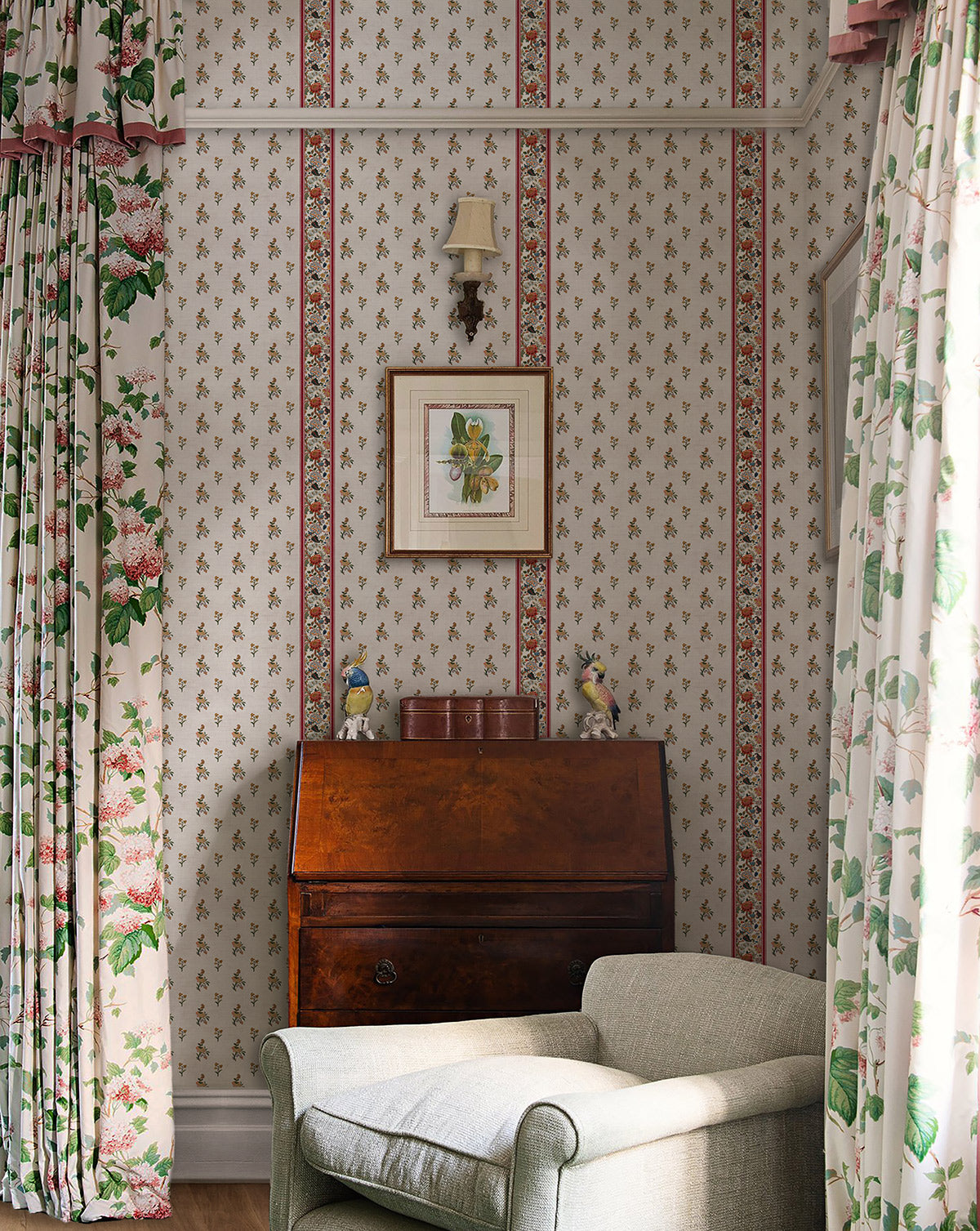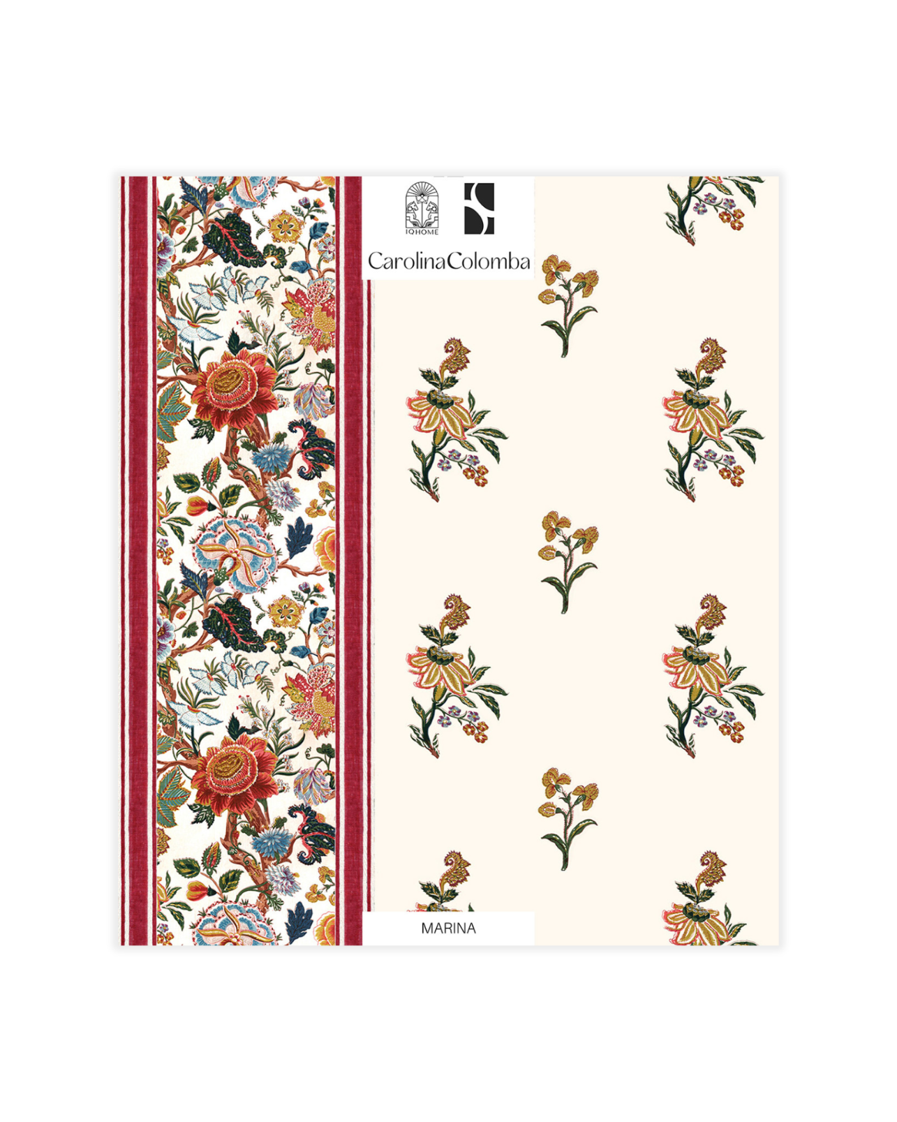 MARINA es un papel pintado en patrón que combina guardas y flores de diferentes tamaños, dándole frescura y elegancia a espacios tan bonitos como éste, diseño en colaboración con Carolina Colomba.