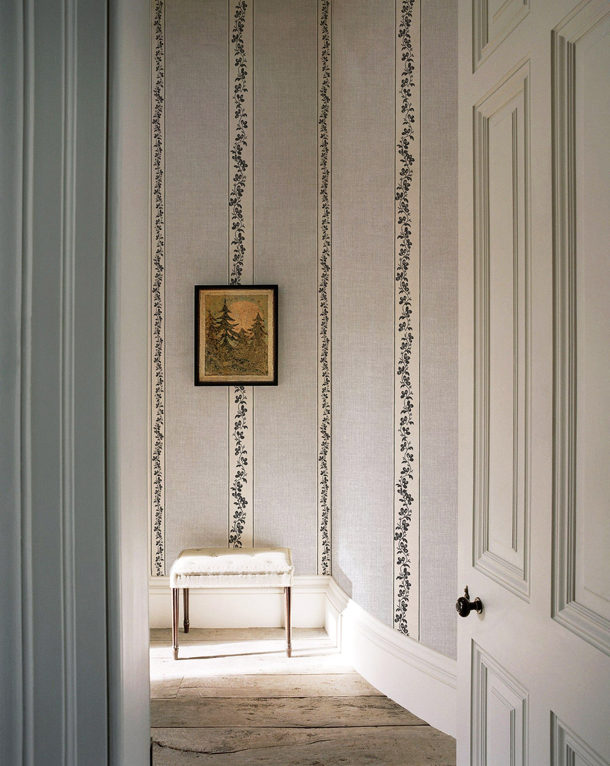 Este hermoso papel pintado SOFÍA GRIS combina guardas florales con con textura tipo lino, acogedor, elegante y femenino, diseño en colaboración con Carolina Colomba.
