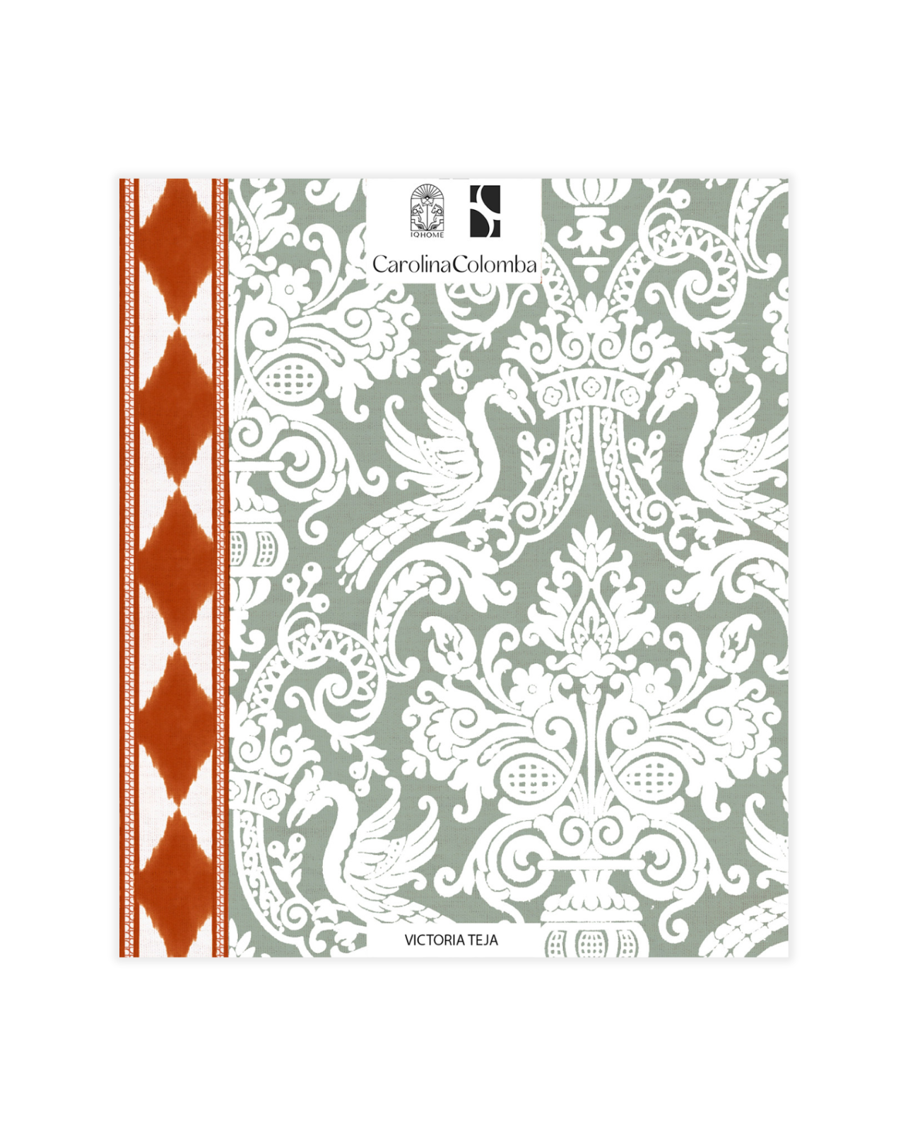 VICTORIA VERDE Y TEJA es un papel pintado, patrón de estilo palaciego en tono verde oliva, en el que conviven guardas étnicas con una trama de leones que tejen un figura y forma sofisticada, moderna y atemporal a la vez, diseño en colaboración con Carolina Colomba.