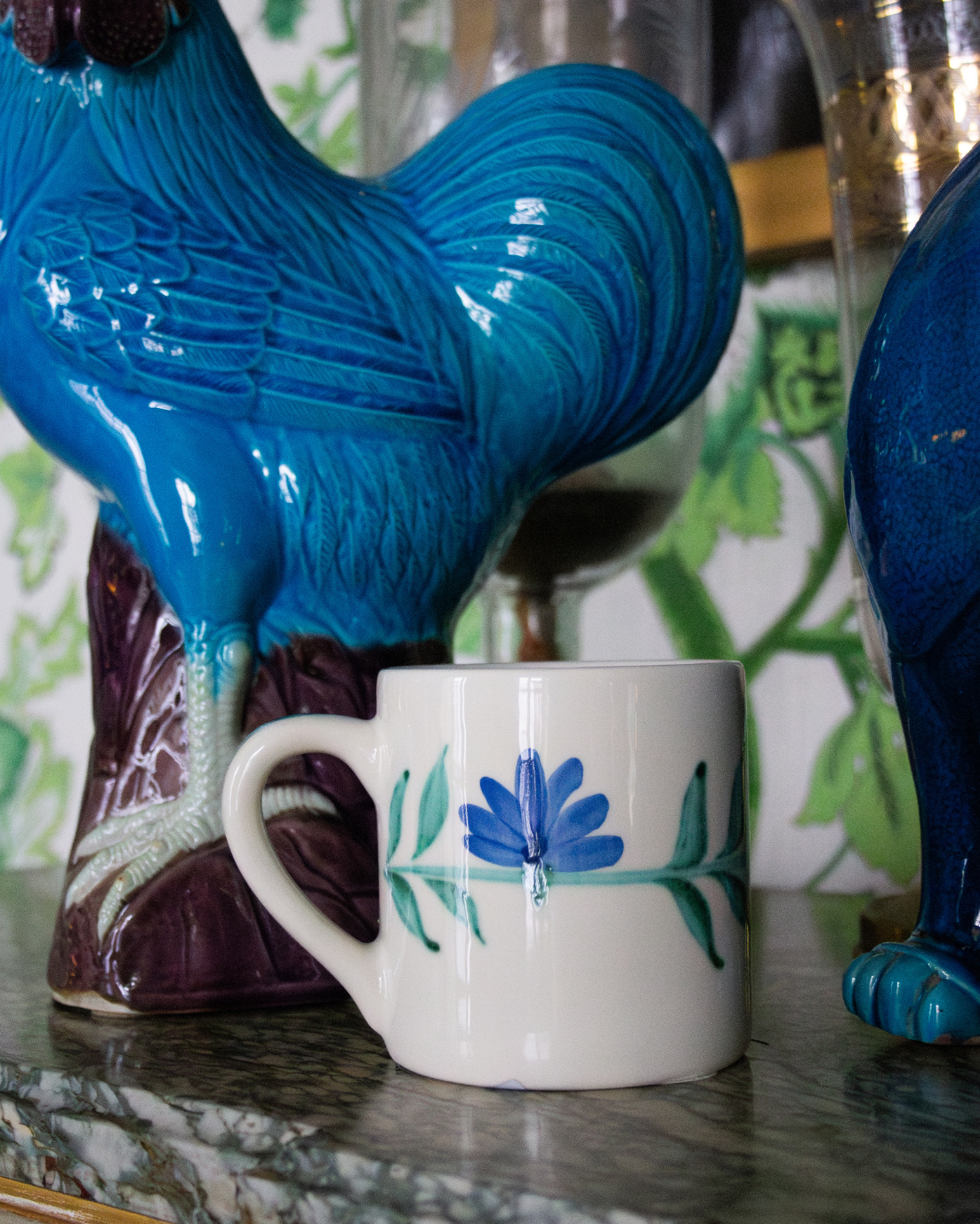Taza hecha en cerámica pintada a mano en tonos verdes y azules con detalles florales. También disponible en color terracota.