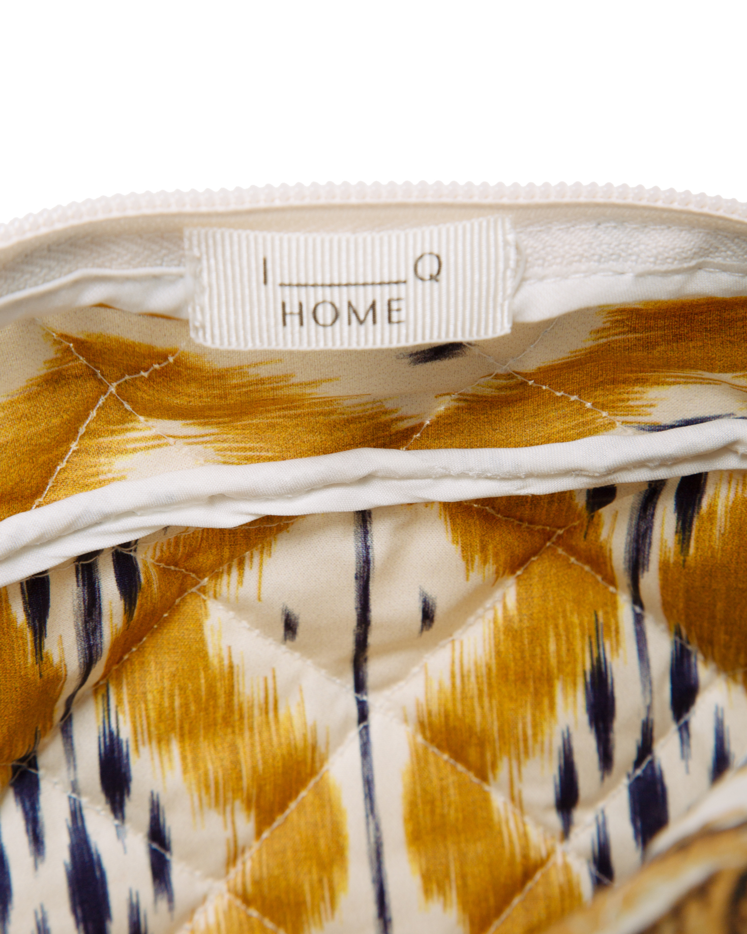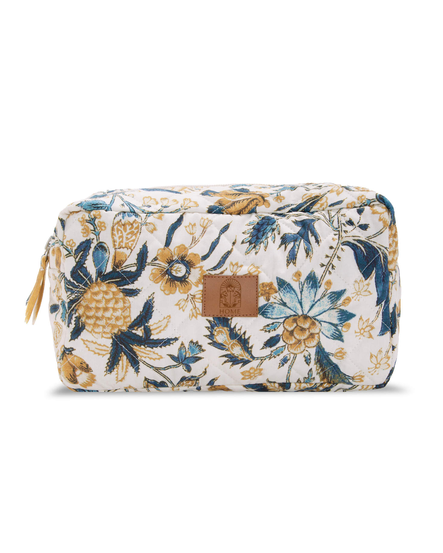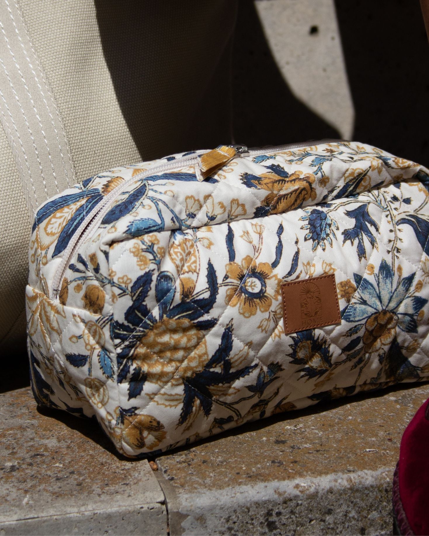 This toiletry bag is made from 100% quilted cotton, with a soft and durable exterior decorated with a delicate floral print in shades of blue and mustard. Its interior is resin-coated for easy cleaning and features an ethnic-print lining for an unexpected touch of color and style.