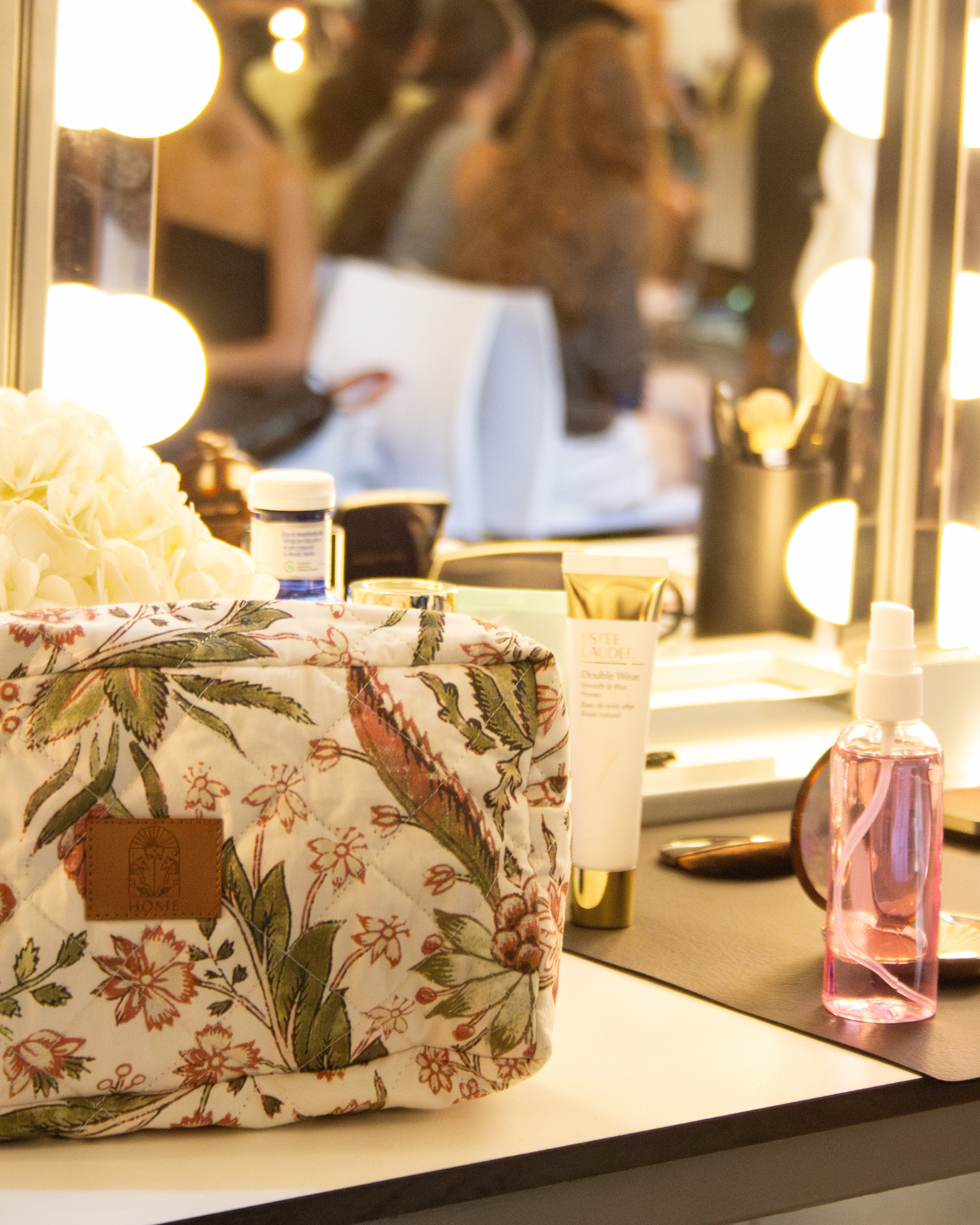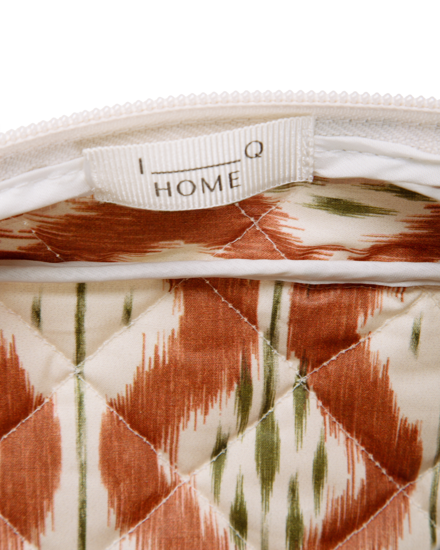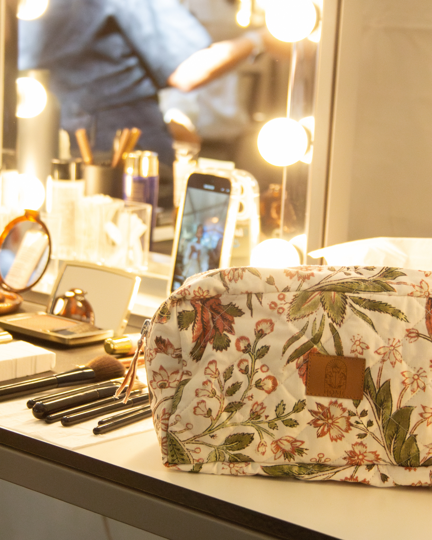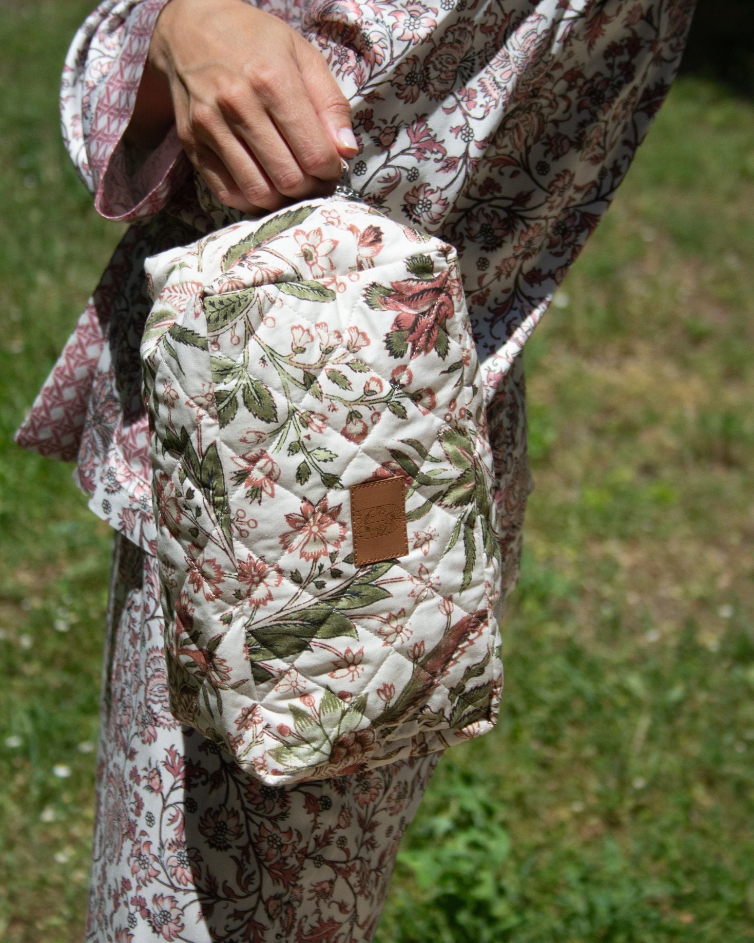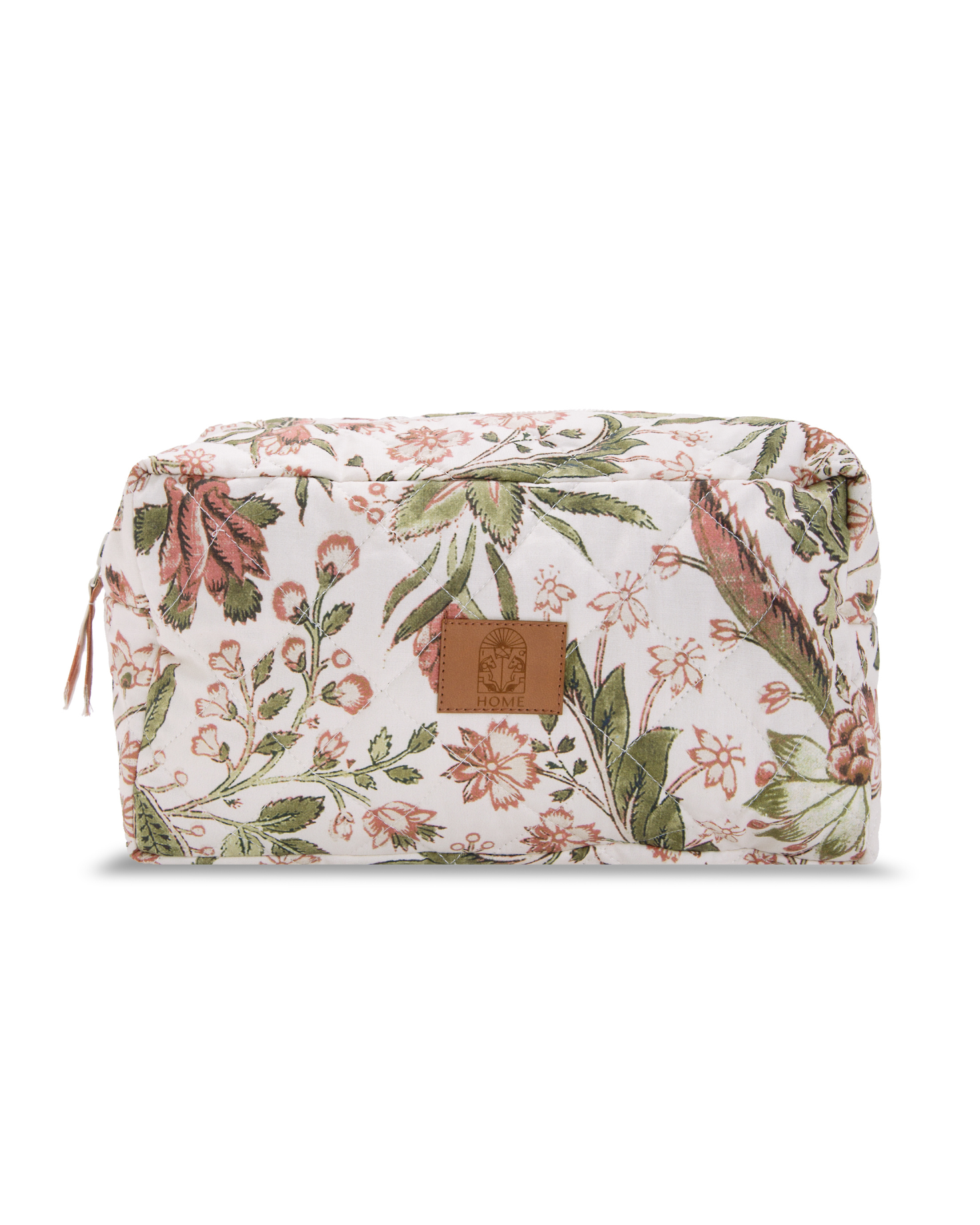 This toiletry bag is made from 100% quilted cotton, with a soft and durable exterior decorated with a delicate floral print in shades of pink and green. Its interior is resin-coated for easy cleaning and features an ethnic-print lining for an unexpected touch of color and style.
