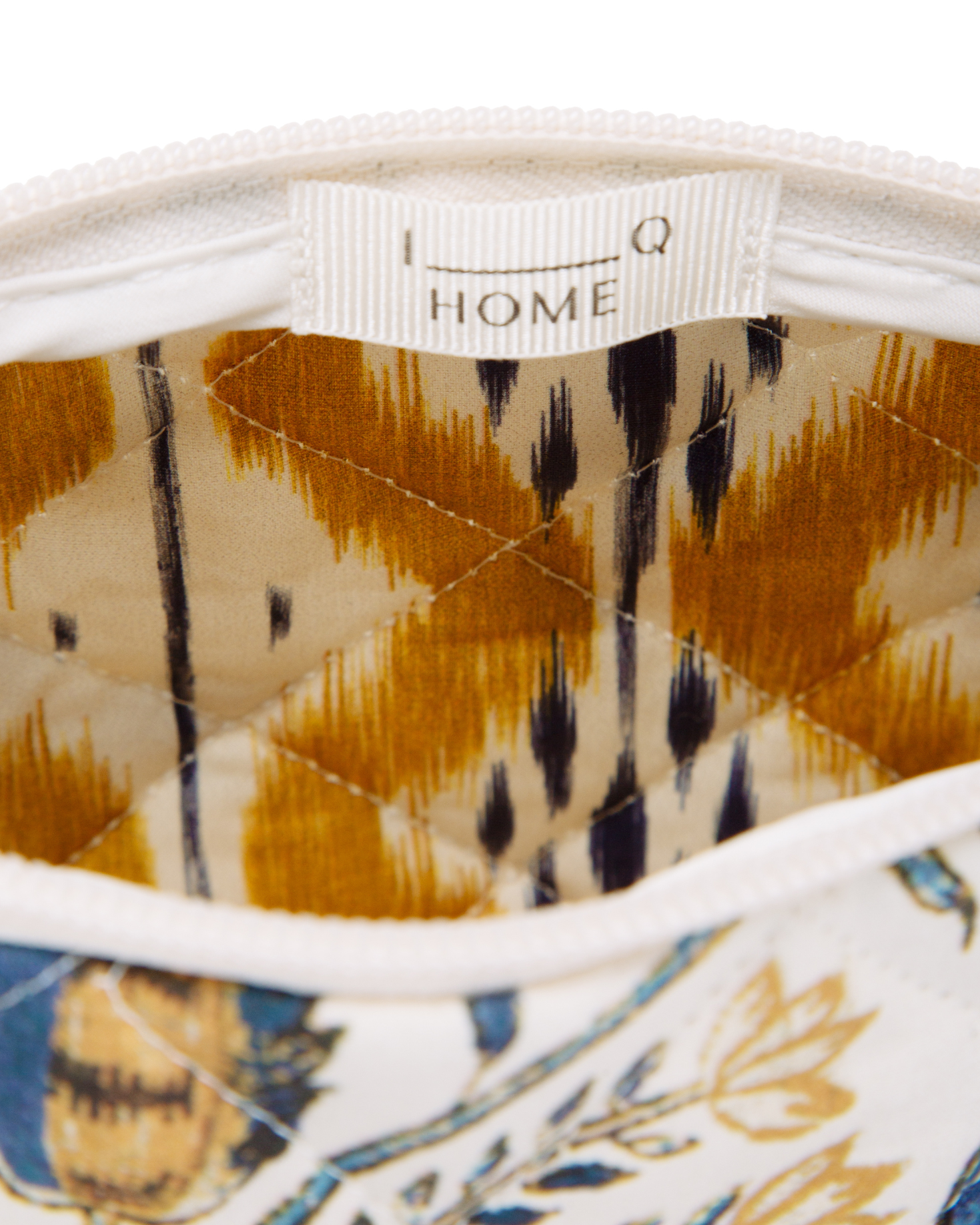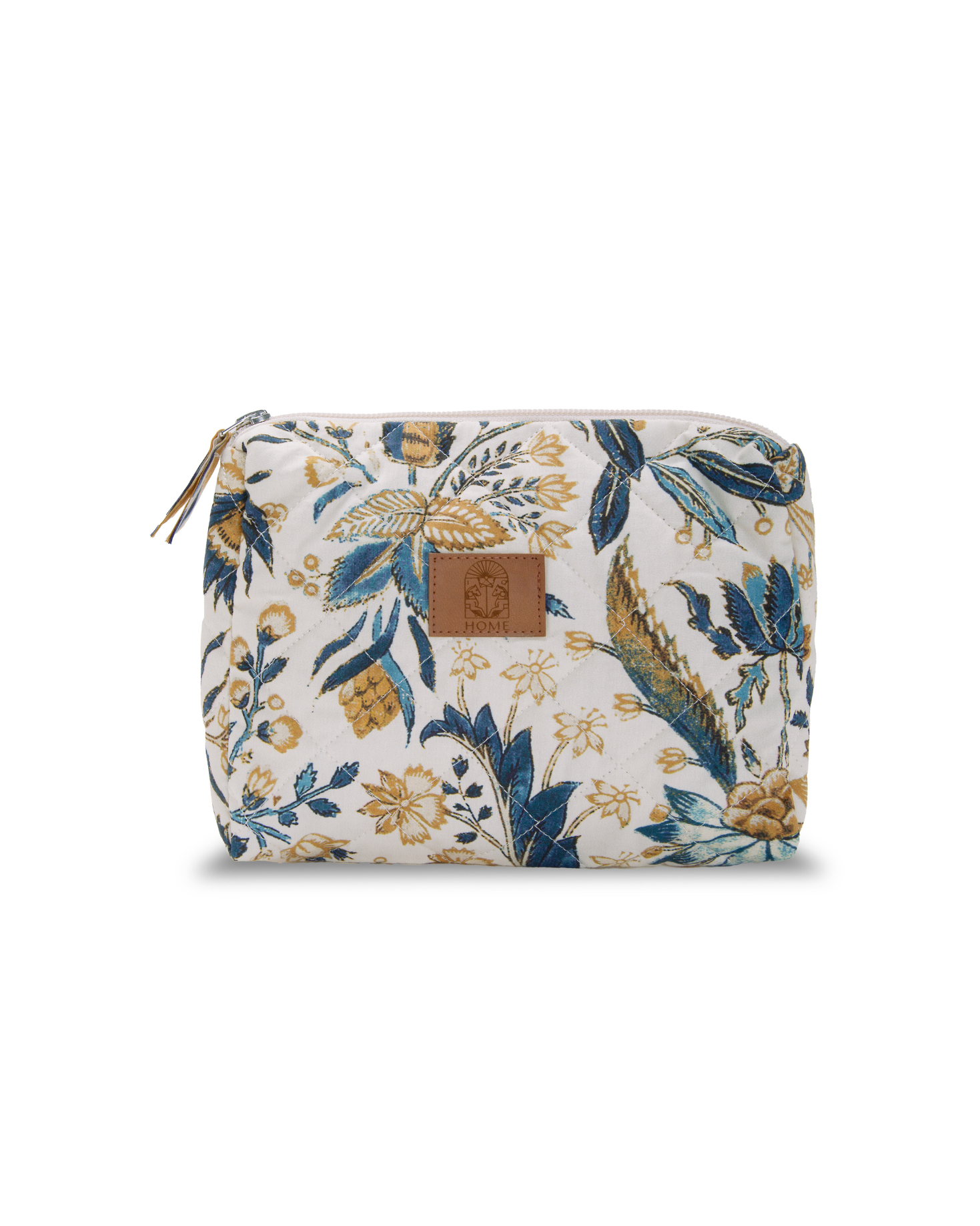 This toiletry bag is made from 100% quilted cotton, with a soft and durable exterior decorated with a delicate floral print in shades of blue and mustard. Its interior is resin-coated for easy cleaning and features an ethnic-print lining for an unexpected touch of color and style.