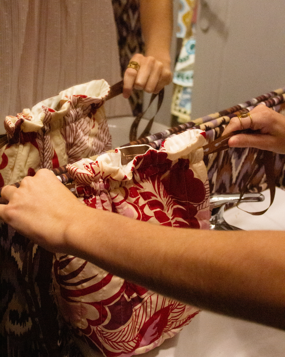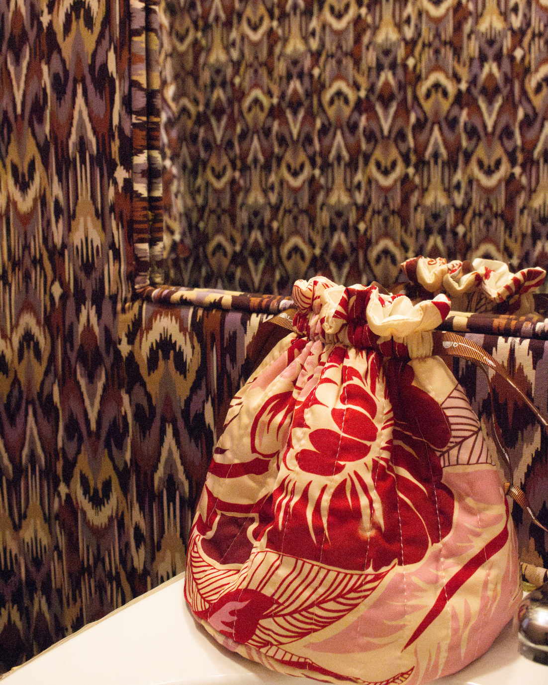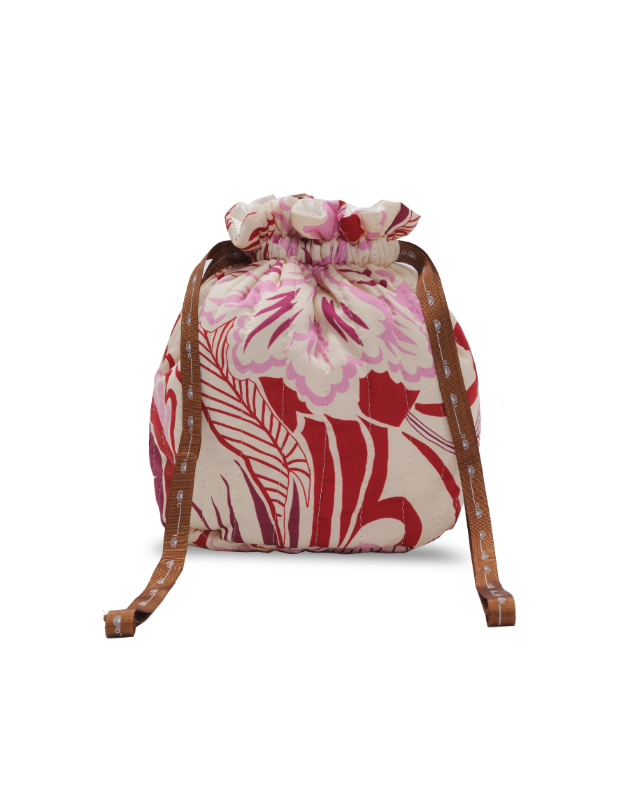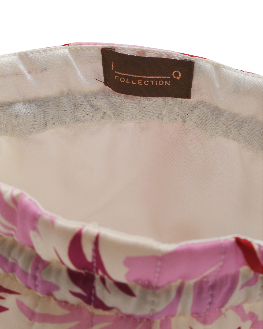 Neceser en forma de saco con estampado floral y cinta con logo IQ, colección especial "IQ se viste de rosa".