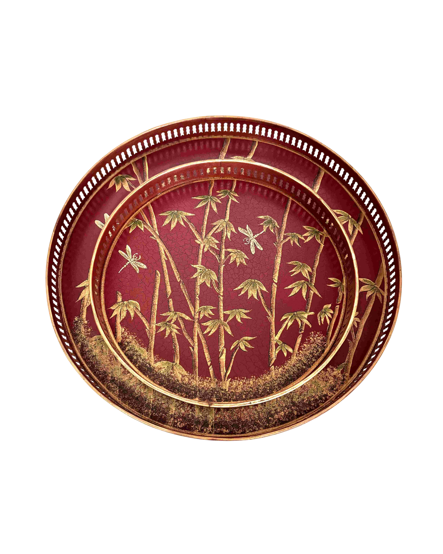 Pack of two round metal trays, large and small. Burgundy background with bamboo illustration and gold details.