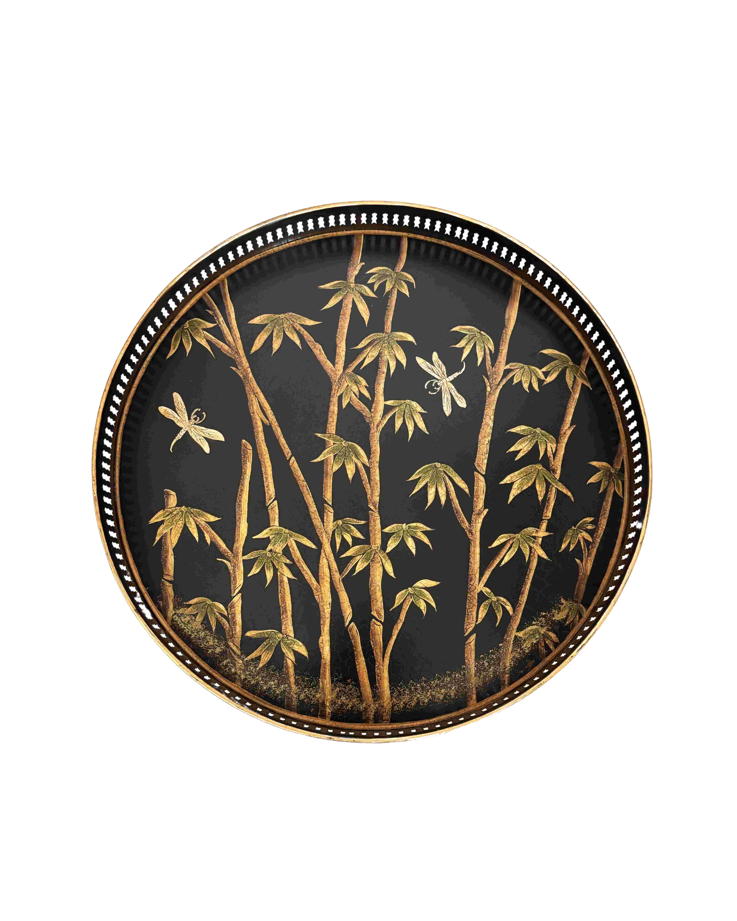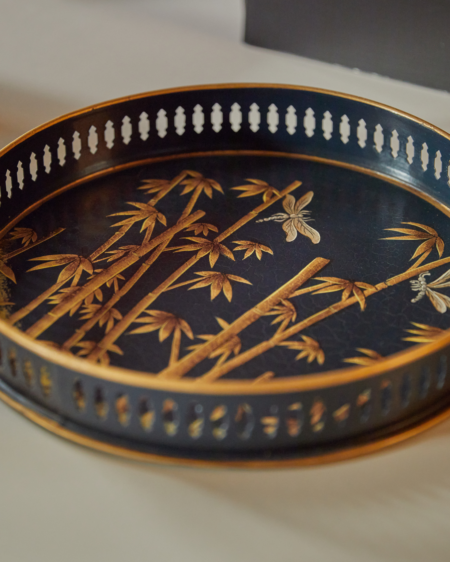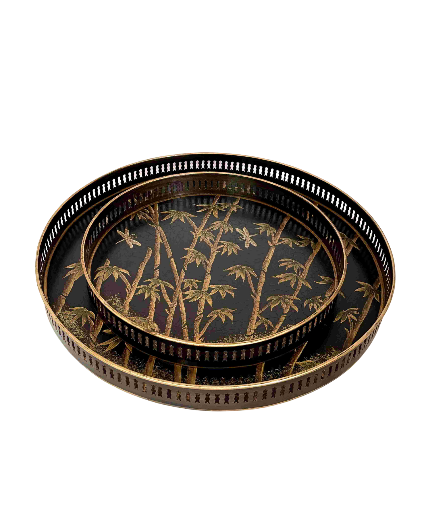 Pack of two round metal trays, large and small. Black background with bamboo illustration and gold details.