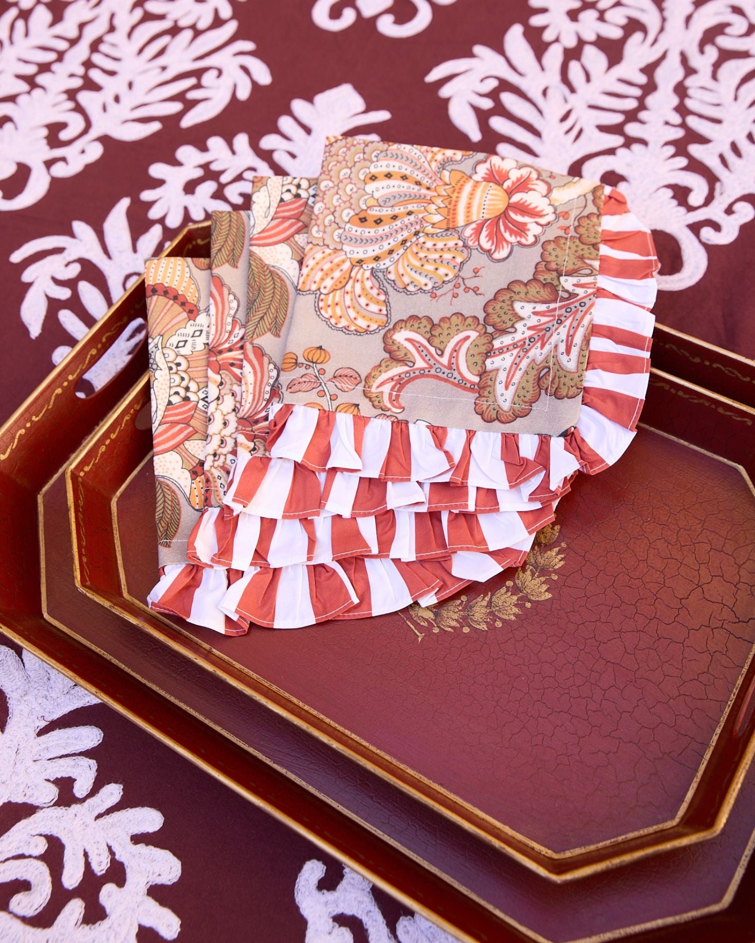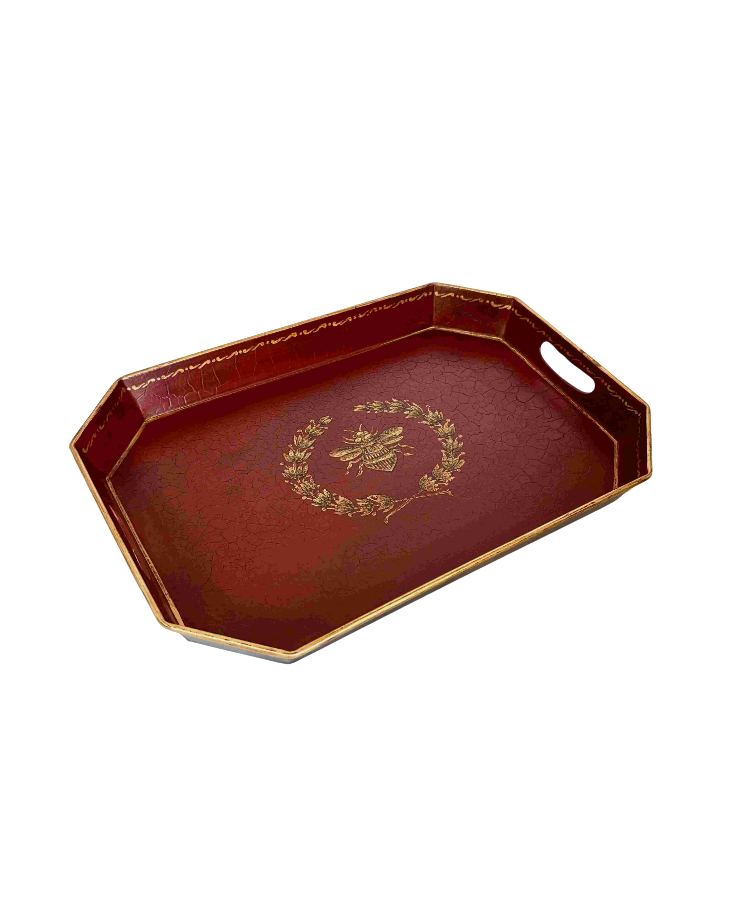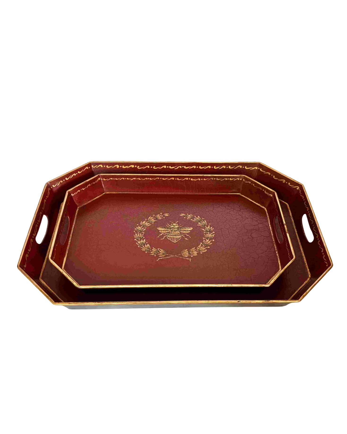 Pack of 2 rectangular metal trays, small and large. Burgundy background with a bee illustration and gold details.