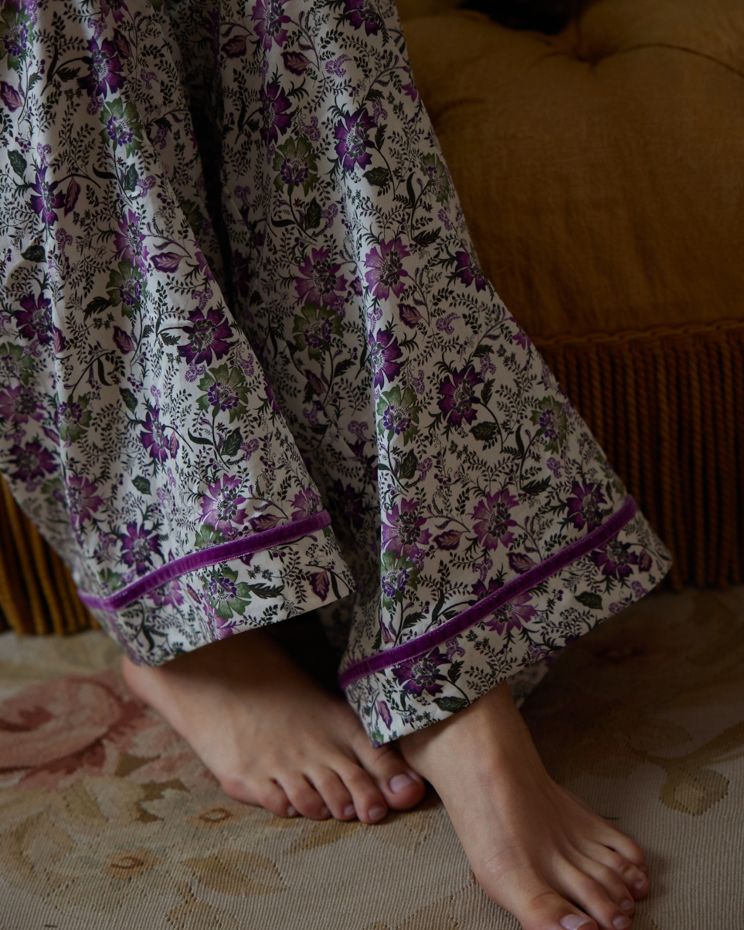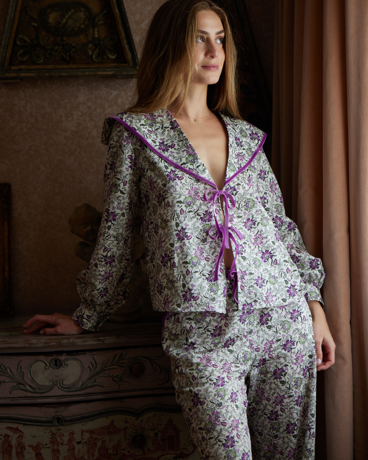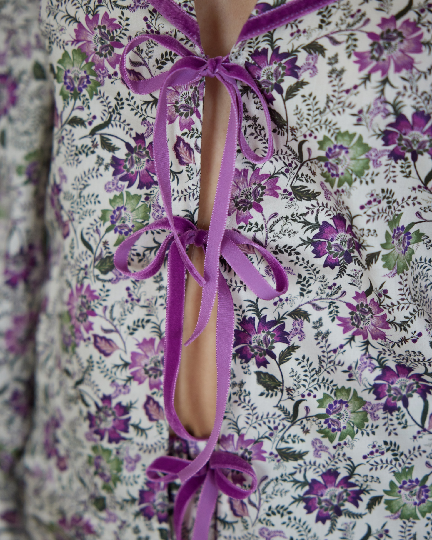 - Floral print pajamas in 100% cotton. Extra-long sailor collar and front tie closure. Long pants with elastic waistband and pockets. Velvet details. Care instructions: Wash at 30°C. Available in sizes S, M, and L.