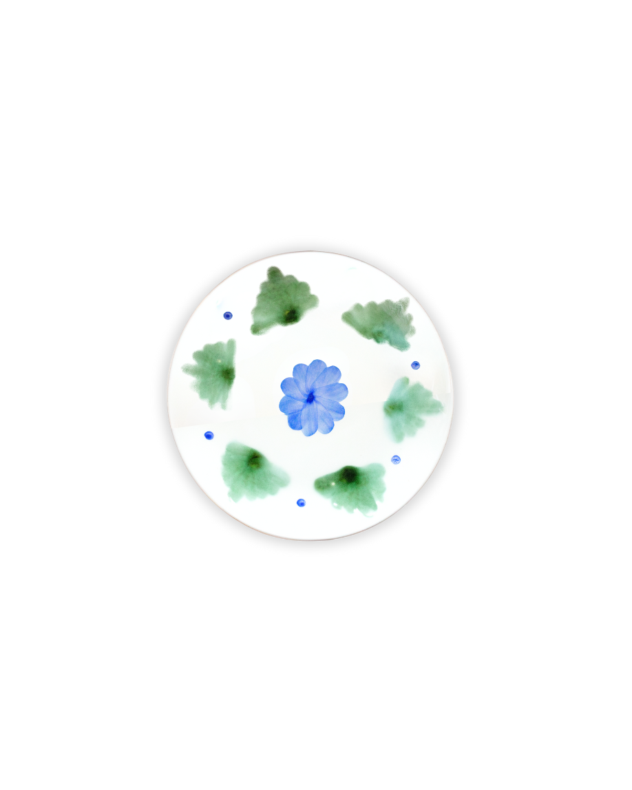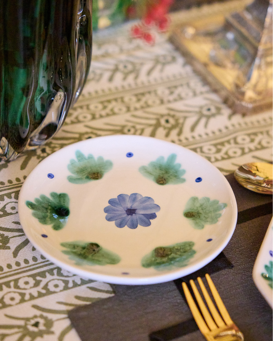 Plato de pan hecho en cerámica pintado a mano en tonos verdes y azules con detalles florales. También disponible en color terracota.