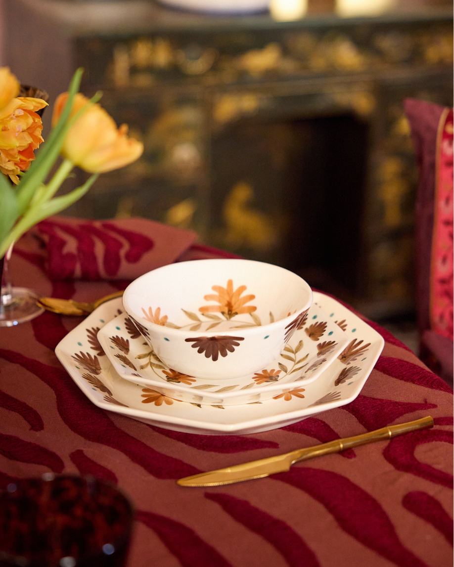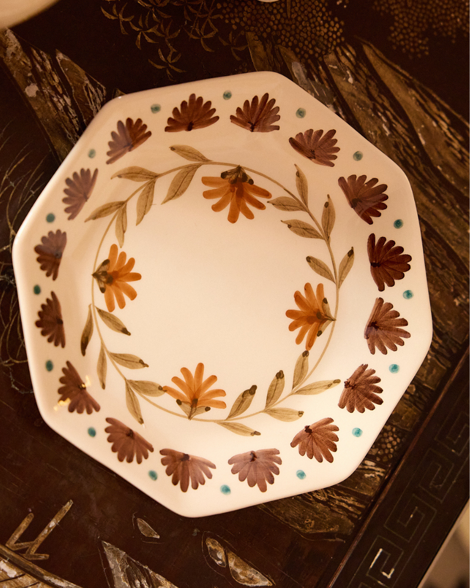 Plato de postre octogonal hecho en cerámica pintado a mano en tonos terracota y marrón con detalles florales. También disponible en tonos verdes y azules.