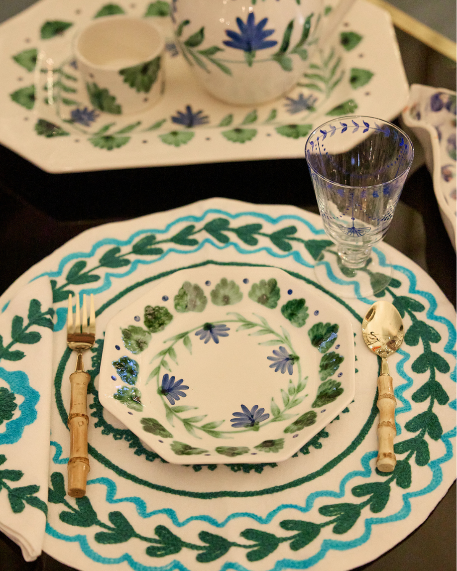 Plato de postre octogonal hecho en cerámica pintado a mano en tonos verdes y azules con detalles florales. También disponible en color terracota.