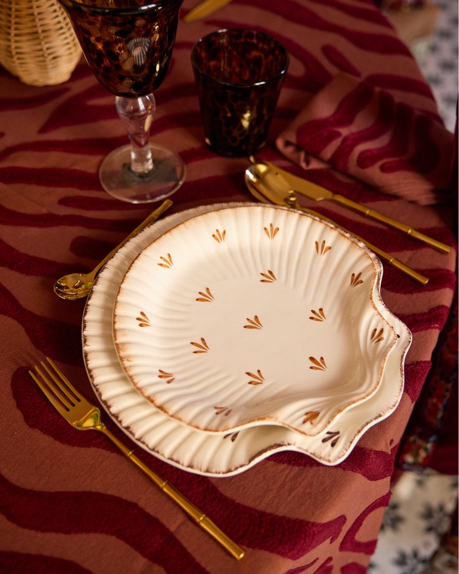 Plato de postre con forma de concha hecho en cerámica con detalles pintados a mano en color terracota.