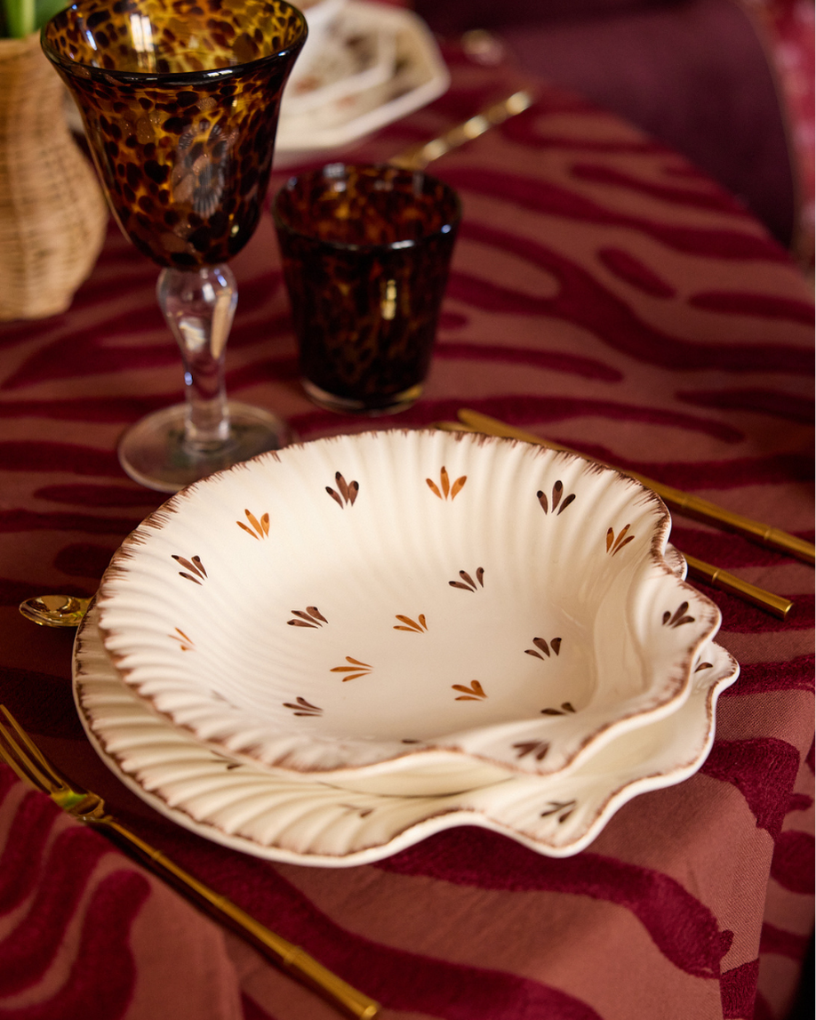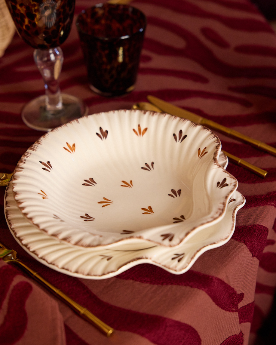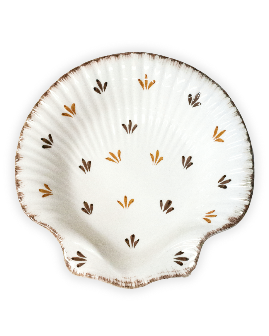 Plato hondo con forma de concha hecho en cerámica con detalles pintados a mano en color terracota y marrón.