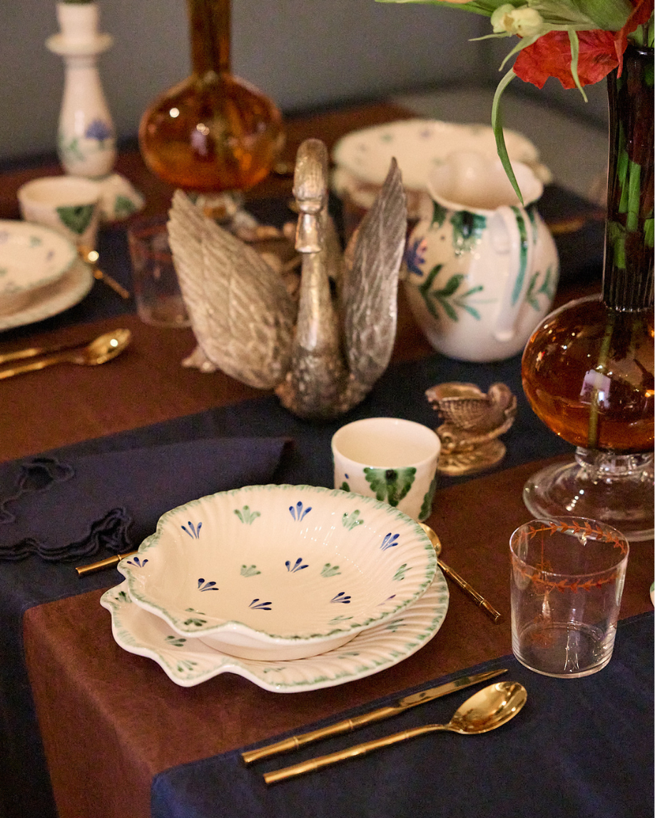 Plato de llano con forma de concha hecho en cerámica con detalles pintados a mano en color verde.