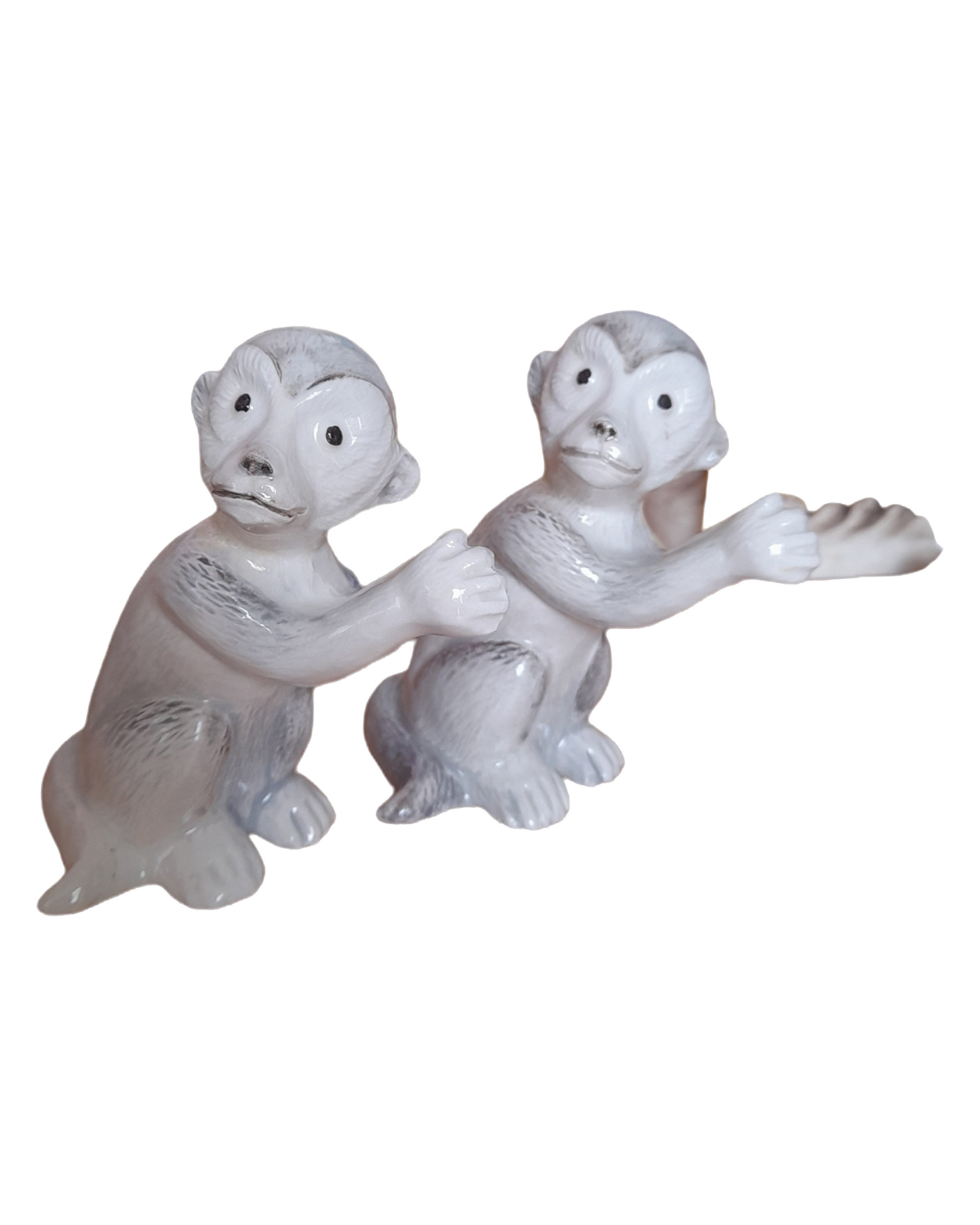 Salt and pepper shakers in the shape of monkeys made of ceramic and hand painted in white and brown.