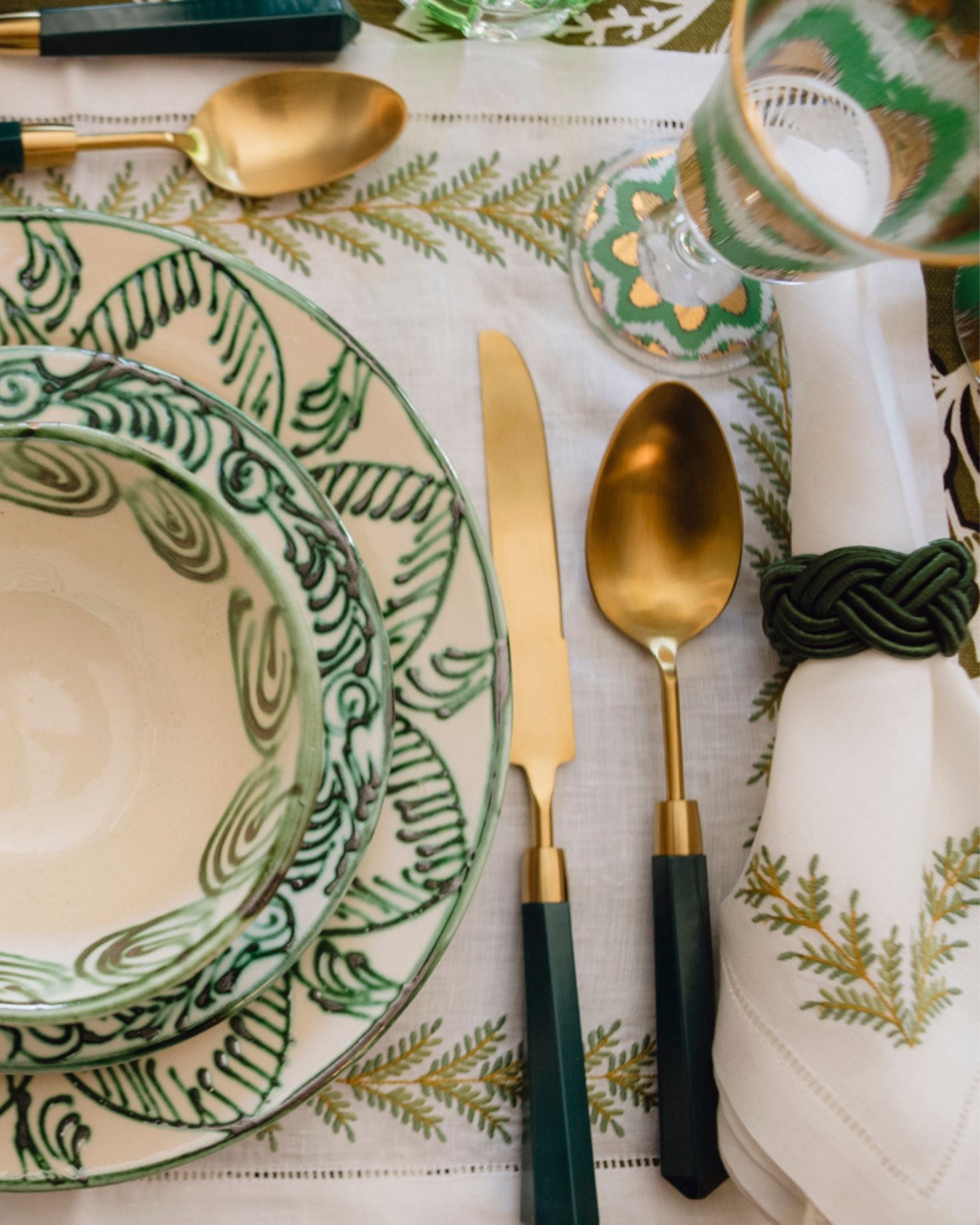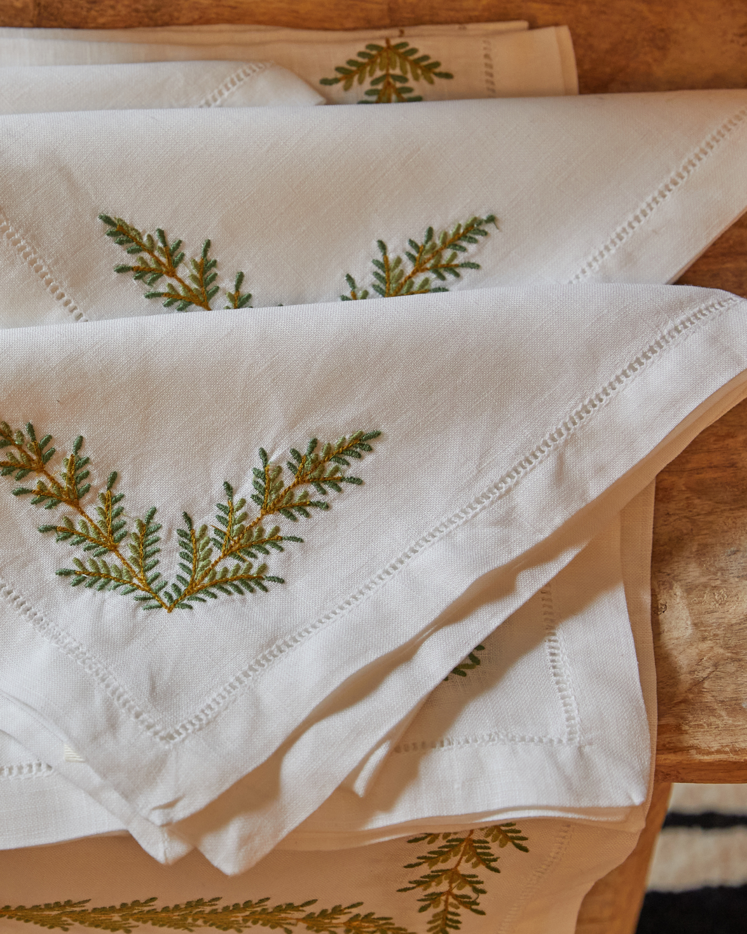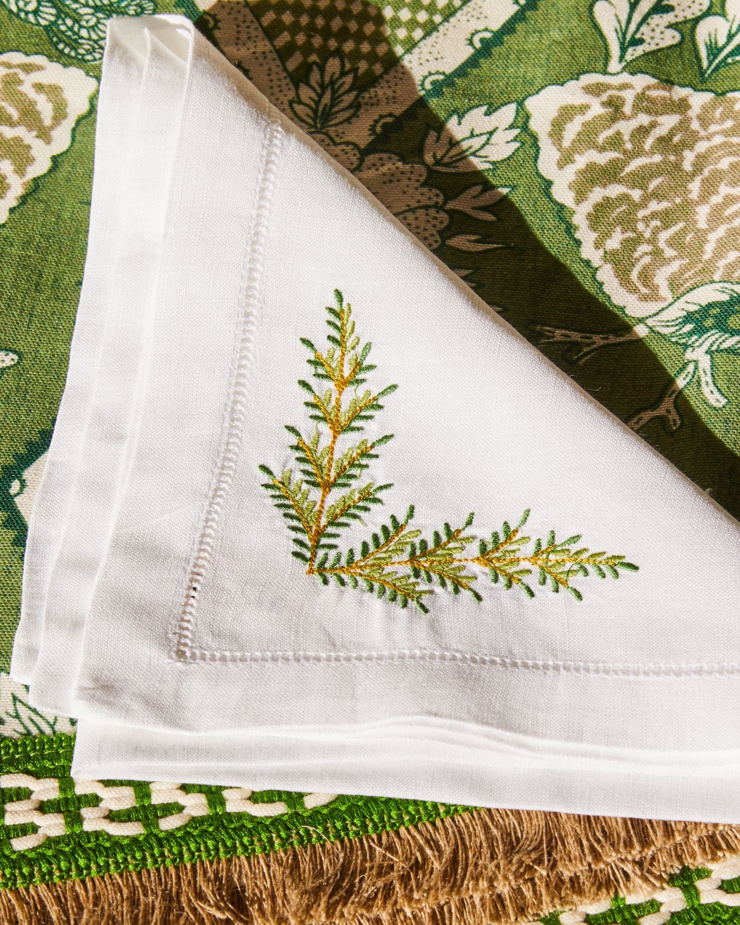 INDIVIDUAL AND LINEN NAPKIN WITH GREEN BRANCH EMBROIDERY