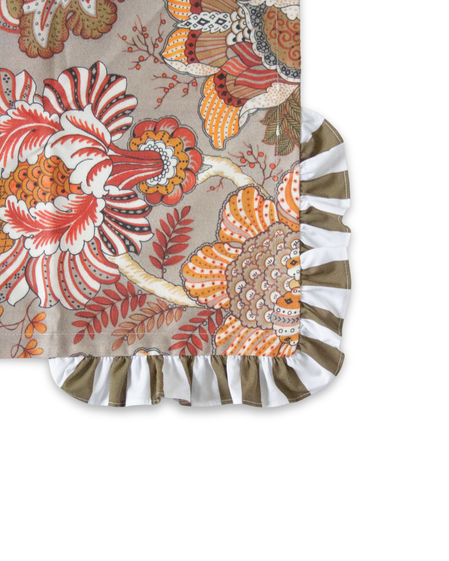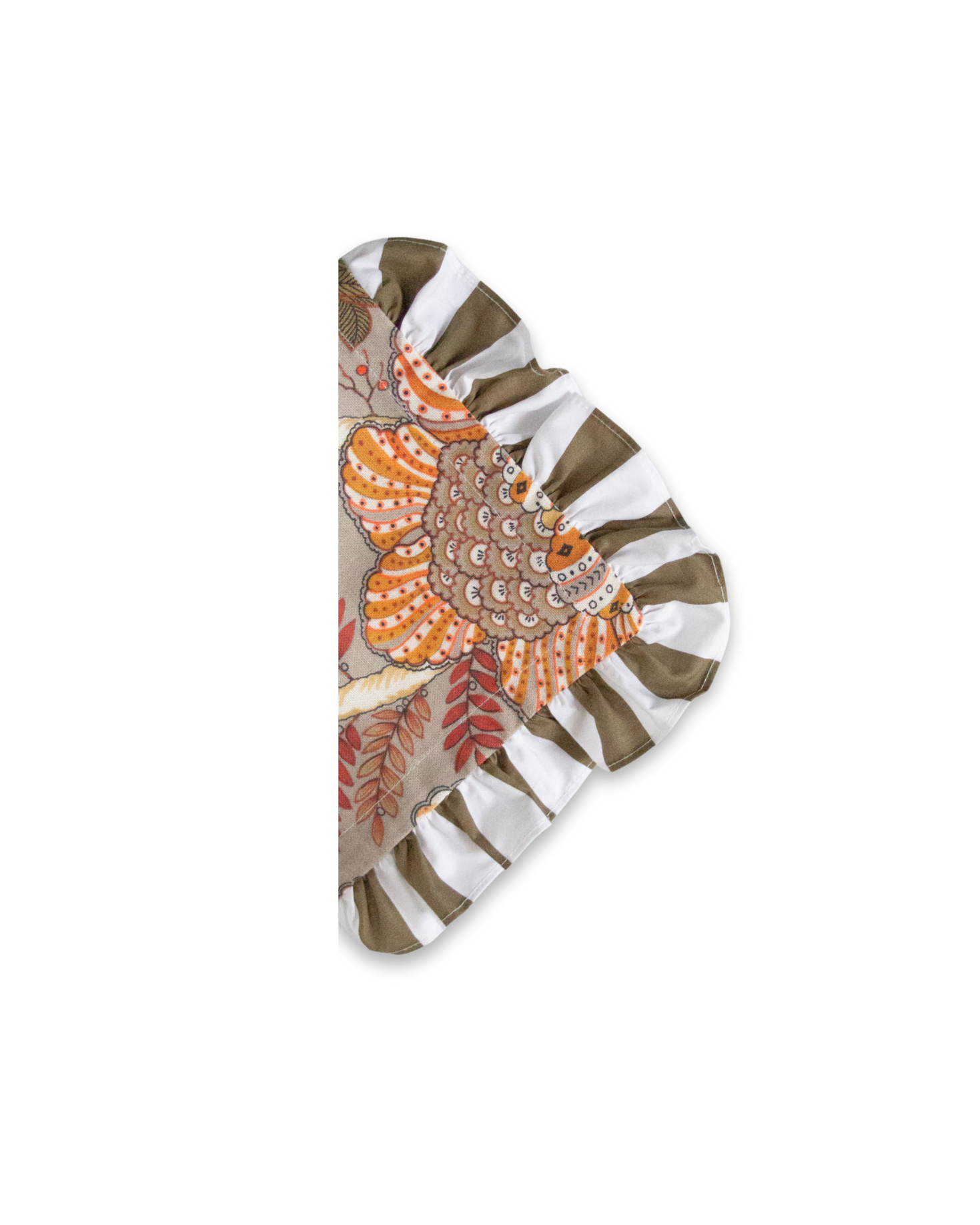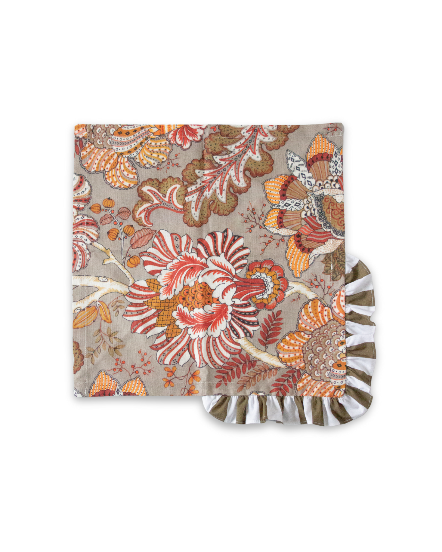 Gray and teal square napkin made from 100% cotton with a floral print. Ruffle detail with a white and green striped print. Also available in teal stripes.