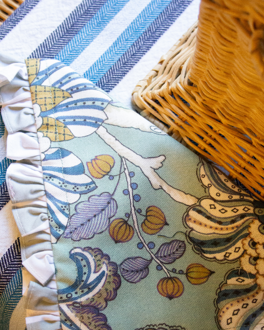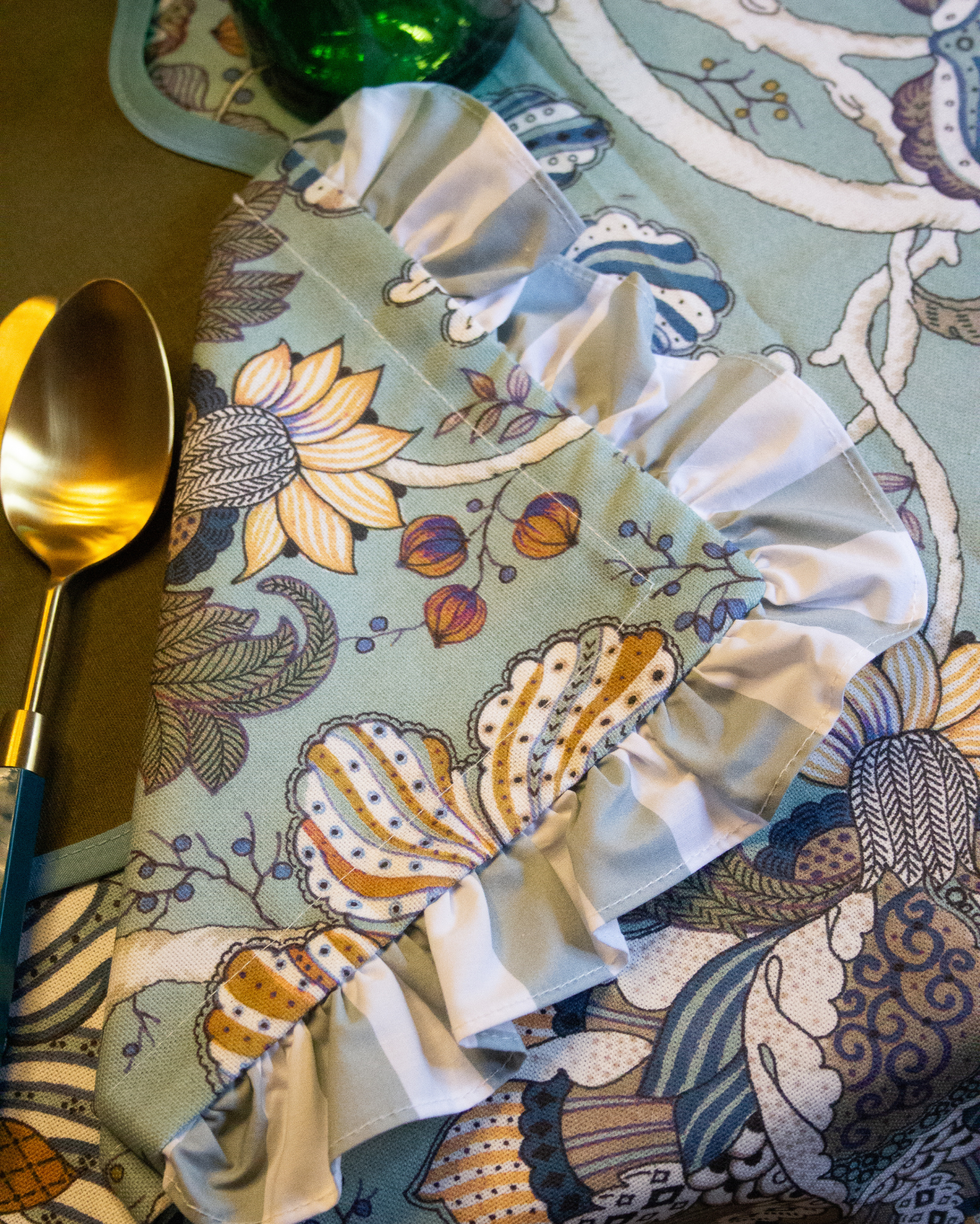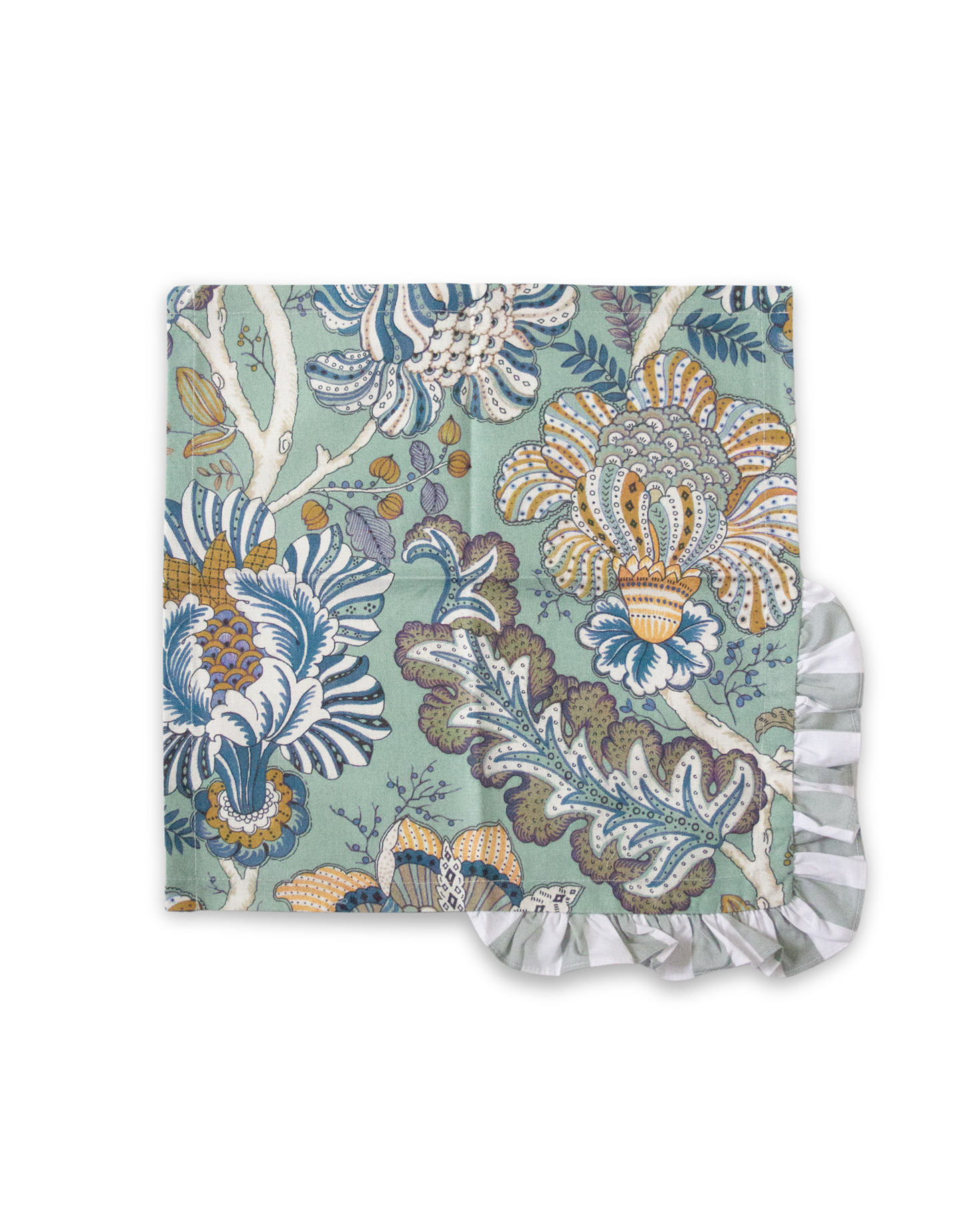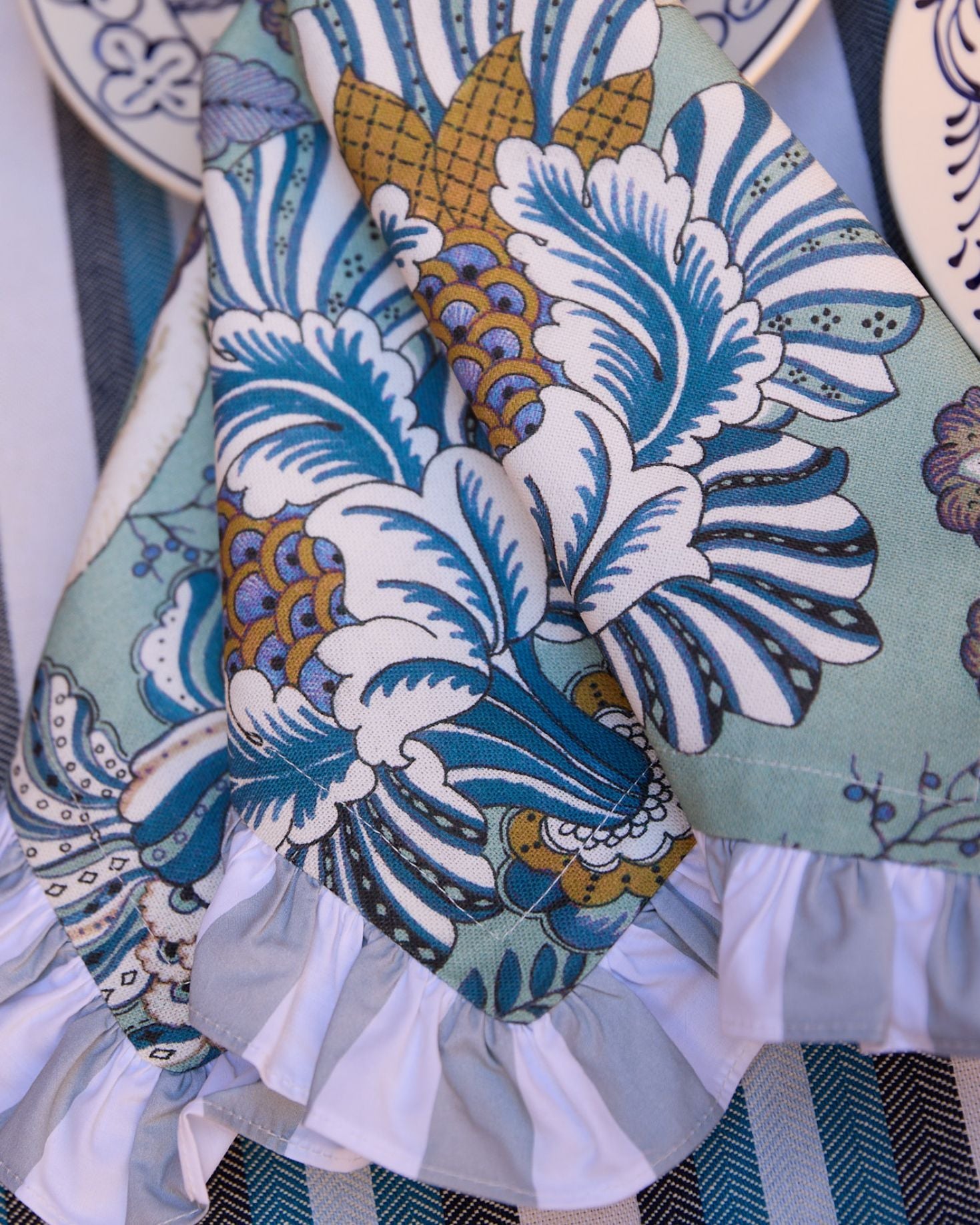 Blue square napkin made of 100% cotton with a floral print. Ruffle detail with a blue and white striped pattern. Also available in yellow stripes.
