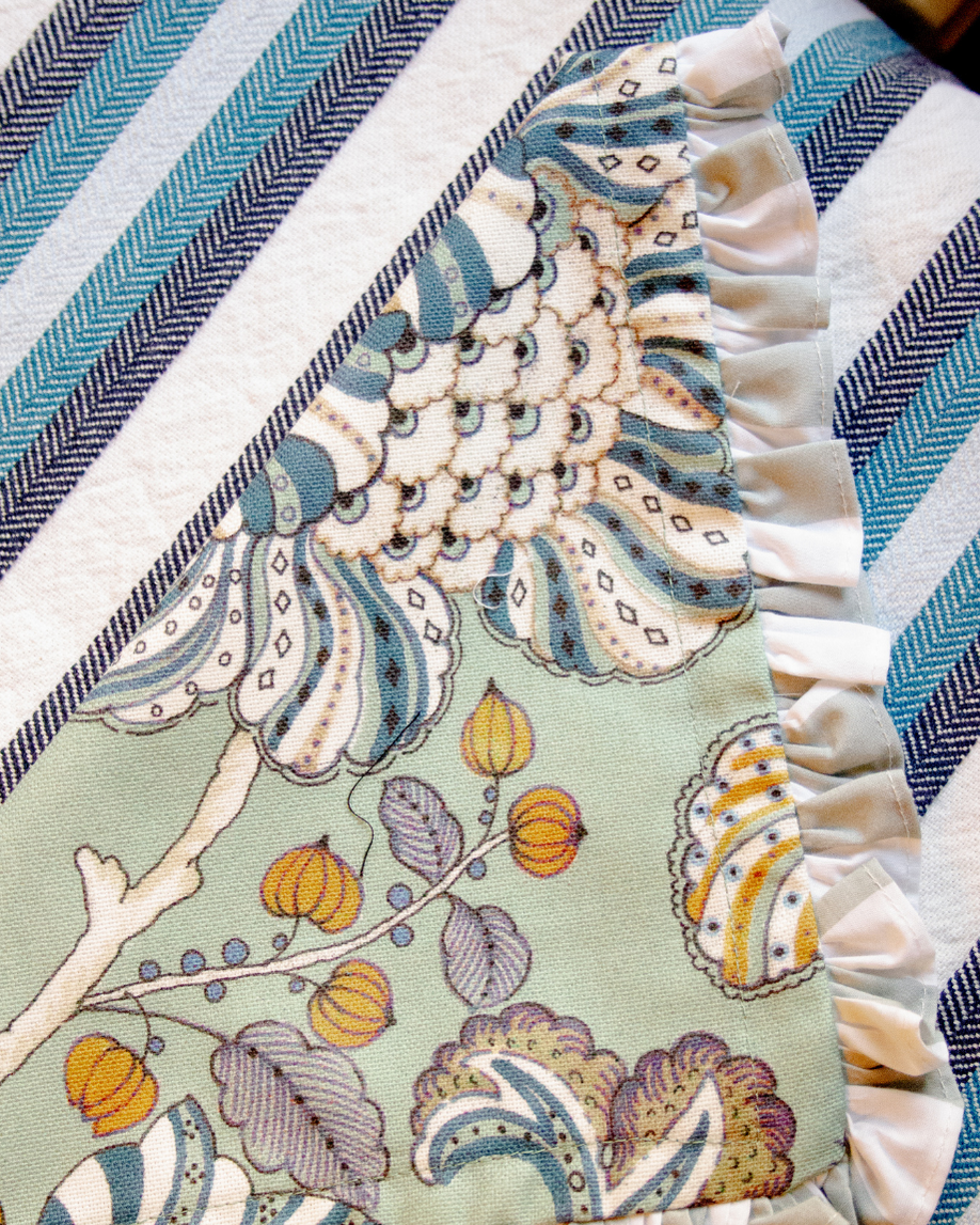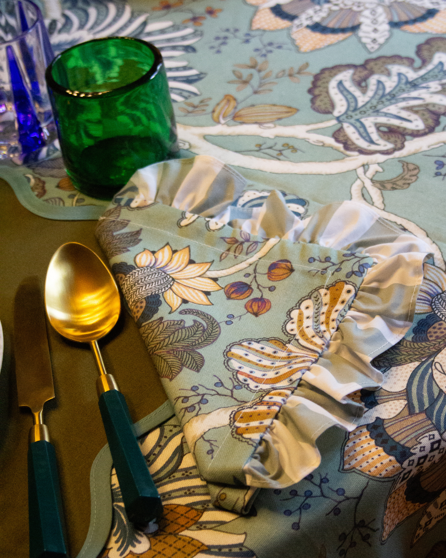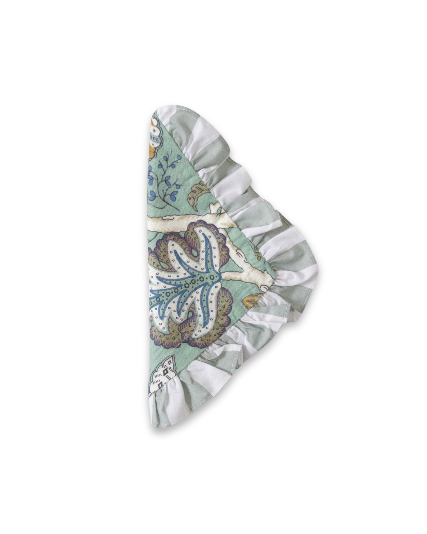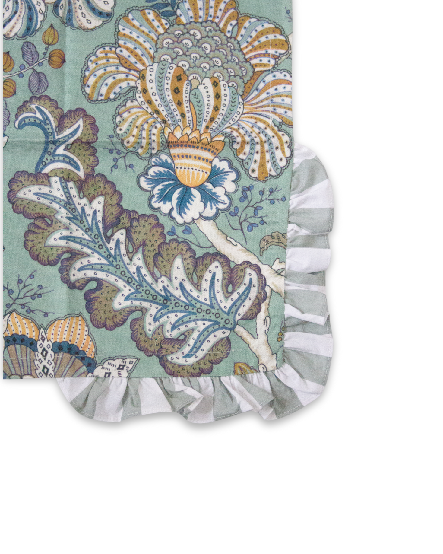 Blue square napkin made of 100% cotton with a floral print. Ruffle detail with a blue and white striped pattern. Also available in yellow stripes.