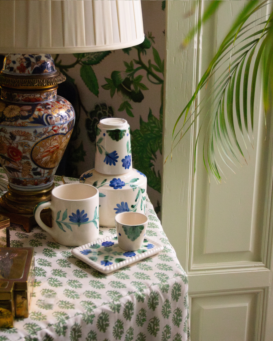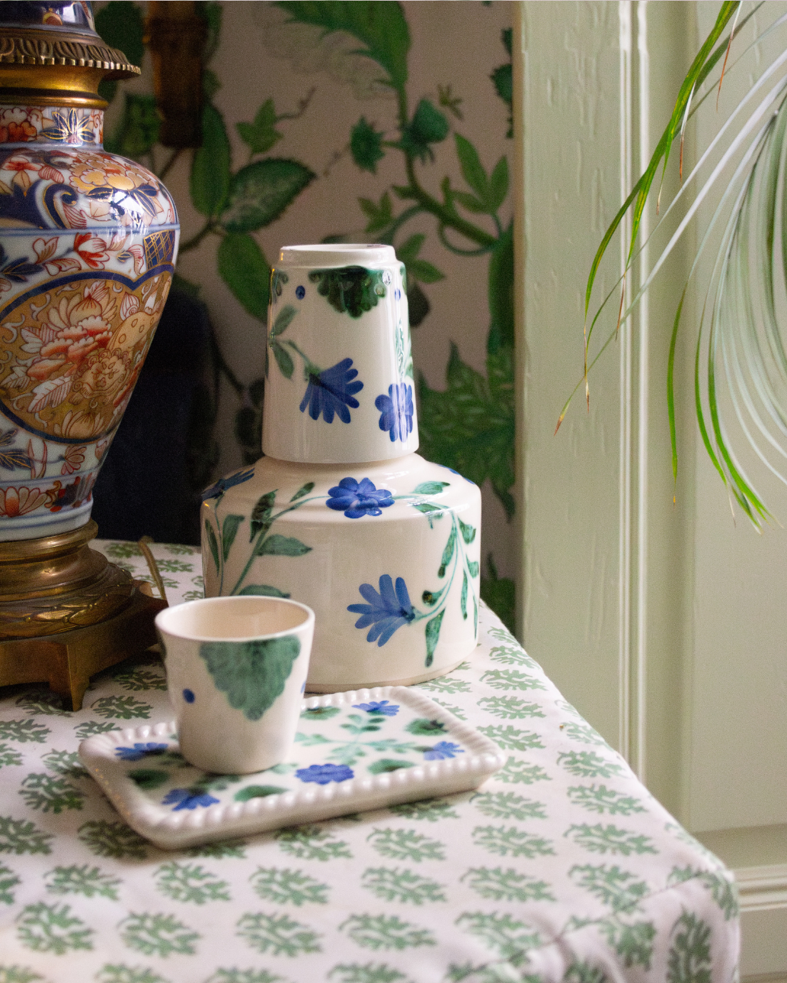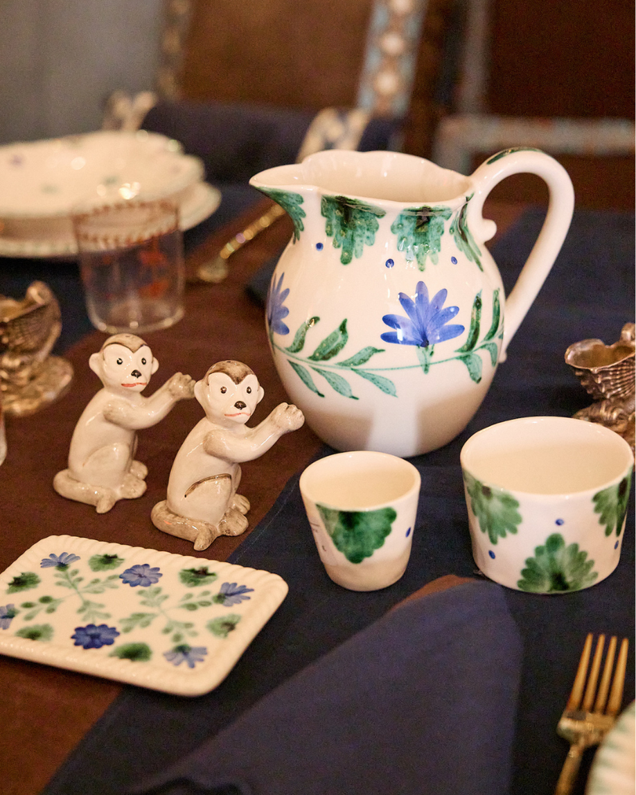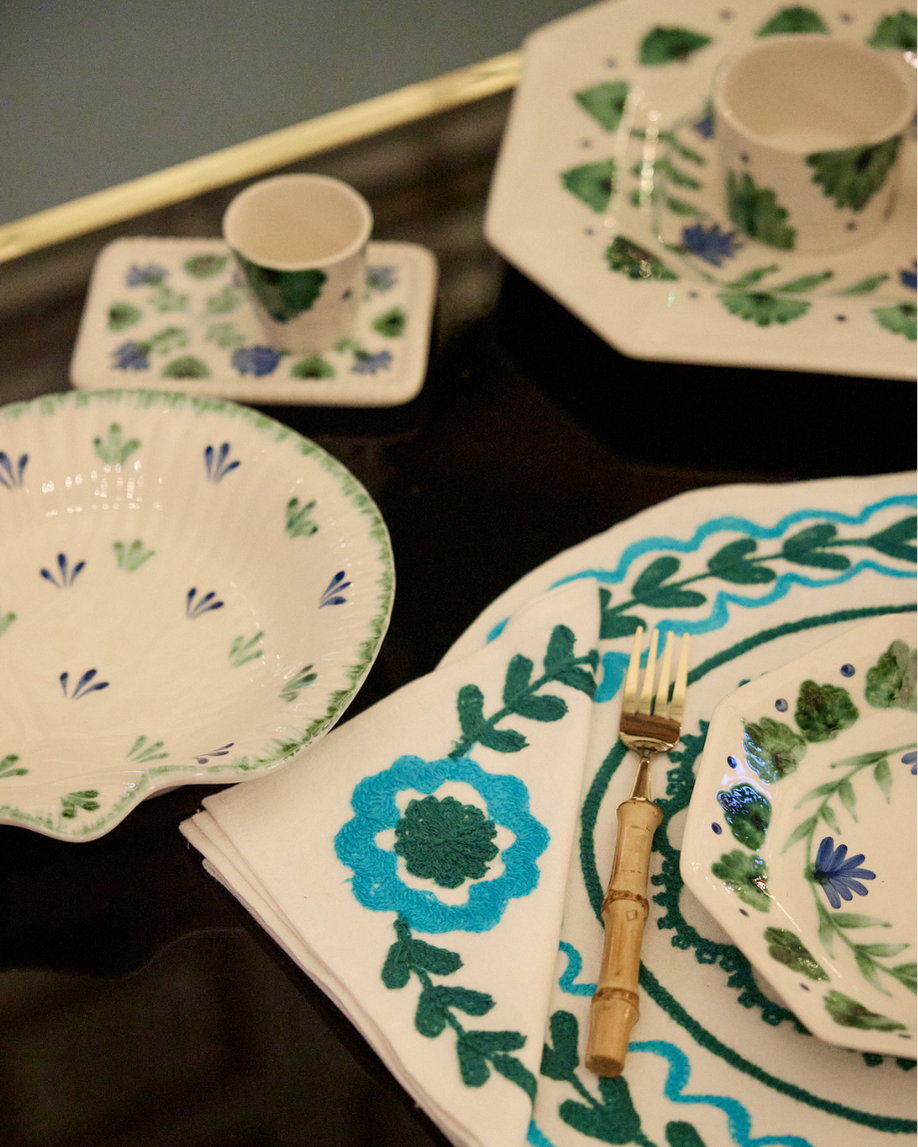 Taza espresso hecha en cerámica pintada a mano en tonos verdes y azules con detalles florales. También disponible en color terracota.