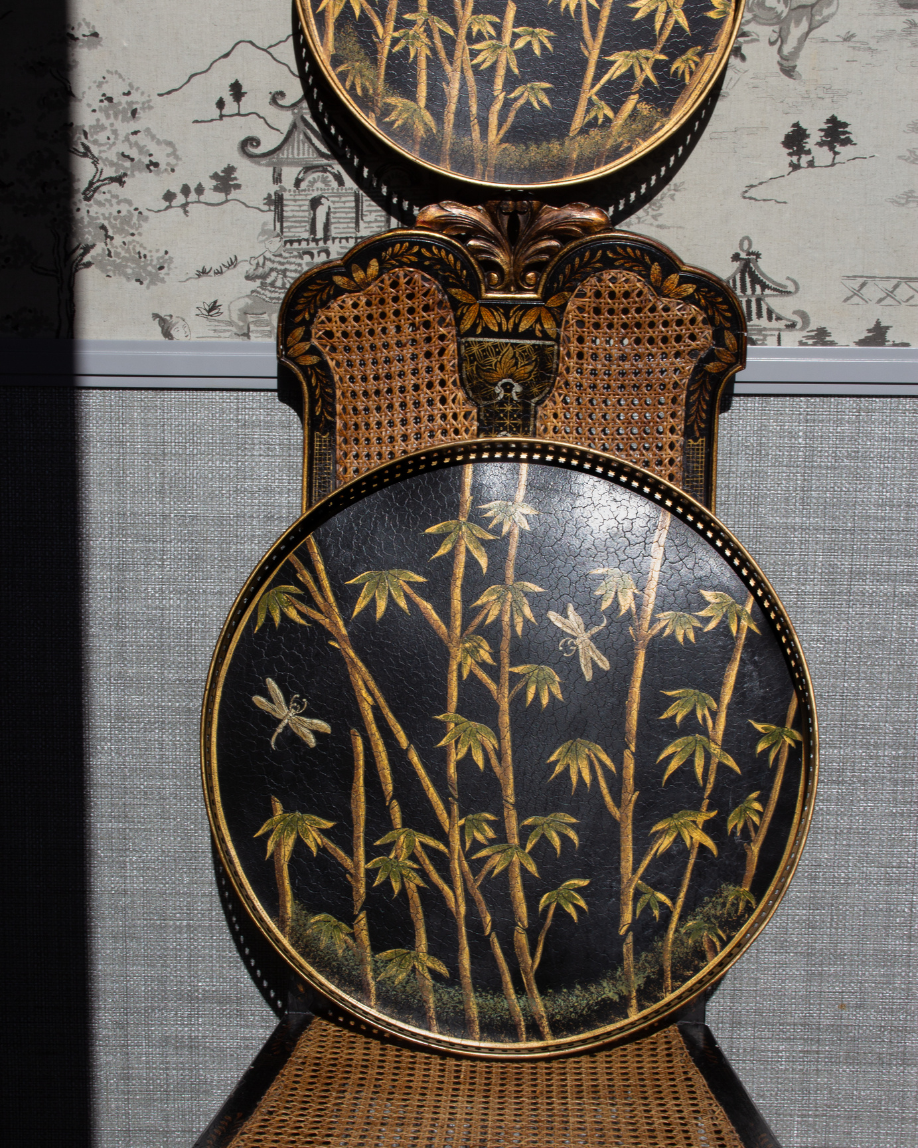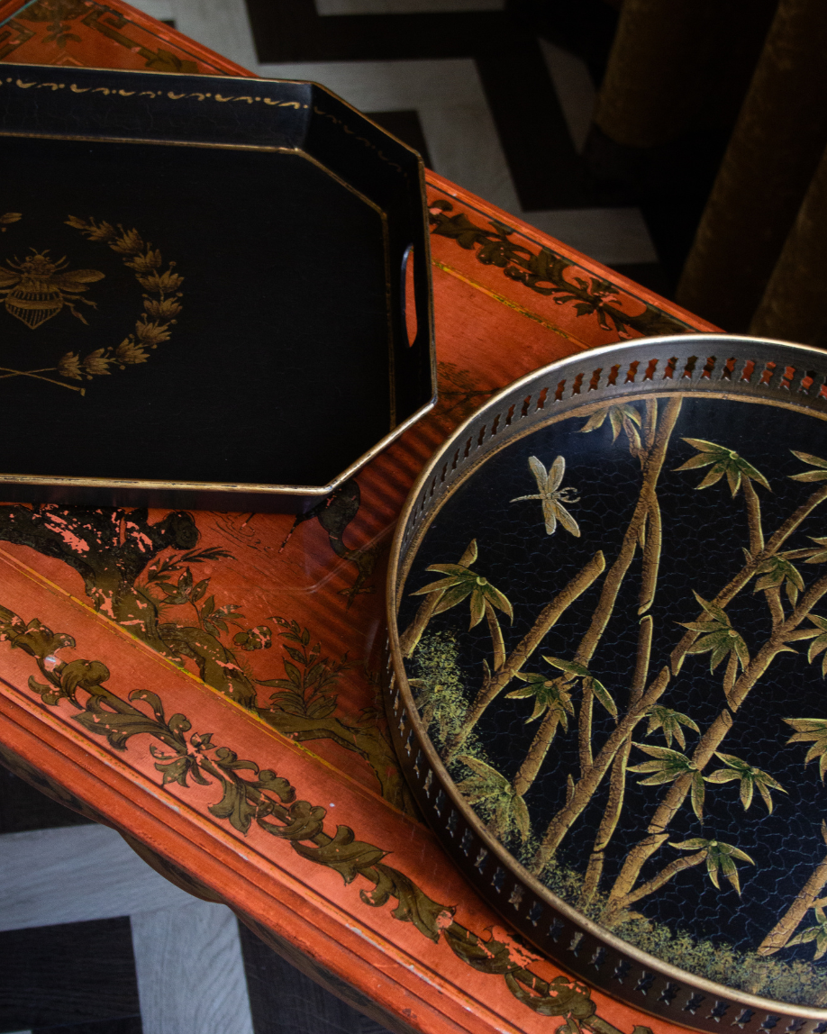 Bandeja redonda metálica, tamaño grande. Fondo en color negro con ilustración de bambú y detalles en color dorado.