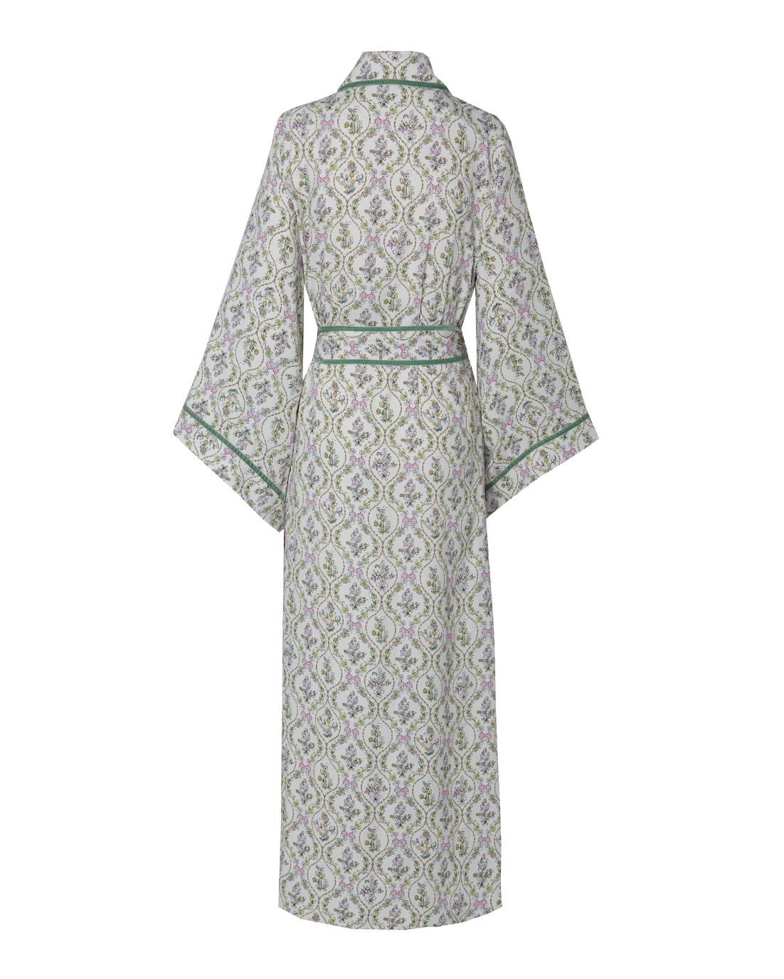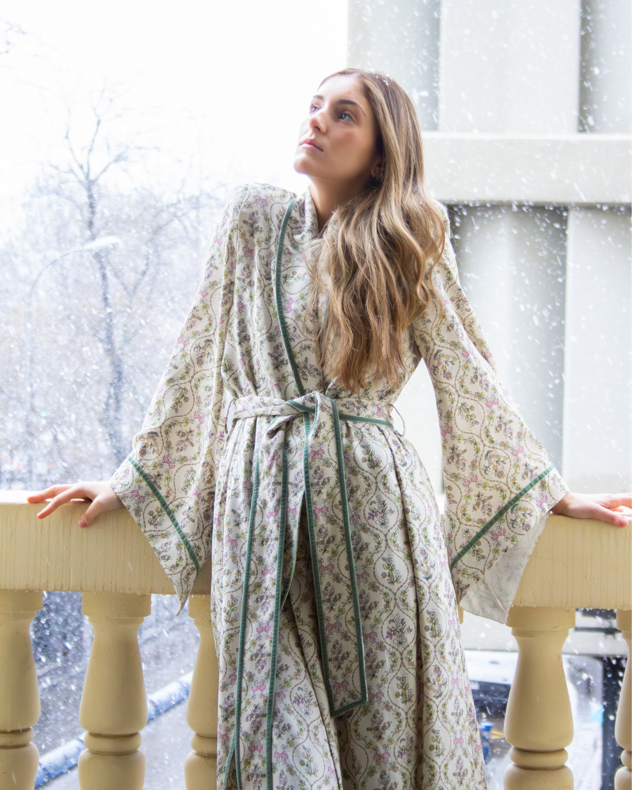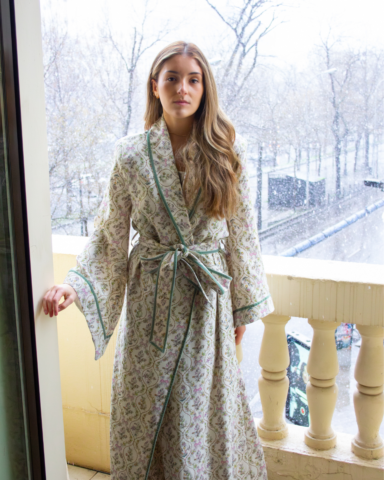 Bata larga con estampado floral en tonos verde y rosas. Manga larga acampanada con hombreras y detalle de terciopelo verde. Cierre delantero con solapas, cruce con cinturón y contraste de terciopelo.