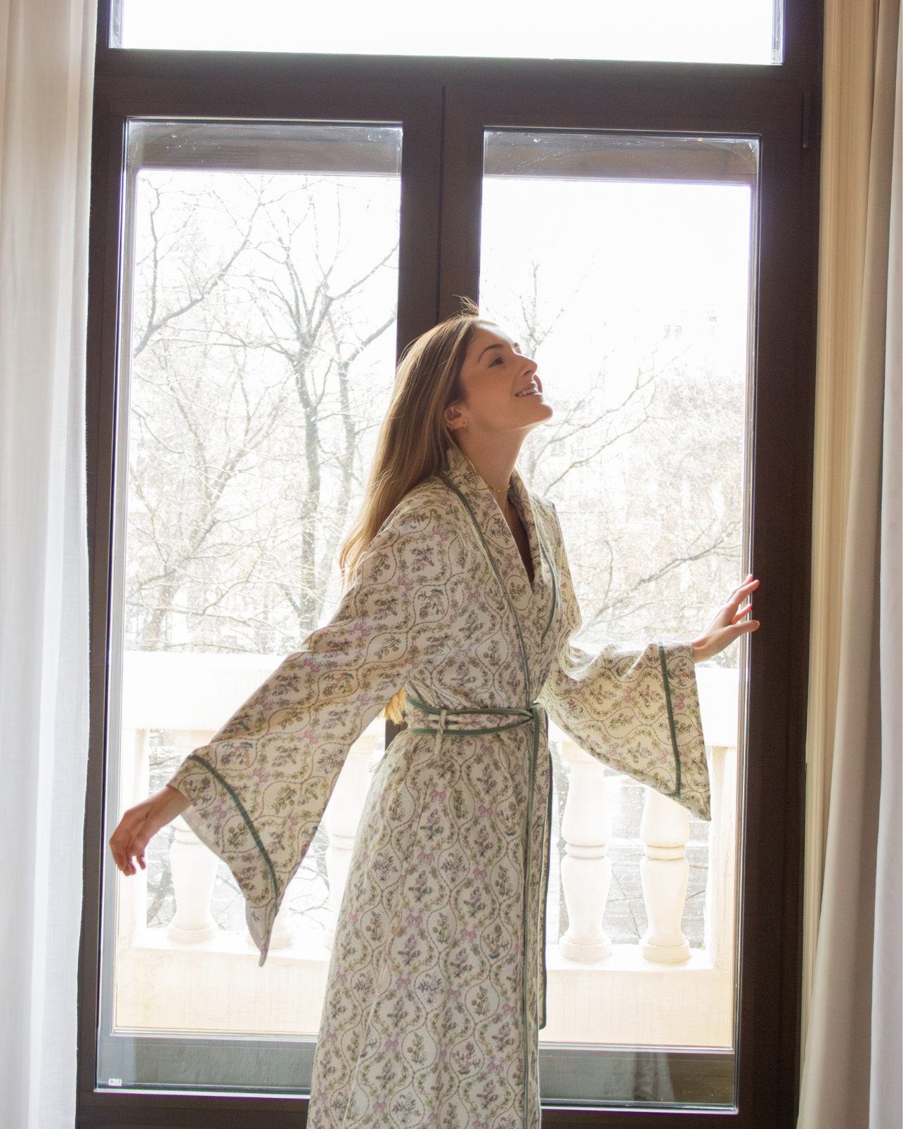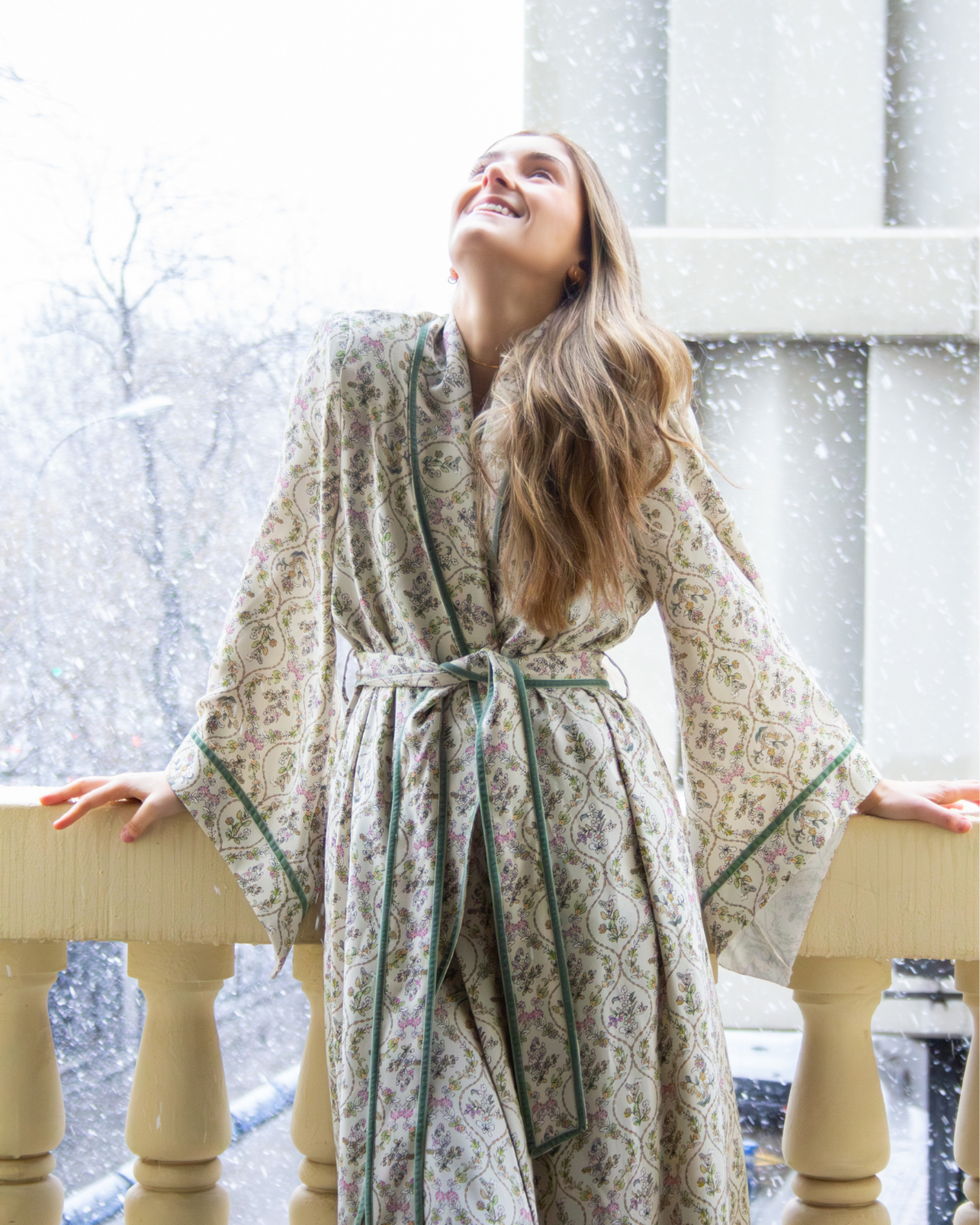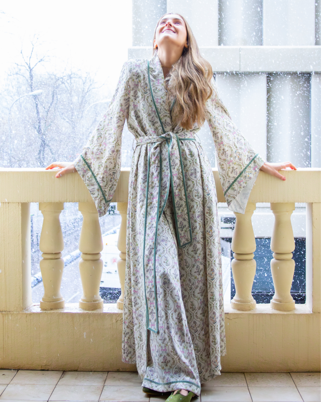 Bata larga con estampado floral en tonos verde y rosas. Manga larga acampanada con hombreras y detalle de terciopelo verde. Cierre delantero con solapas, cruce con cinturón y contraste de terciopelo.