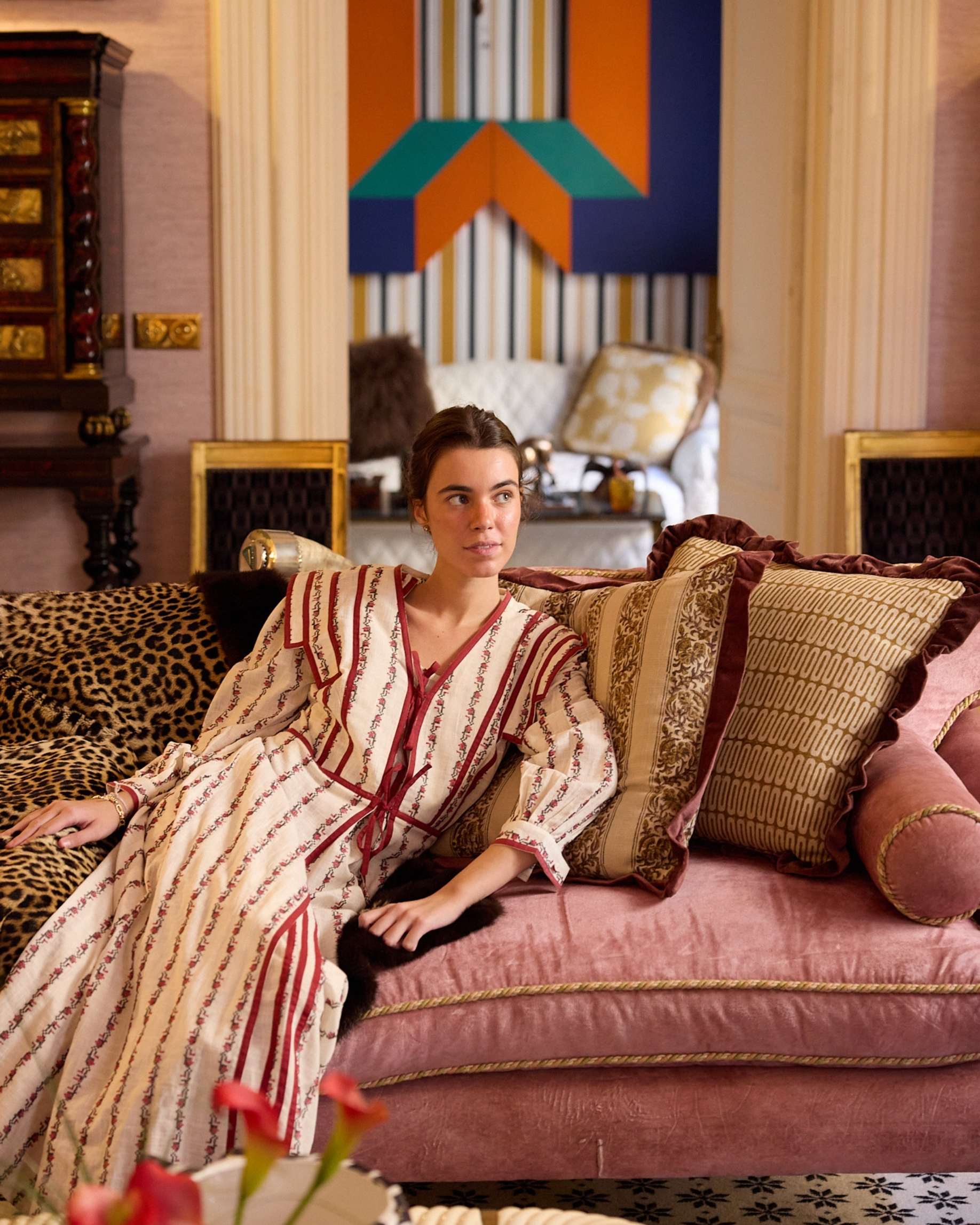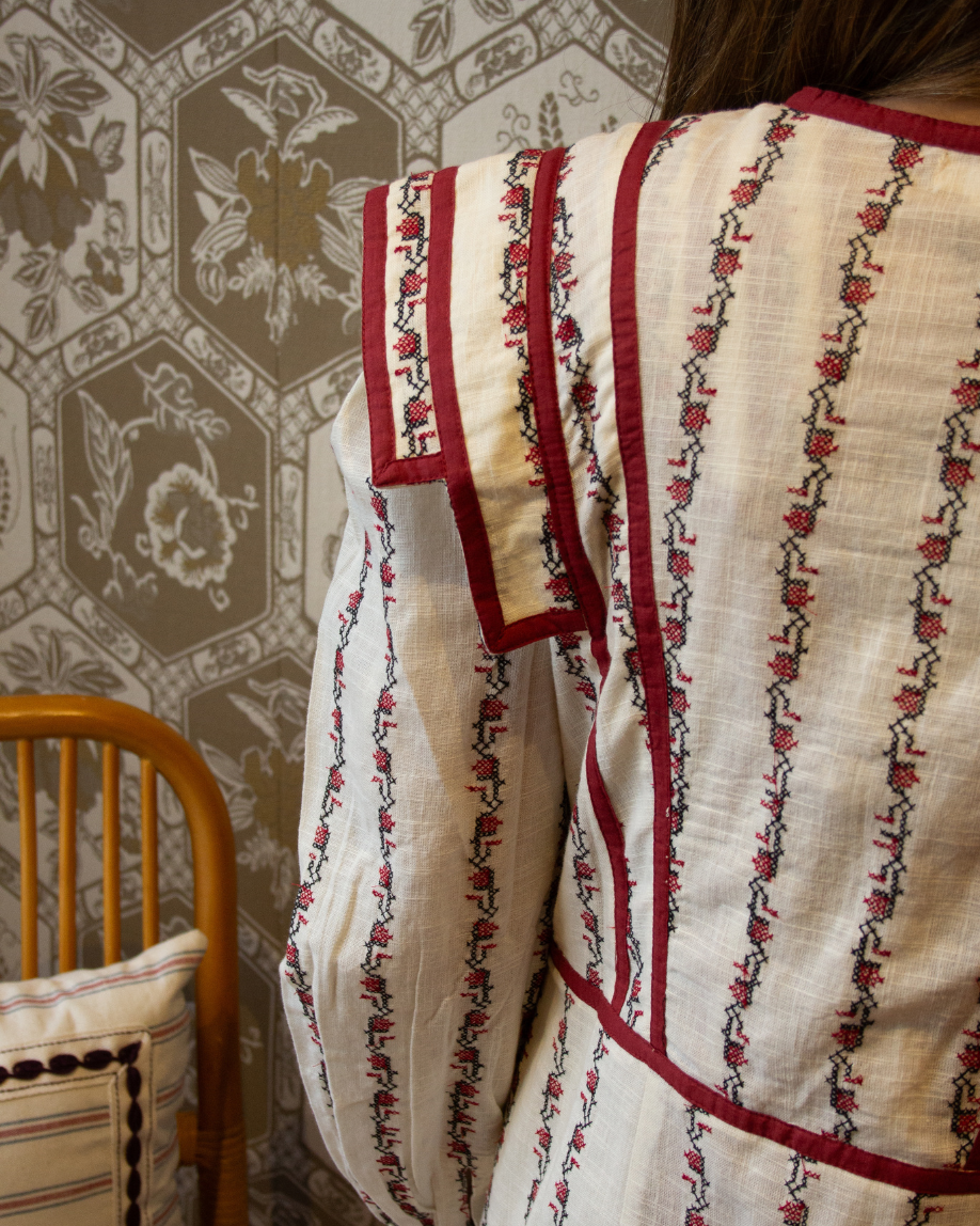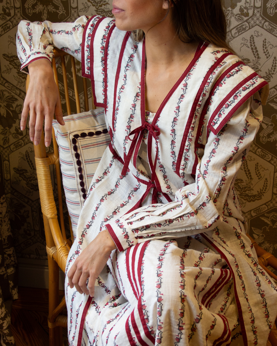 Bata con bordado a mano de punto de cruz floral en algodón 100%. Diseño de hombro estilo IQ, manga larga y cierre delantero con lazos. Detalles en cinta de color burdeos y largo tobillero.