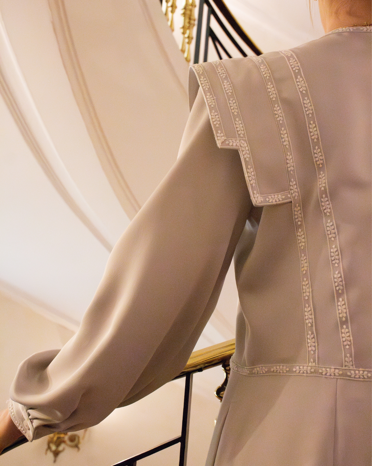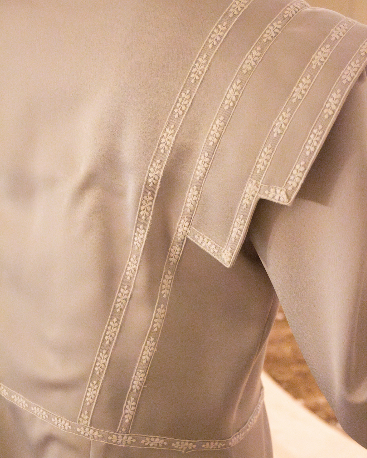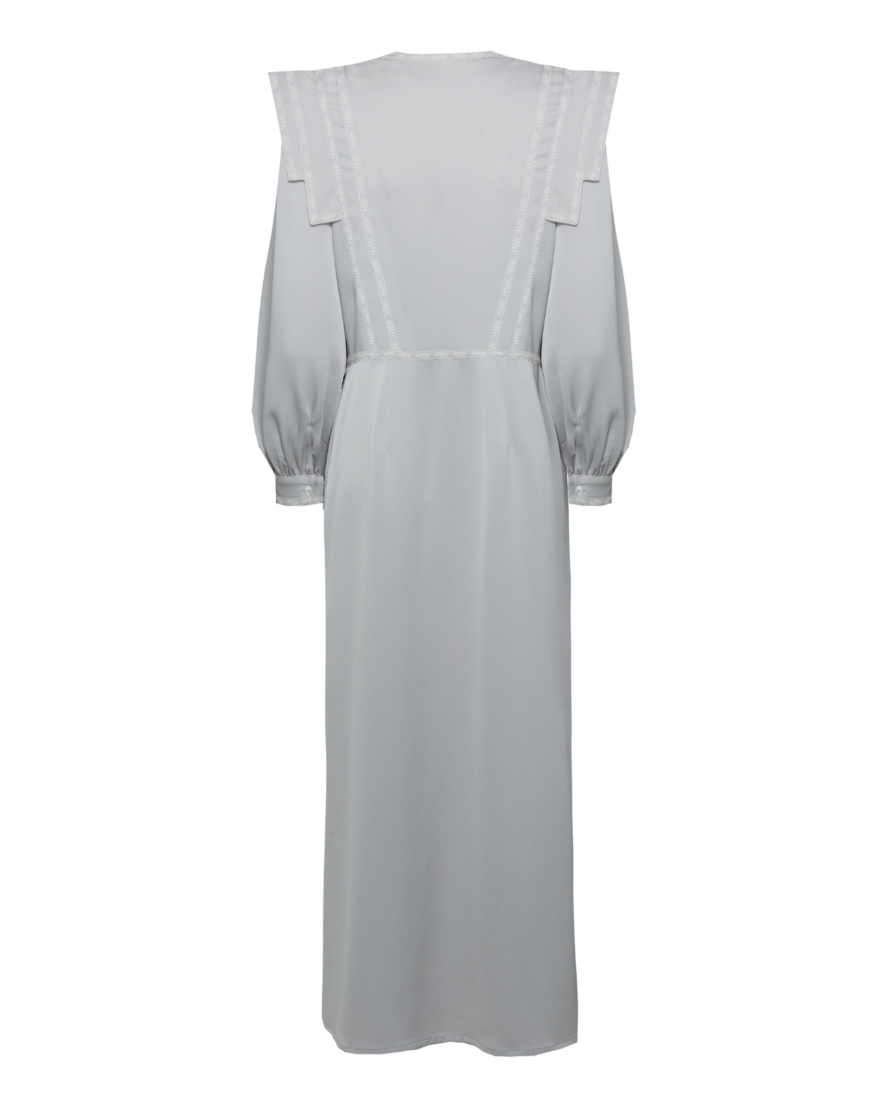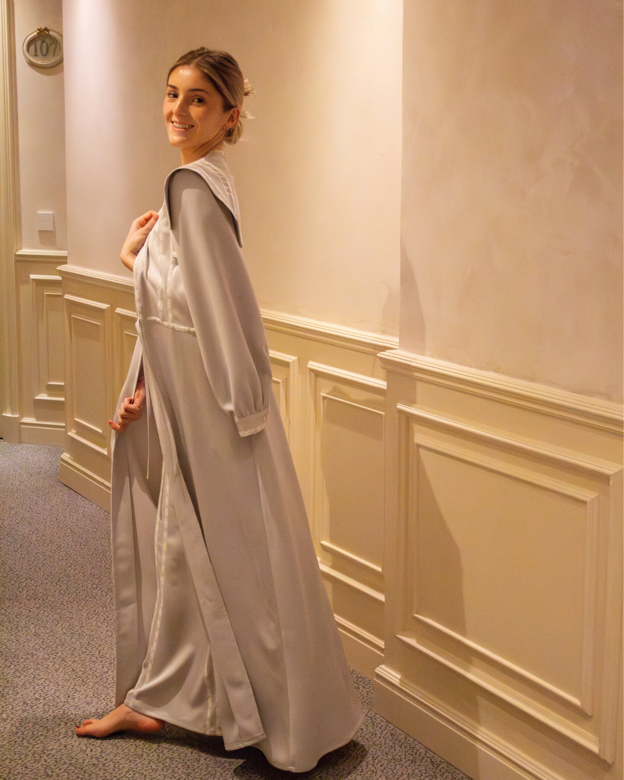 Bata Castillo en color gris perfecta para novias. Diseño de hombro estilo IQ, manga larga y cierre delantero con lazos. Detalles en cinta bordada blanca y largo tobillero.