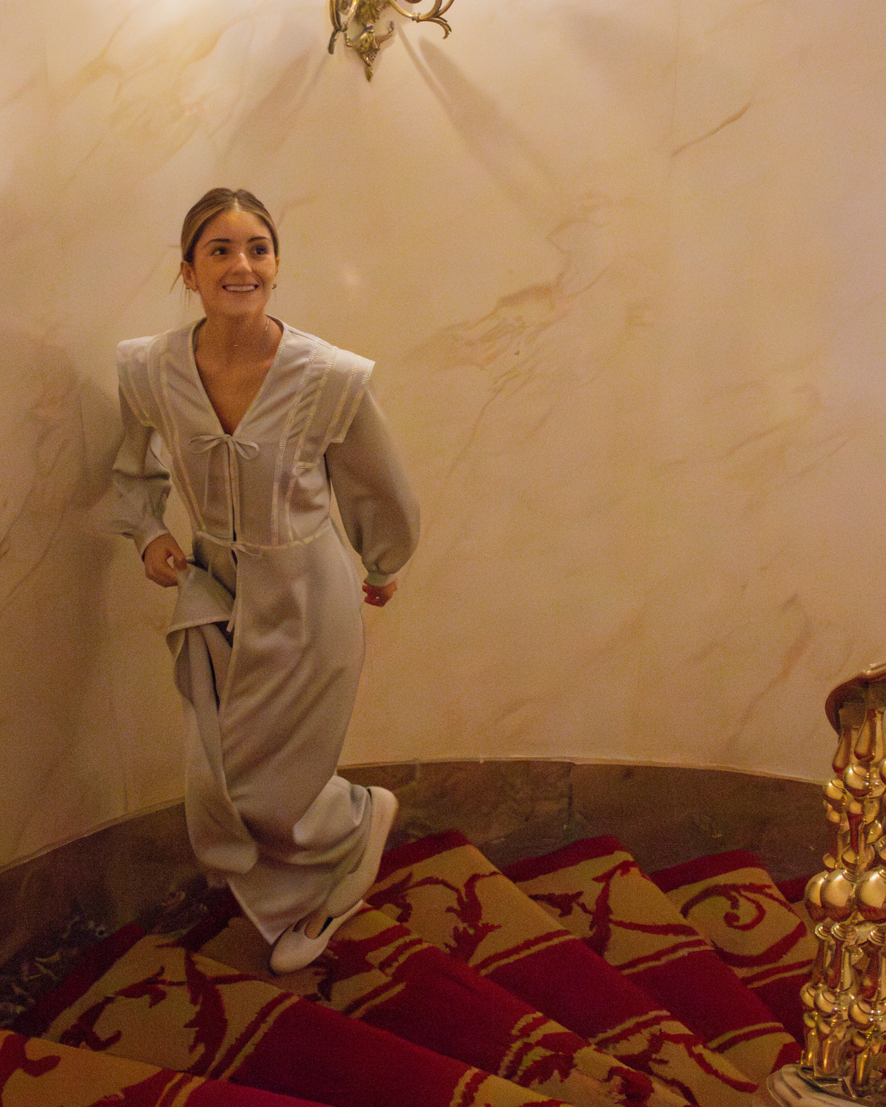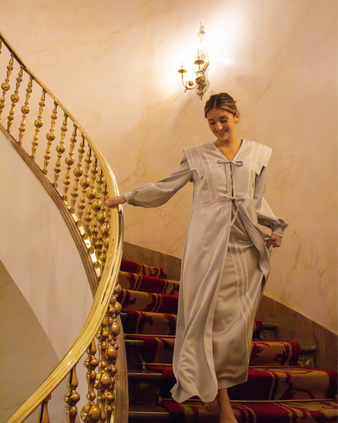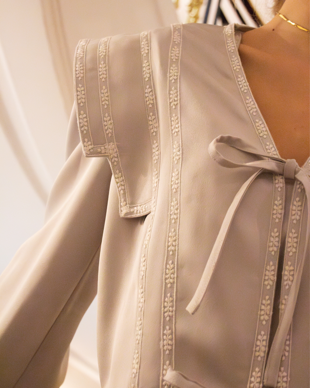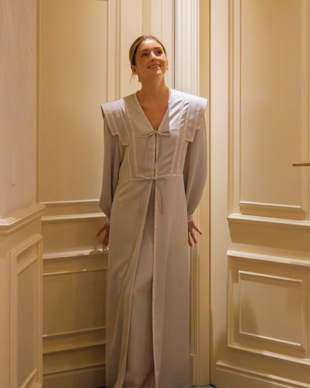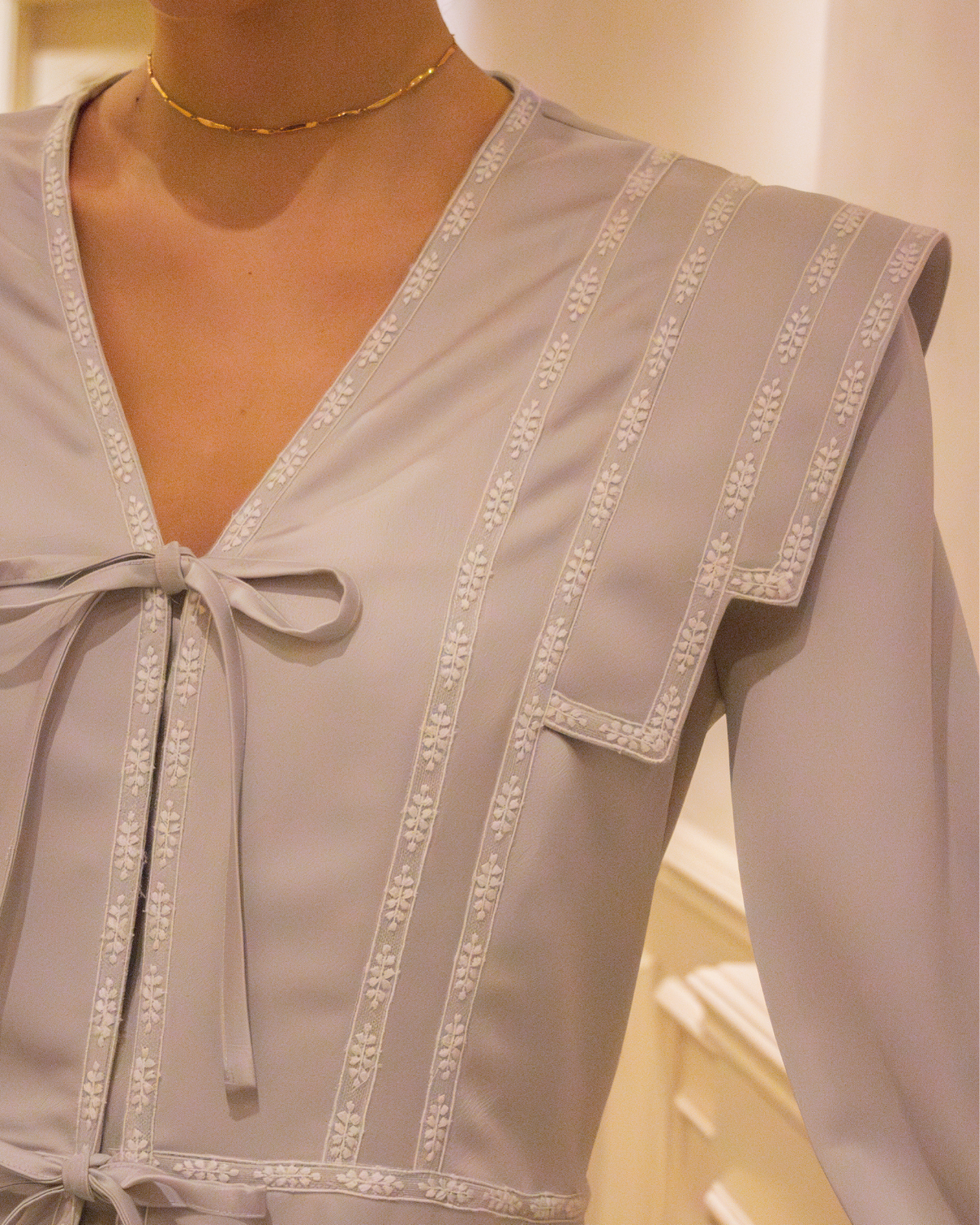 Bata Castillo en color gris perfecta para novias. Diseño de hombro estilo IQ, manga larga y cierre delantero con lazos. Detalles en cinta bordada blanca y largo tobillero.