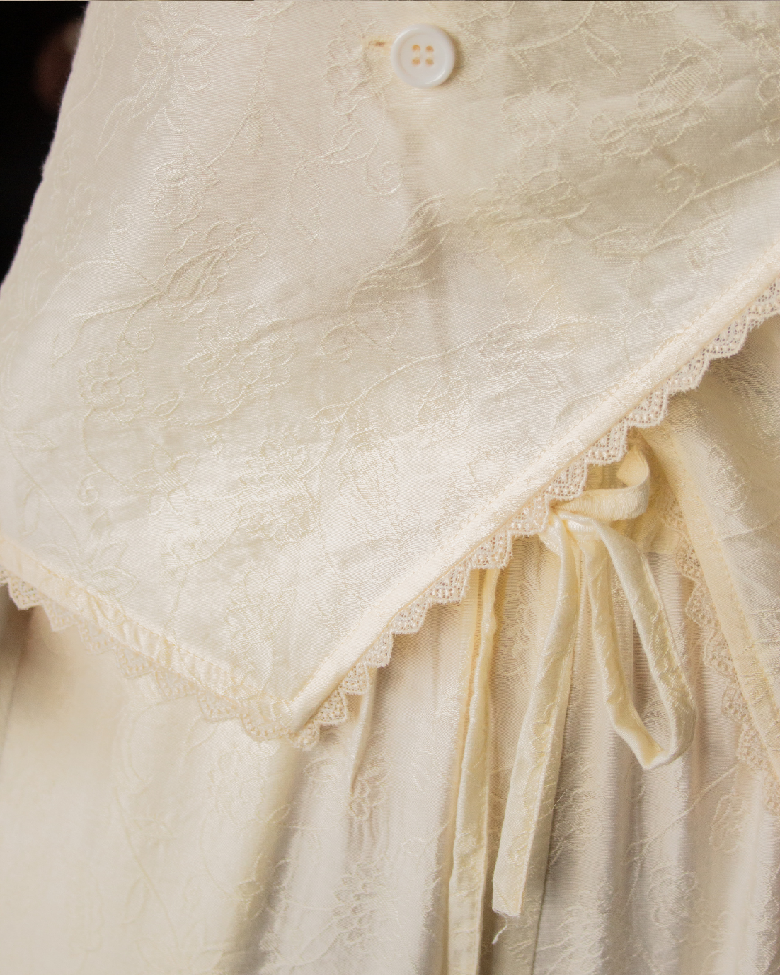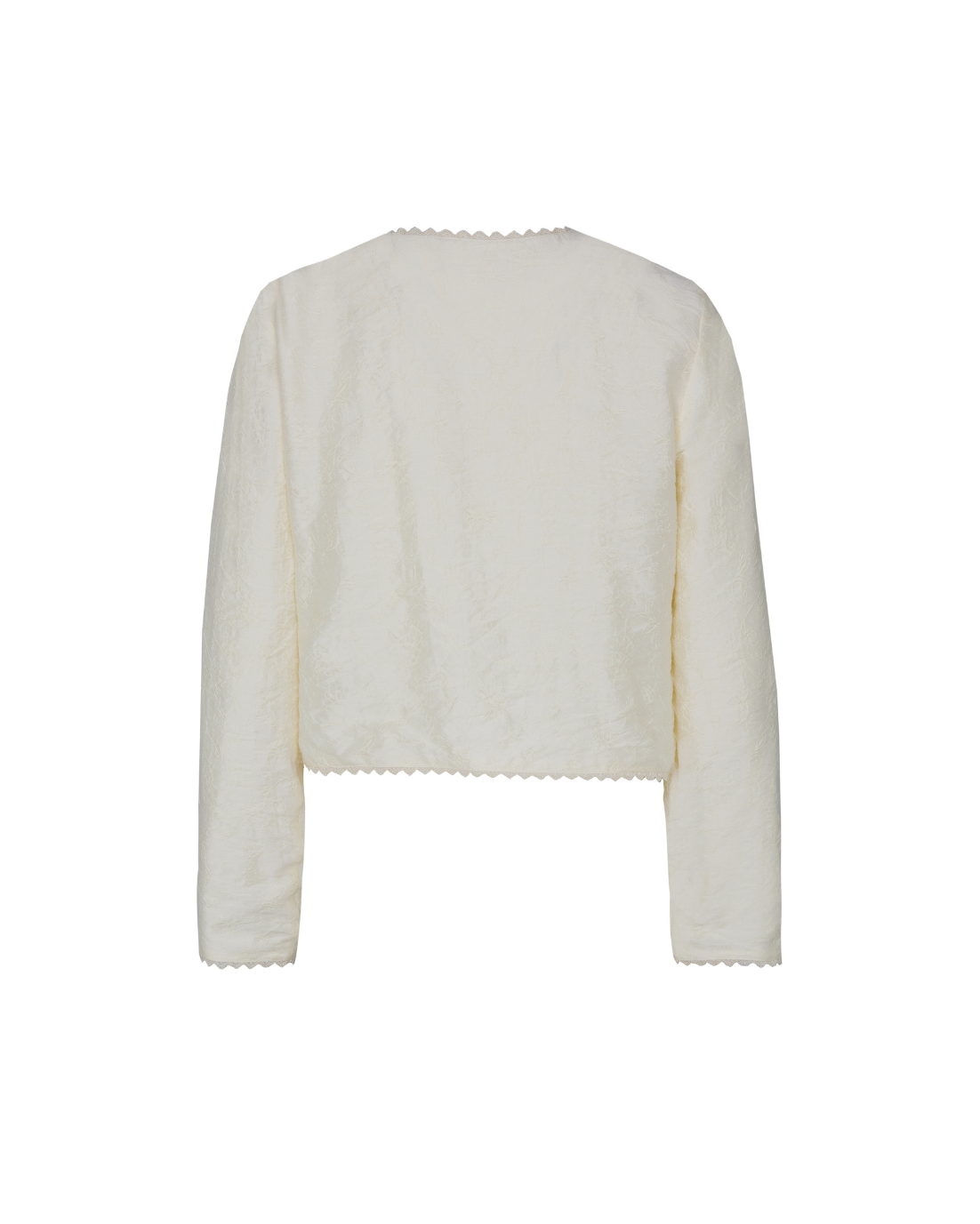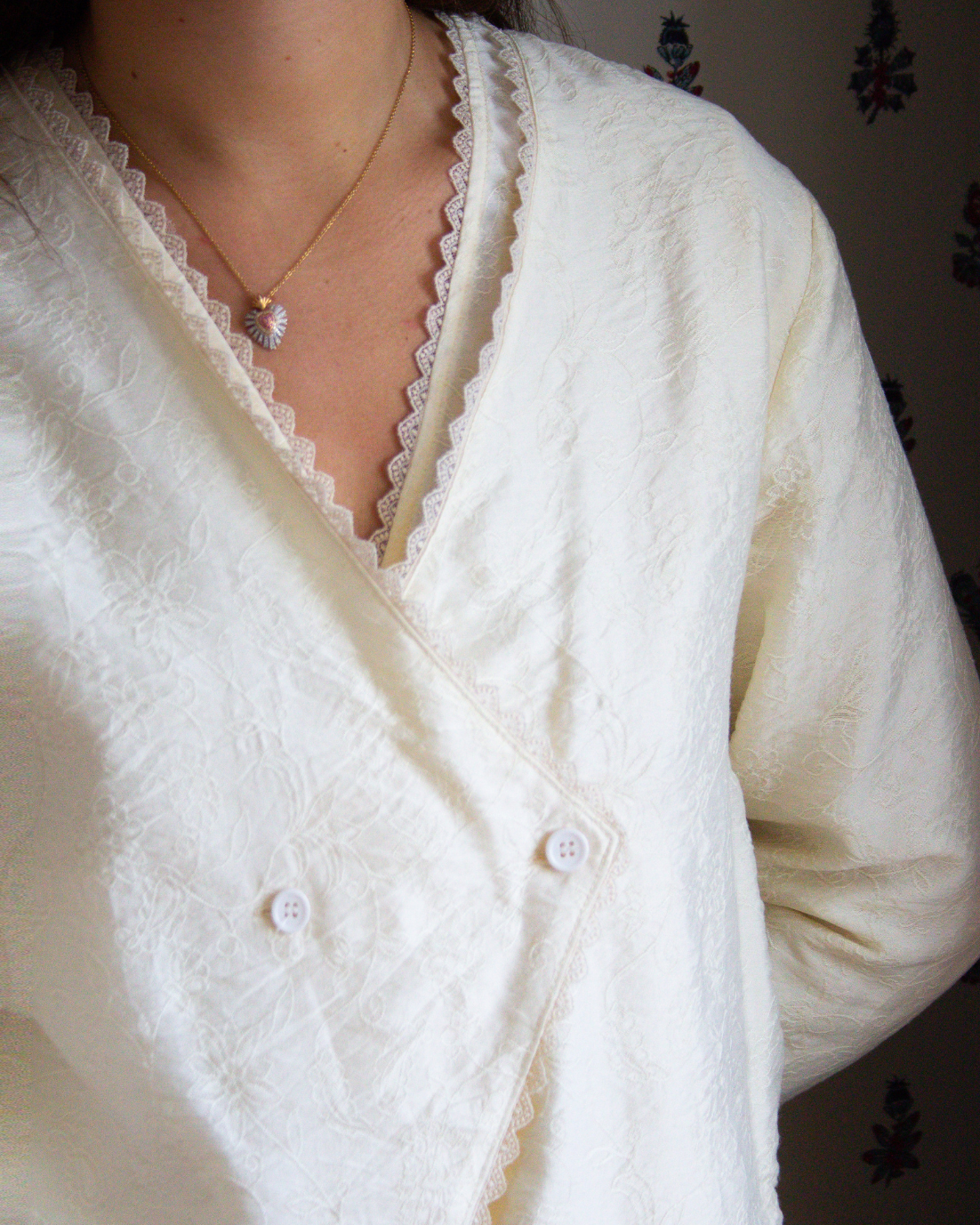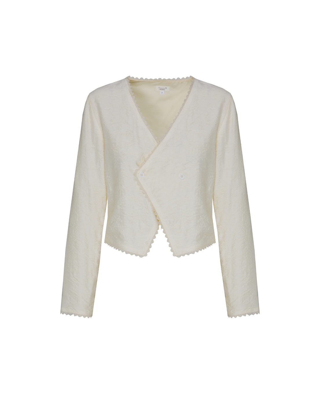 Bata corta con detalle floral bordado en color crema. Cierre cruzado con botones y manga larga. Detalles de puntilla bordada.