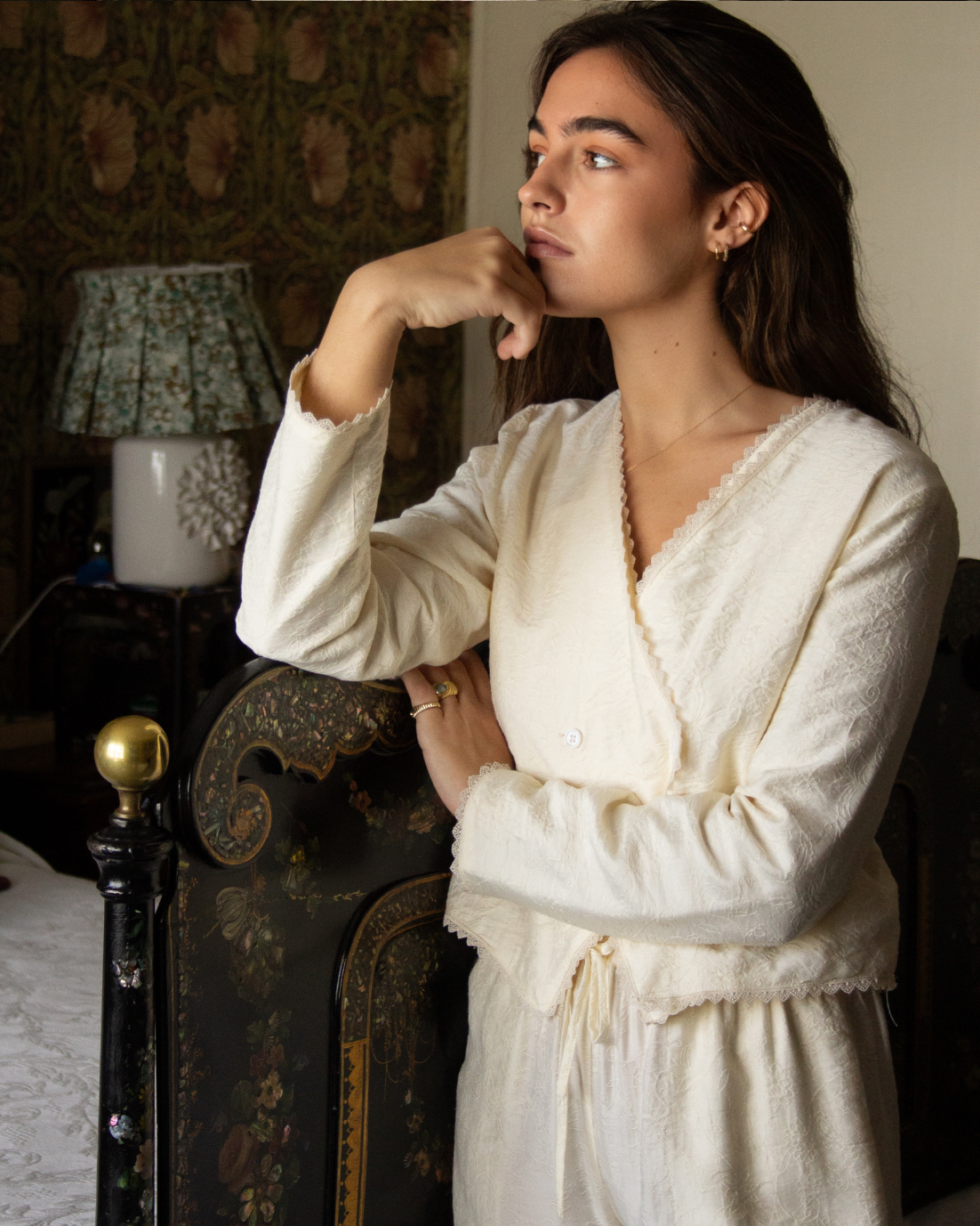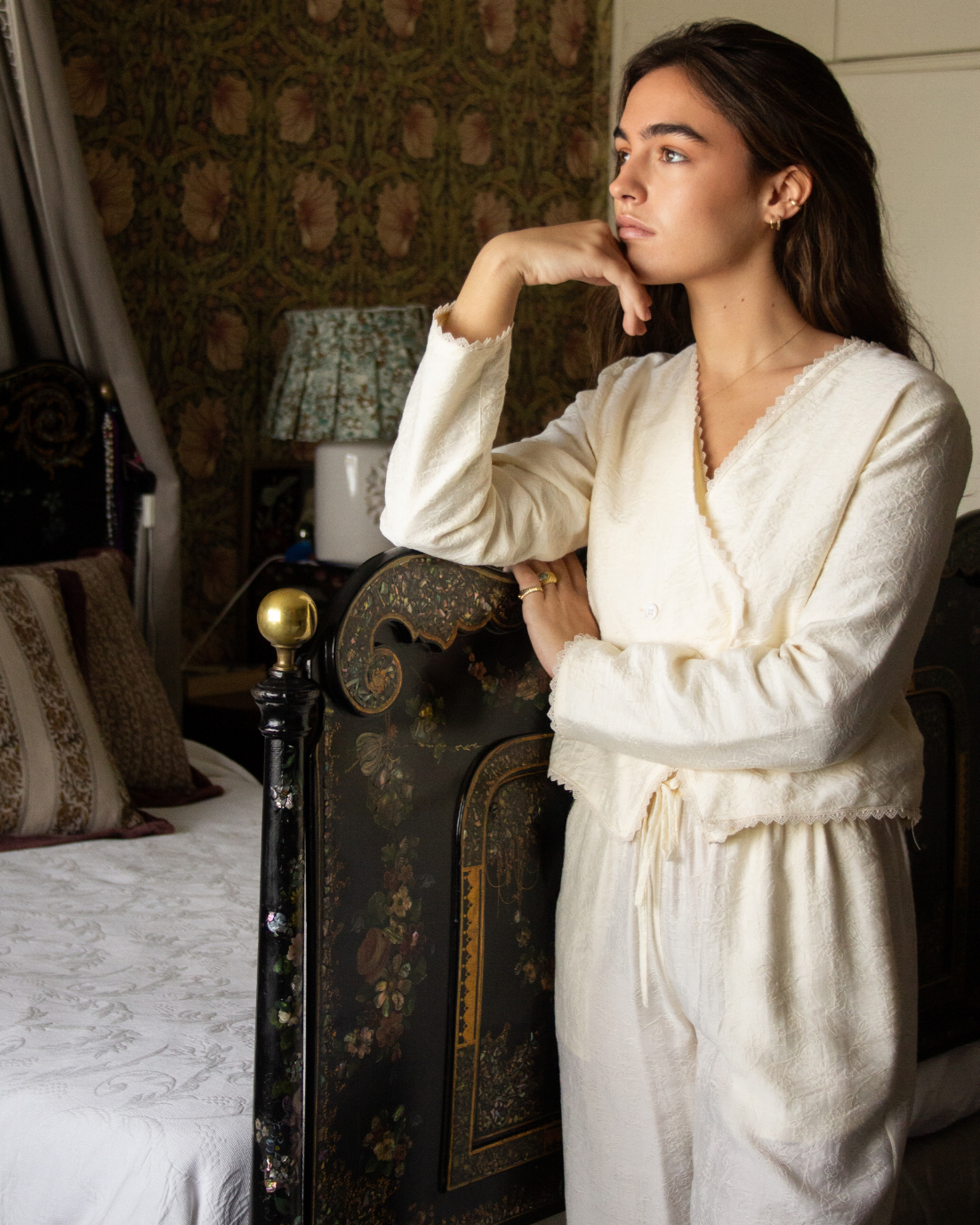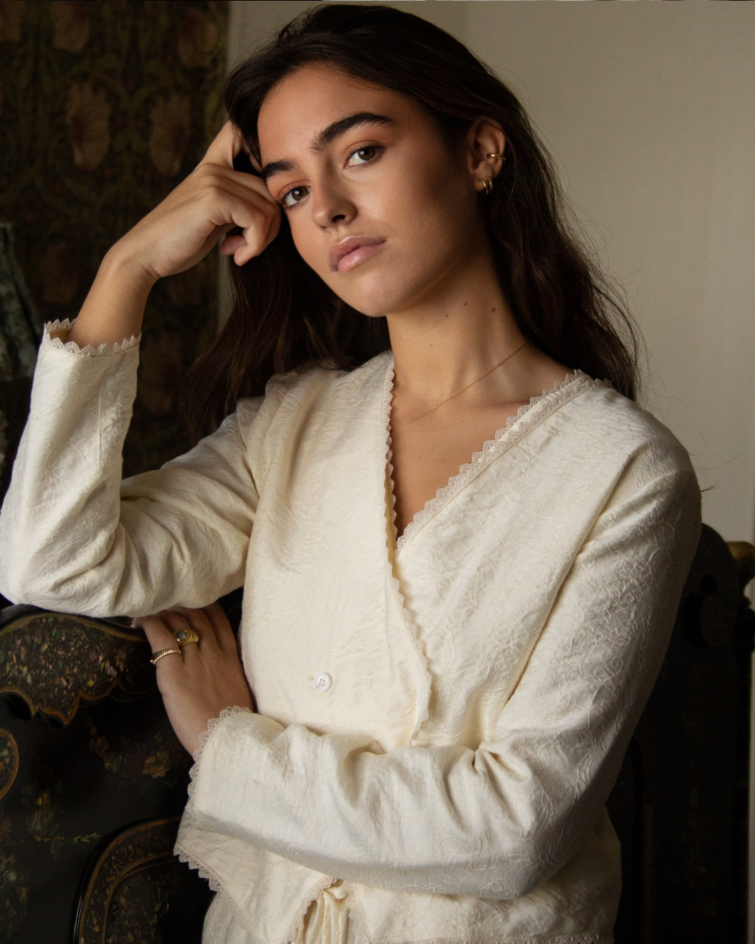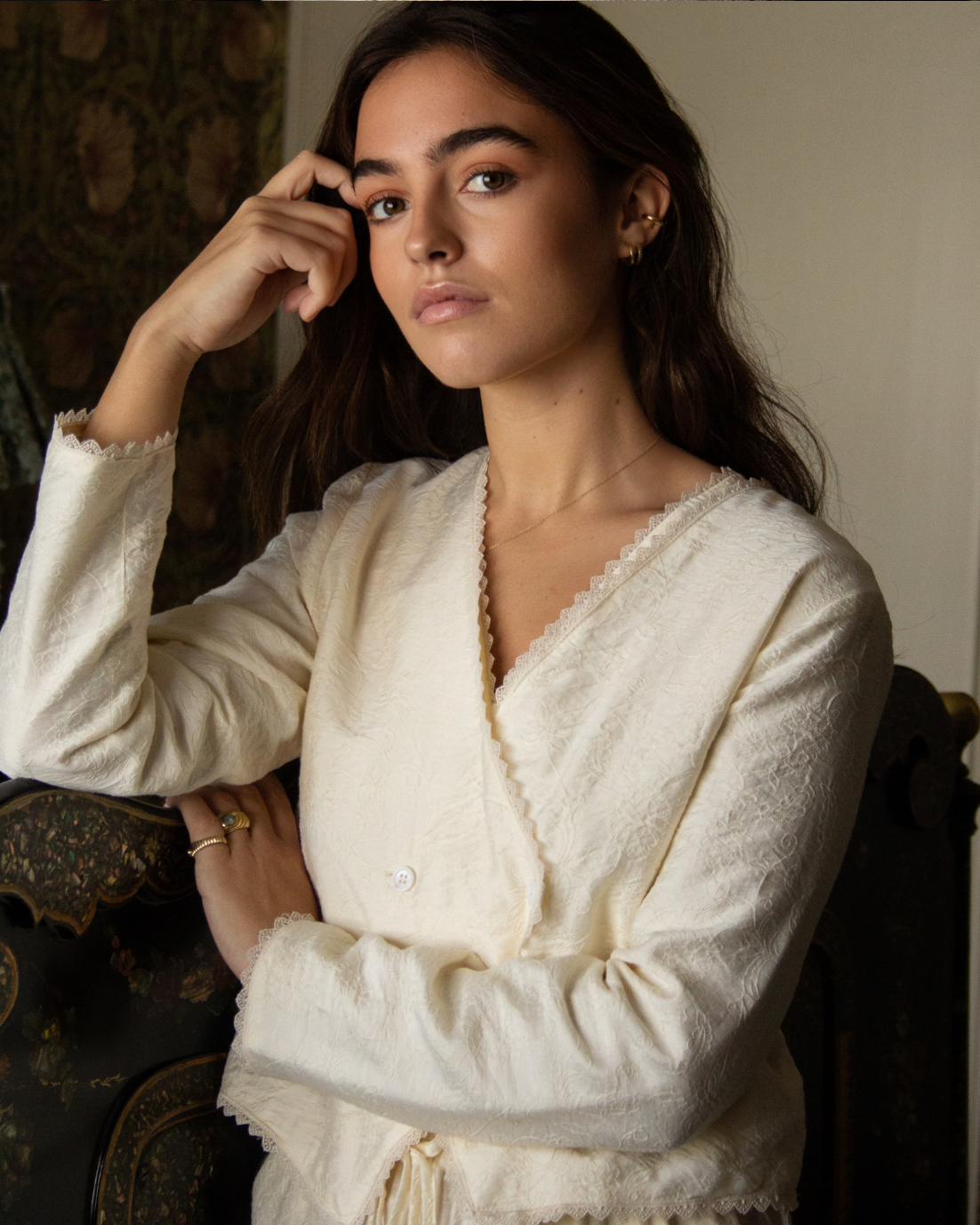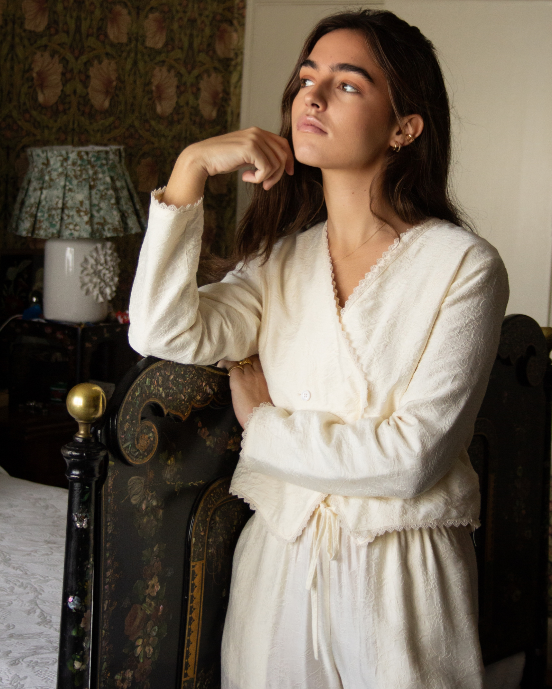 Bata corta con detalle floral bordado en color crema. Cierre cruzado con botones y manga larga. Detalles de puntilla bordada.