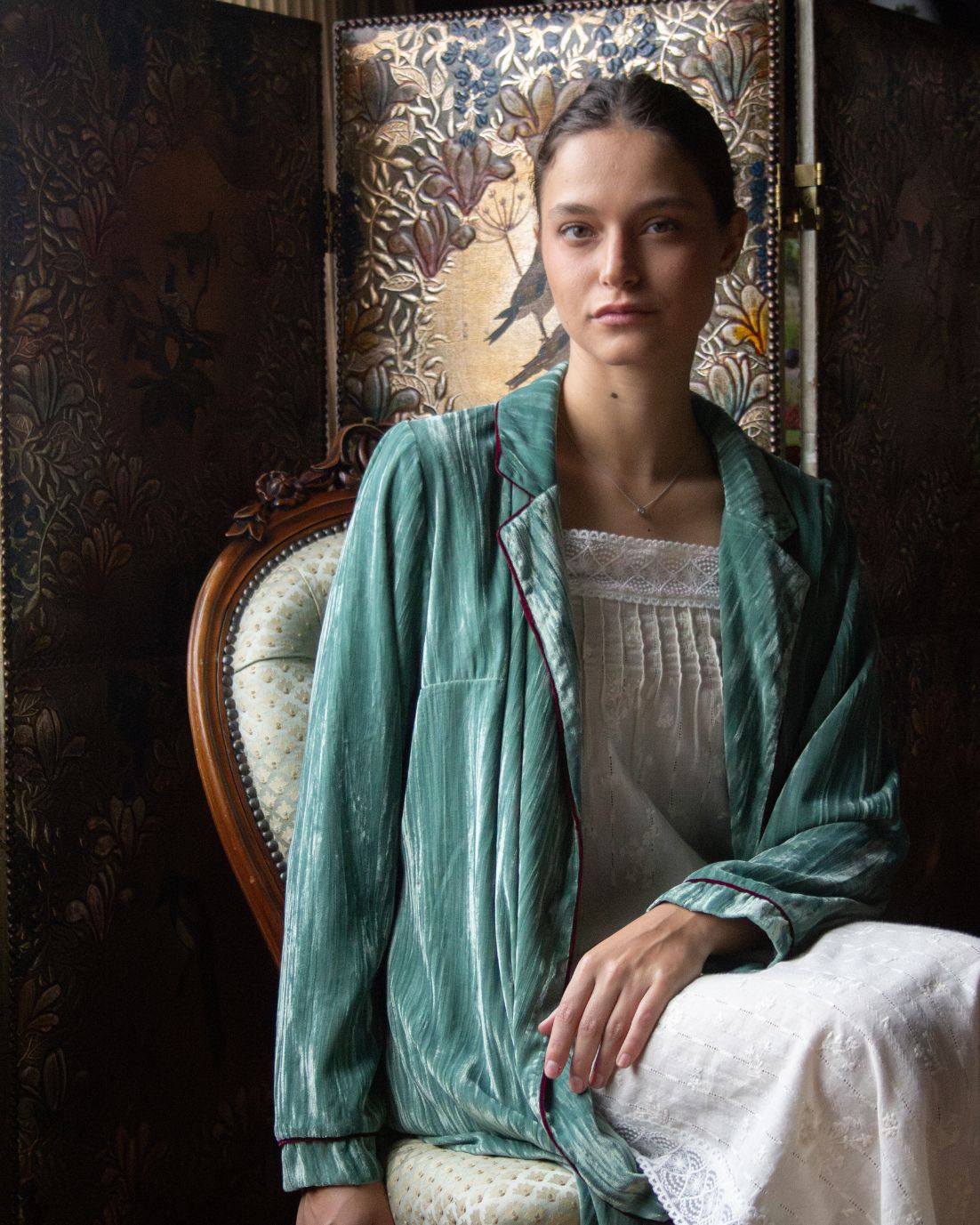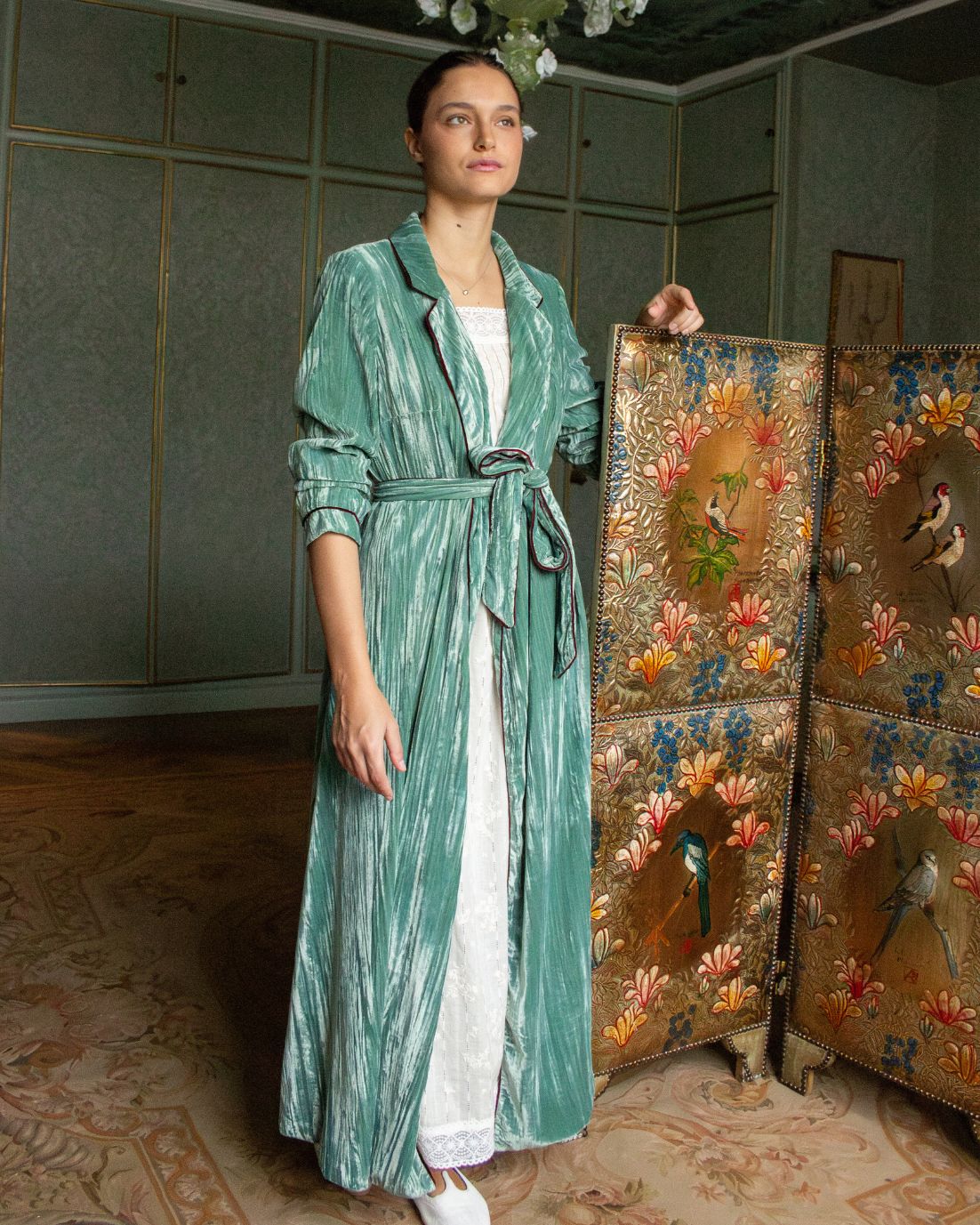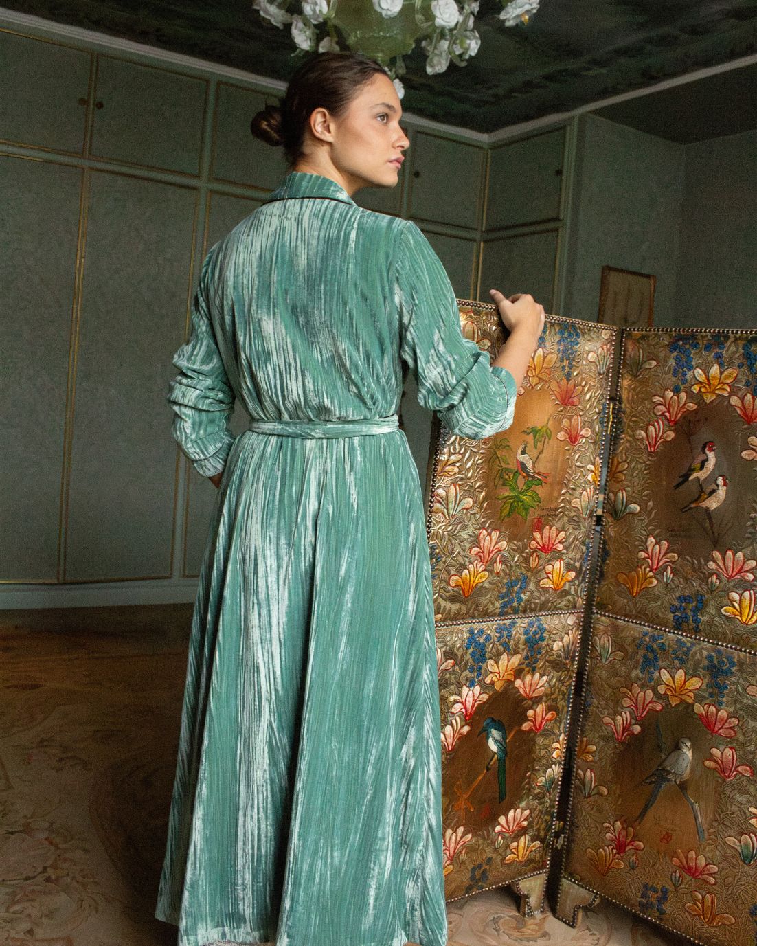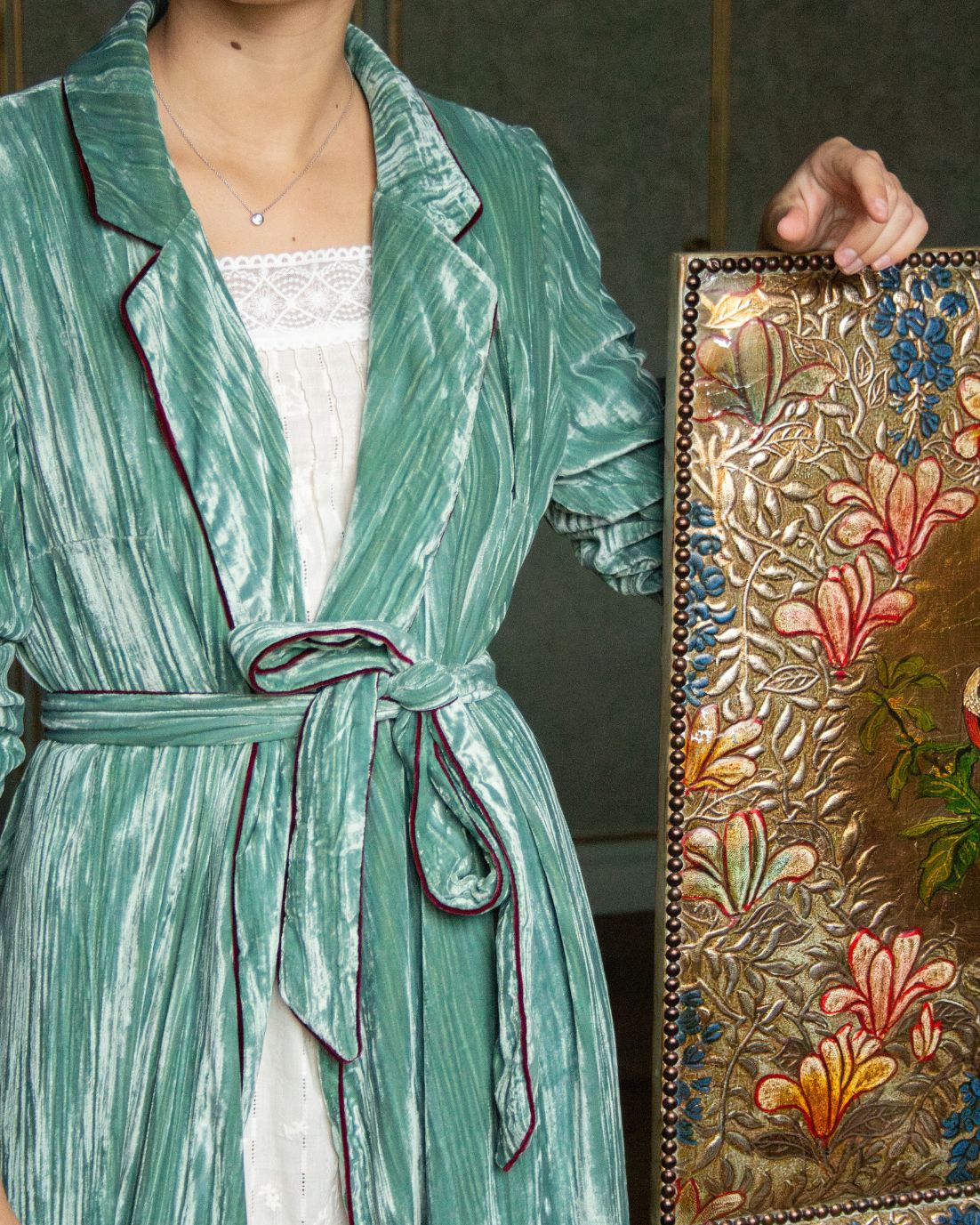 Bata envolvente de terciopelo en color azul turquesa con hombreras. Detalle de ribete de terciopelo en color berenjena. Cierre con cinturón en la cintura. Disponible también en color mostaza.