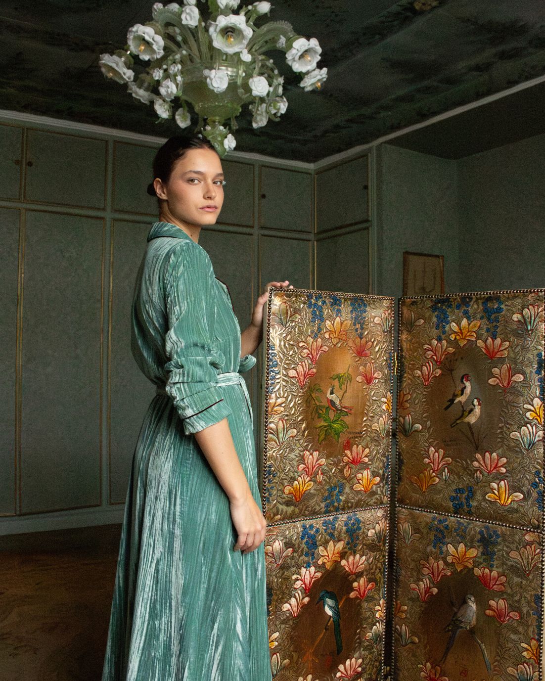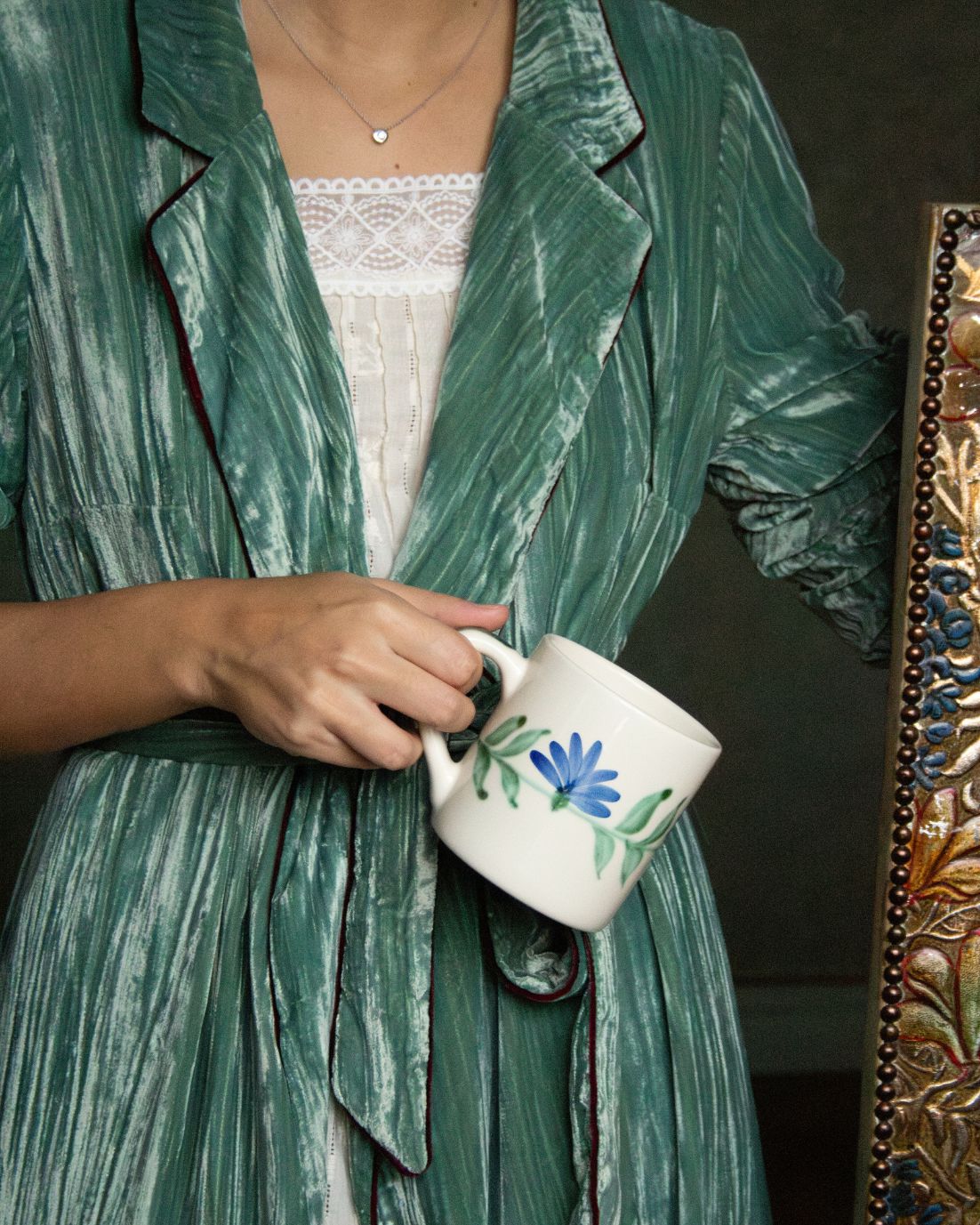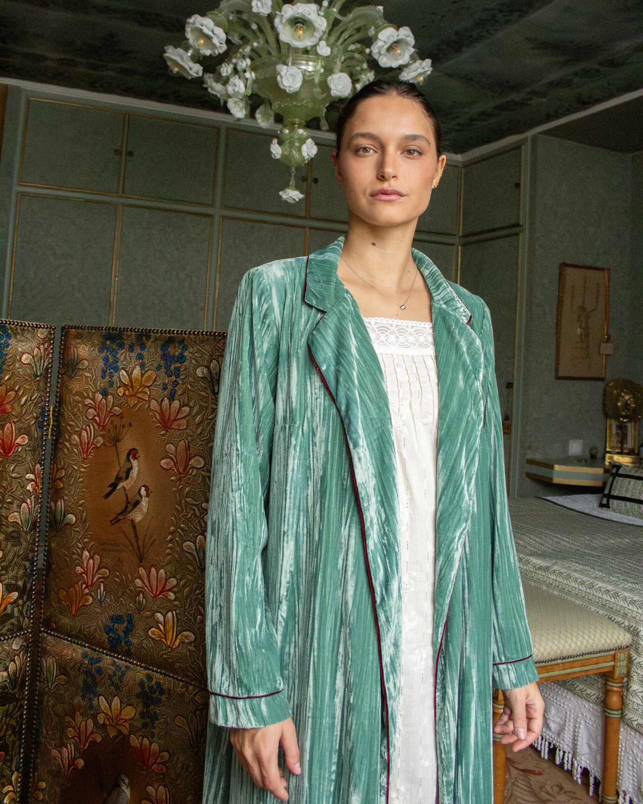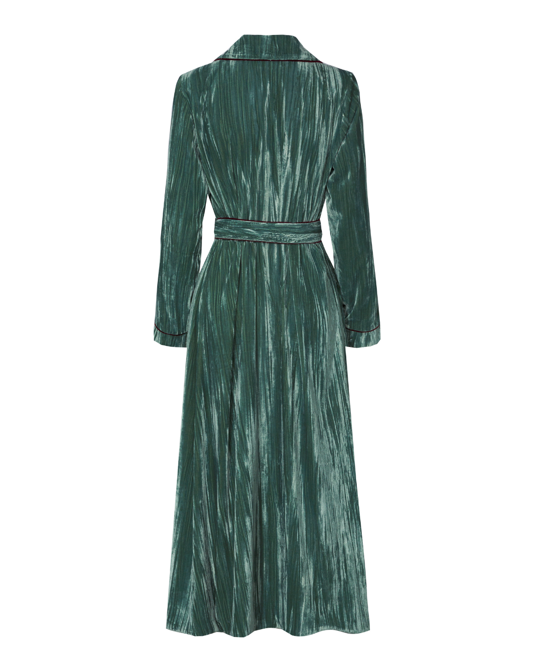 Bata envolvente de terciopelo en color azul turquesa con hombreras. Detalle de ribete de terciopelo en color berenjena. Cierre con cinturón en la cintura. Disponible también en color mostaza.