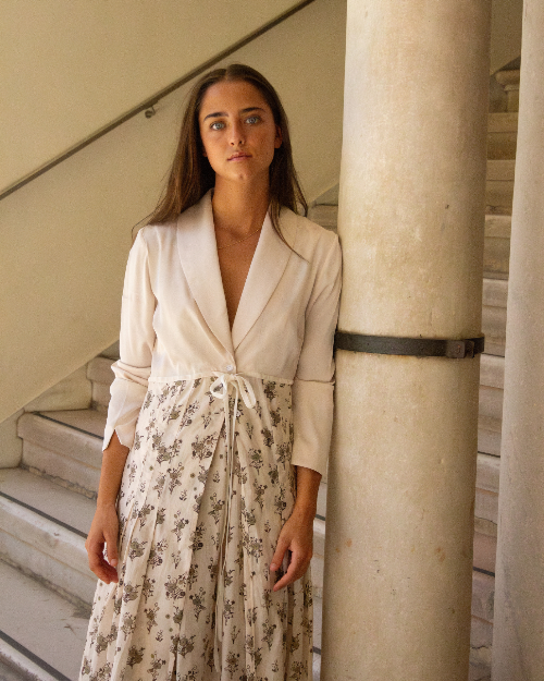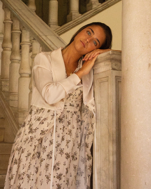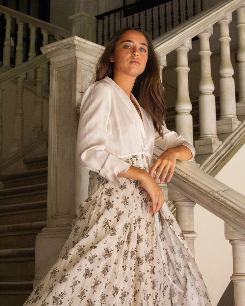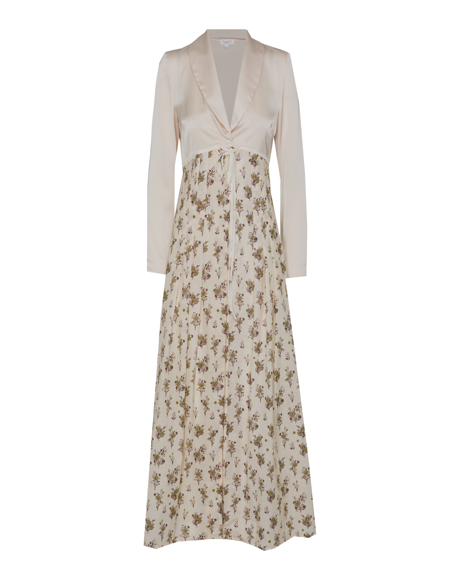 Bata de algodón con estampado floral en color verde y contraste en raso. Escote con solapa con detalle de lazo de terciopelo.