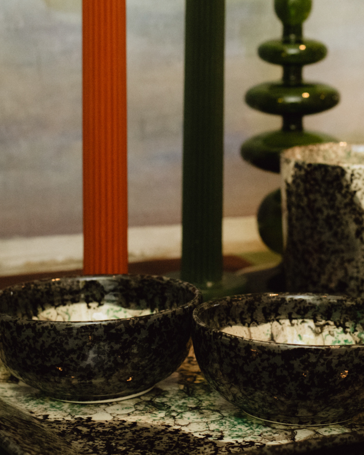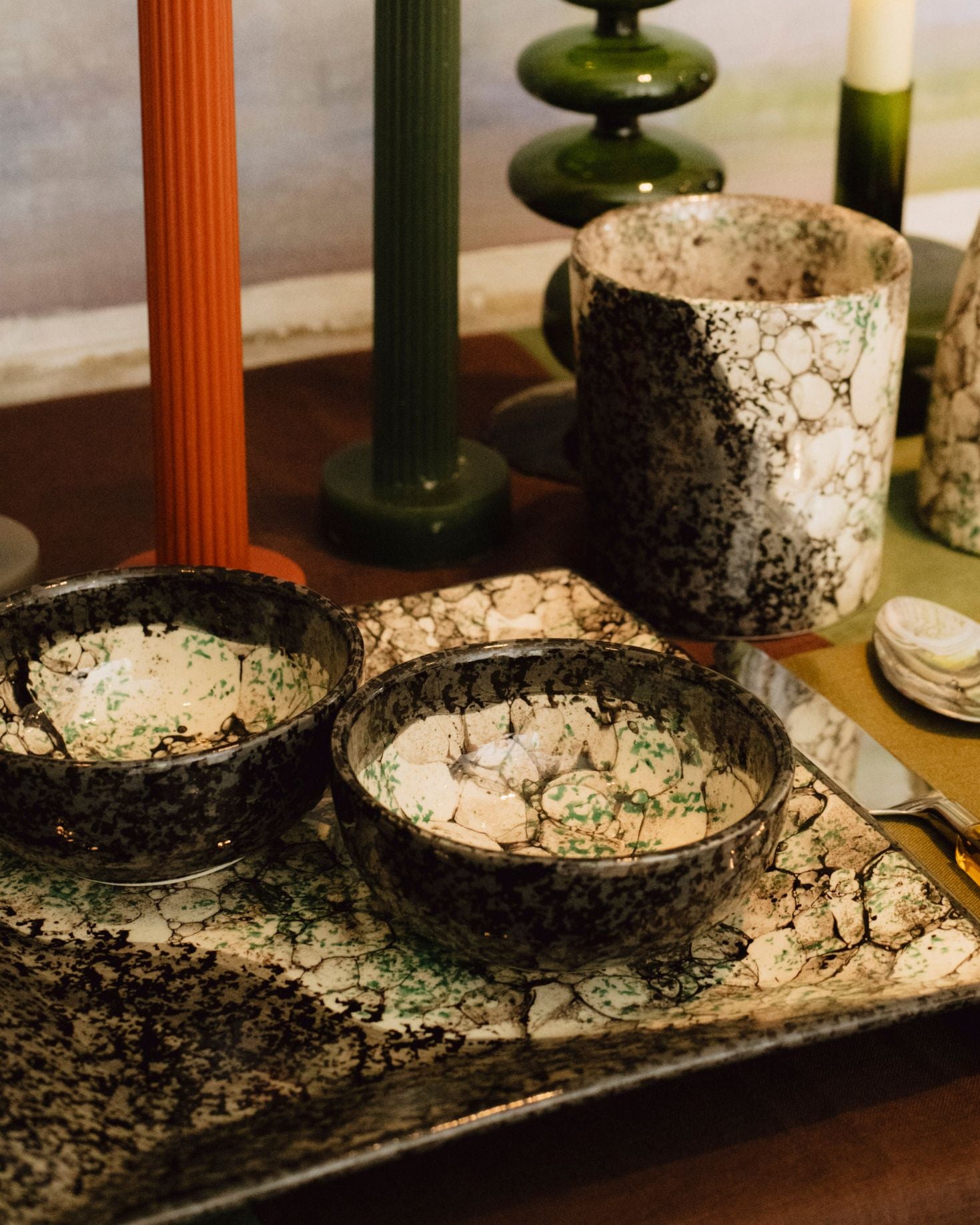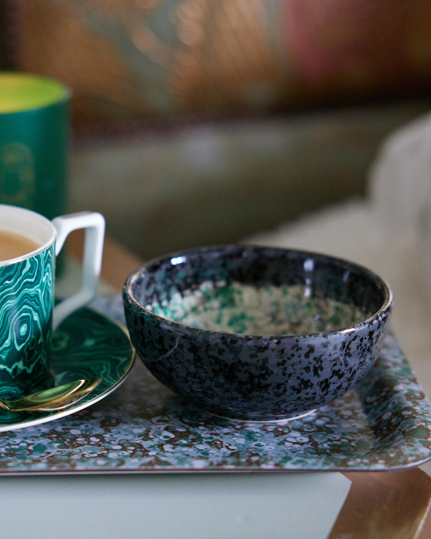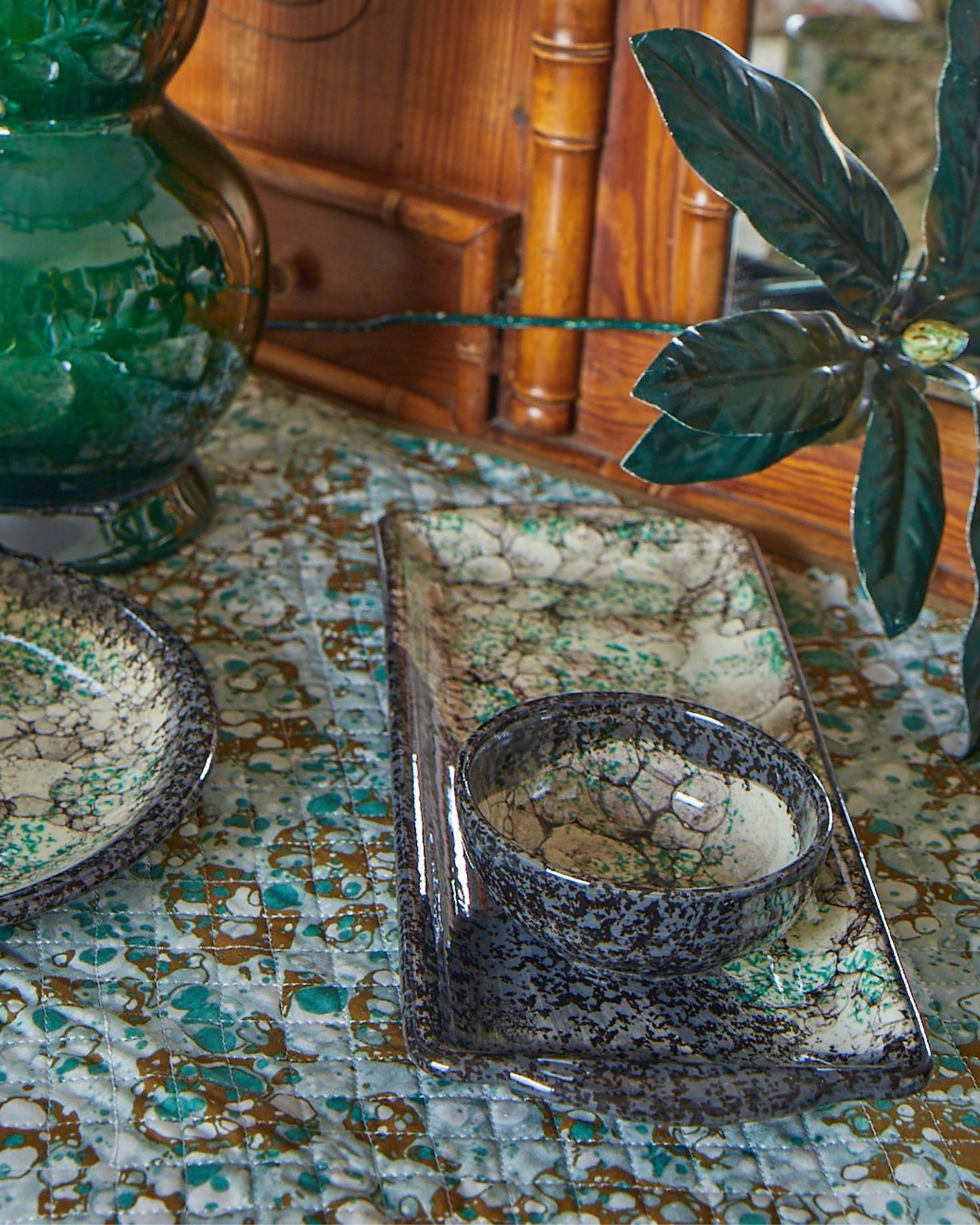 Cuenco pequeño de mármol en color blanco y verde, fabricado en cerámica artesanal y pintado a mano en España.