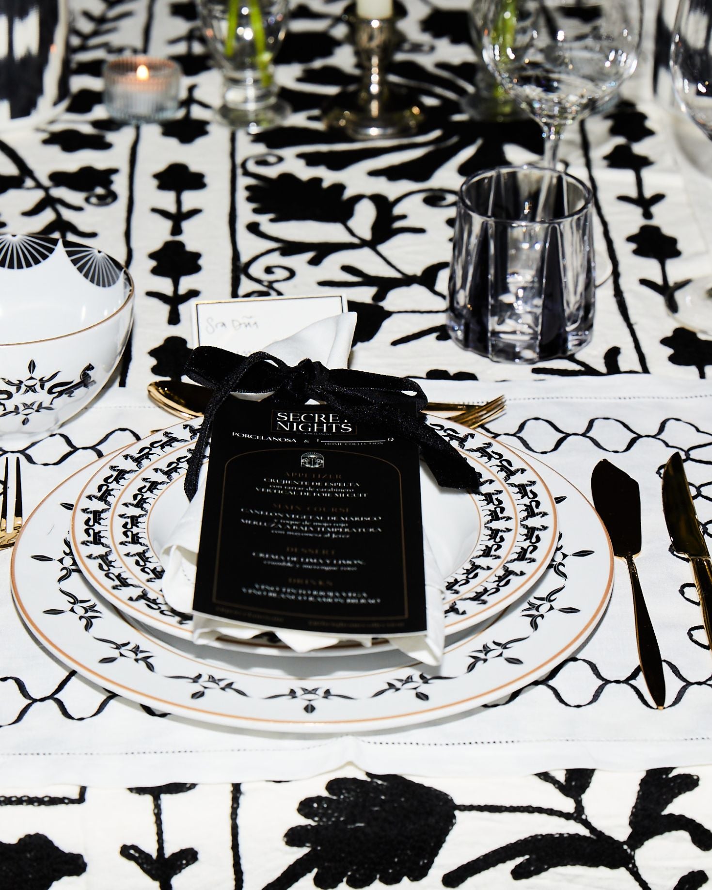 Plato hondo de porcelana en color blanco y negro, con diferentes elementos del logo.