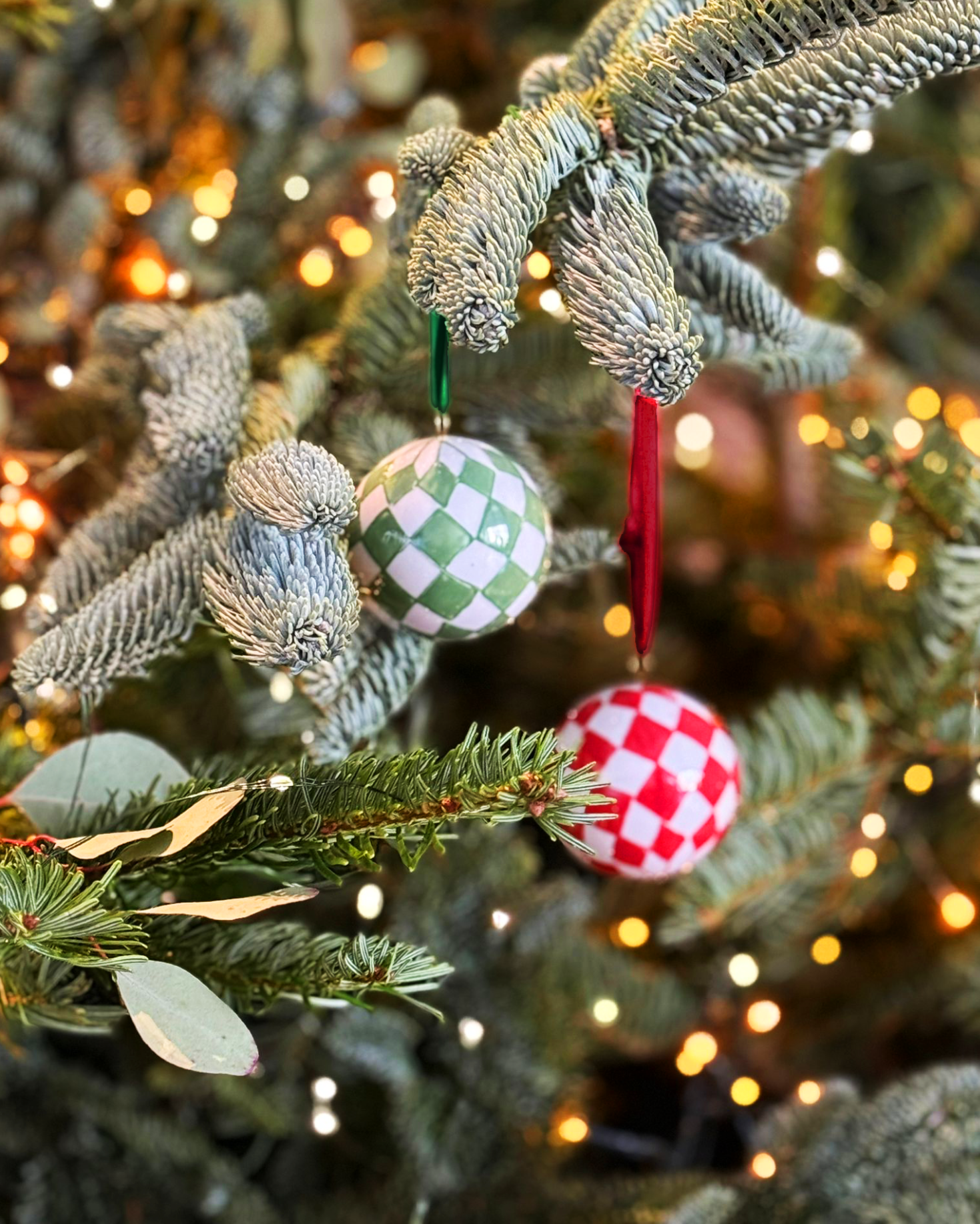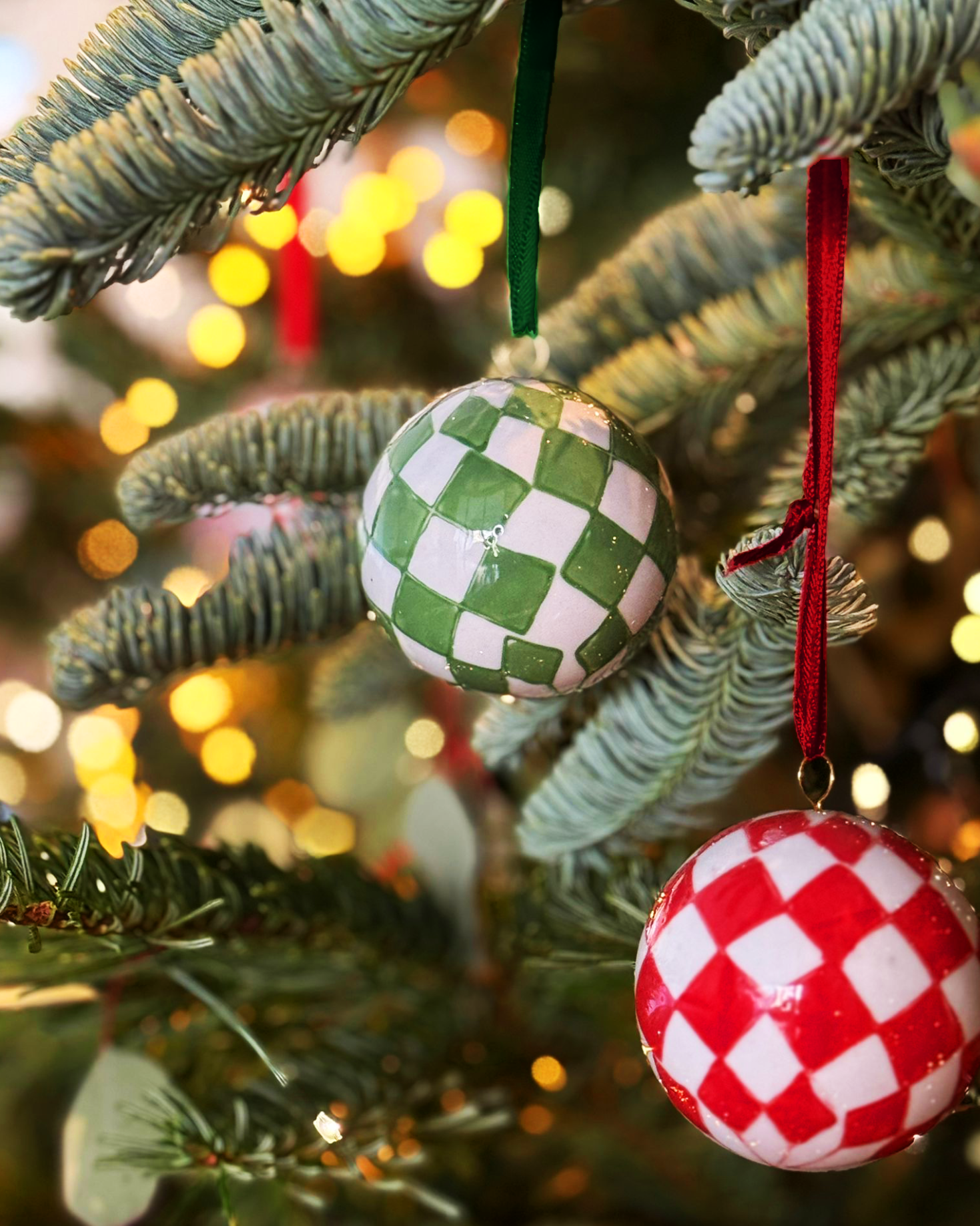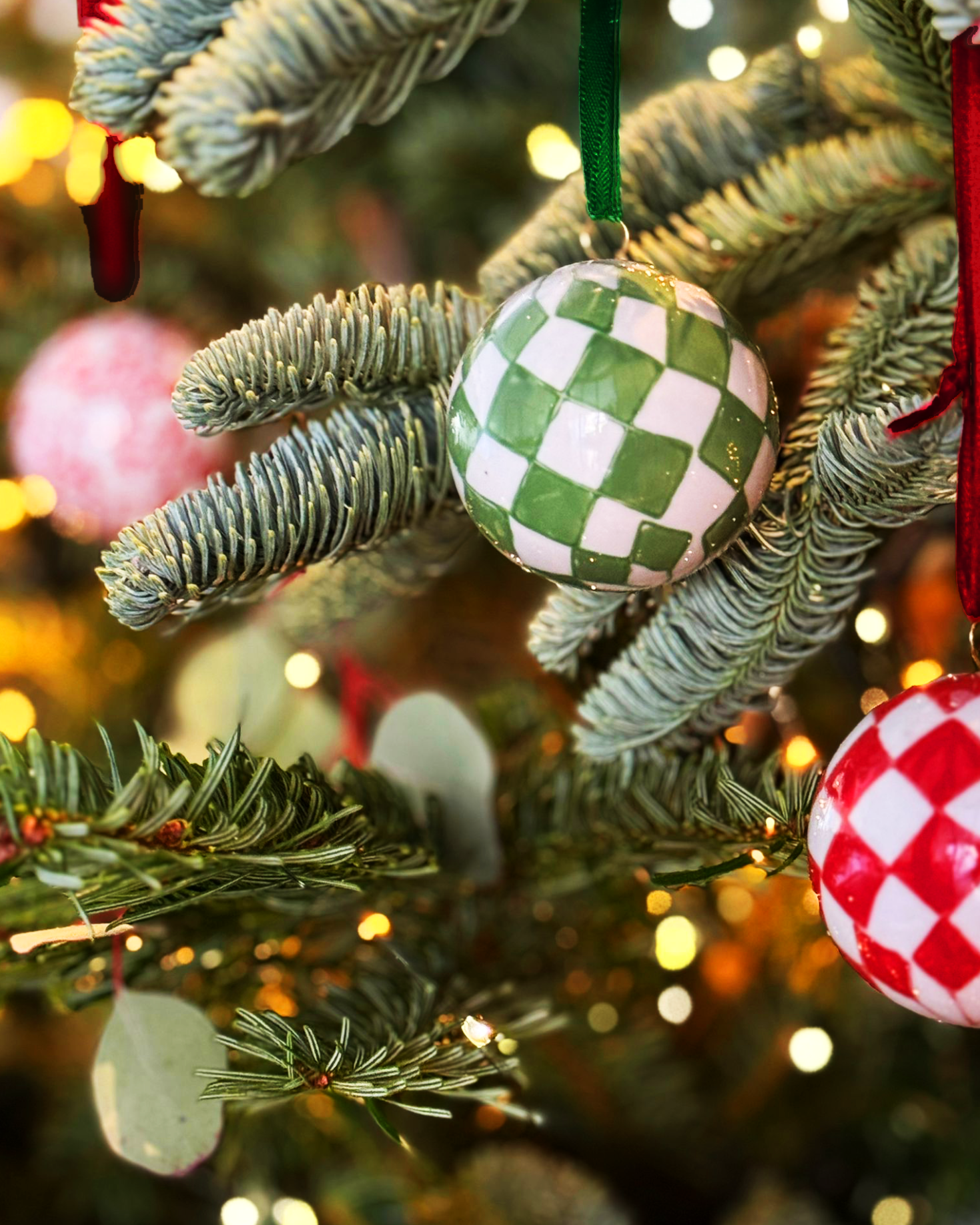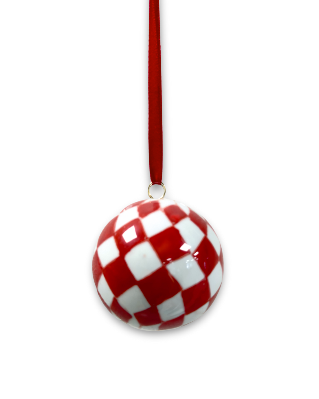 Bola navideña de cerámica con estampado geométrico en color rojo y blanco. Pintado a mano en España.