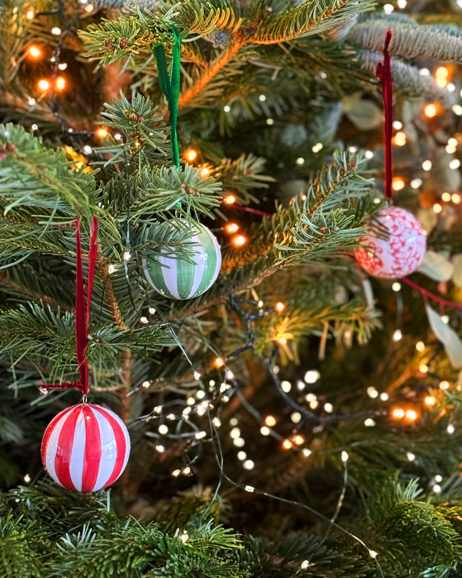 Bola navideña de cerámica con estampado de rayas verticales en color rojo y blanco. Pintado a mano en España.