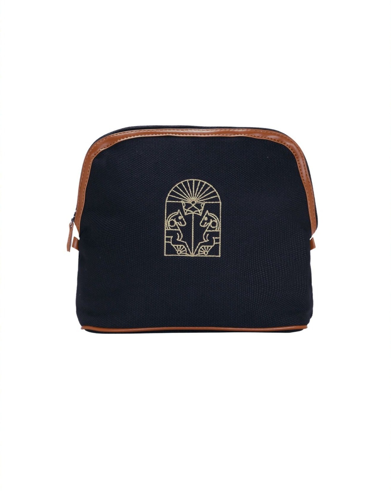 Neceser o clutch en 2 colores, negro y marrón oscuro, con logo de IQ Home bordado. Hecho en 100% algodón.