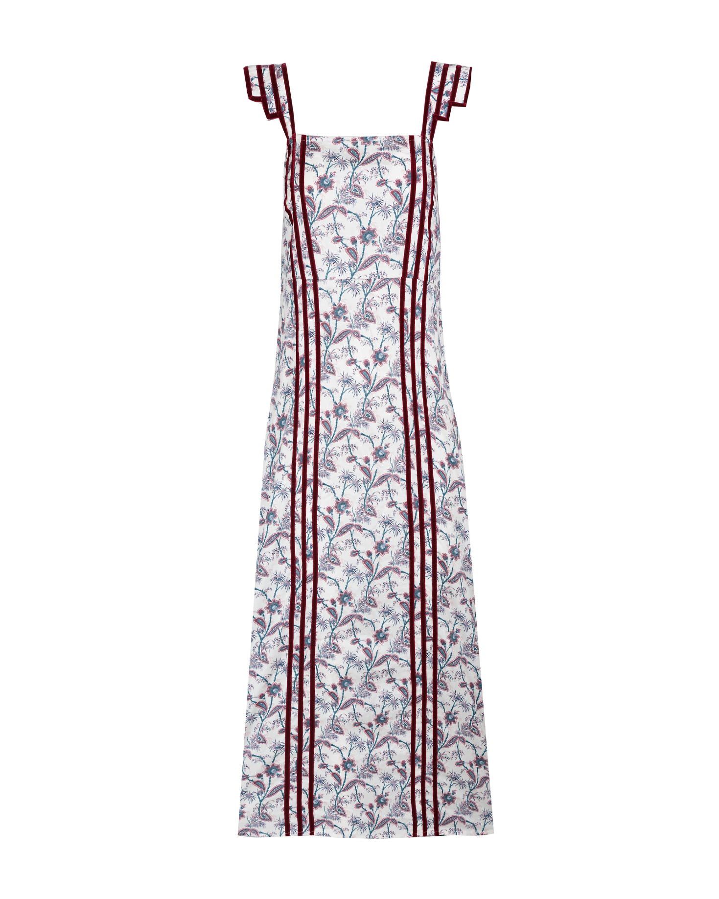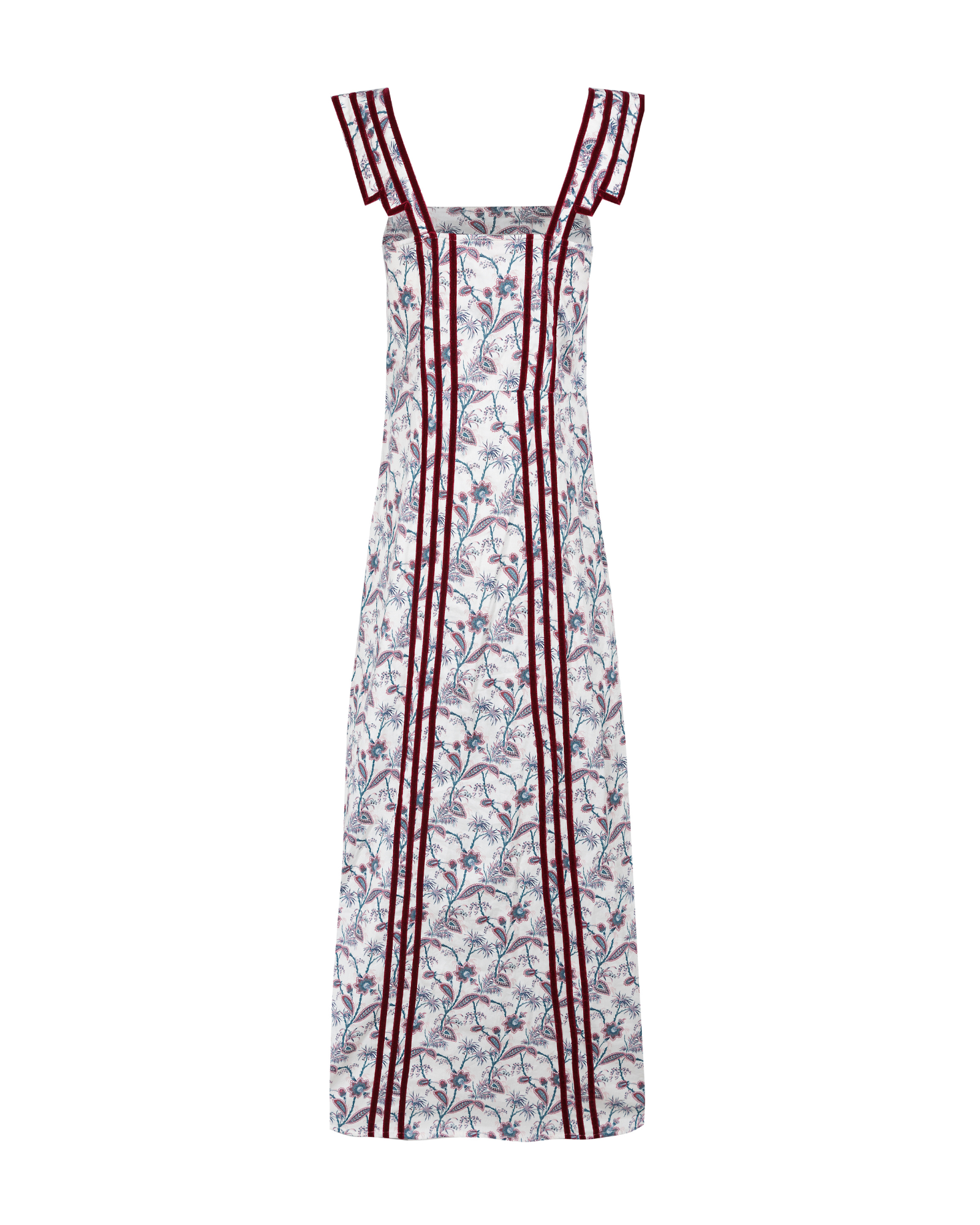 Camisón con estampado floral en algodón 100%. Tirante estilo IQ, detalles en terciopelo y largo tobillero.