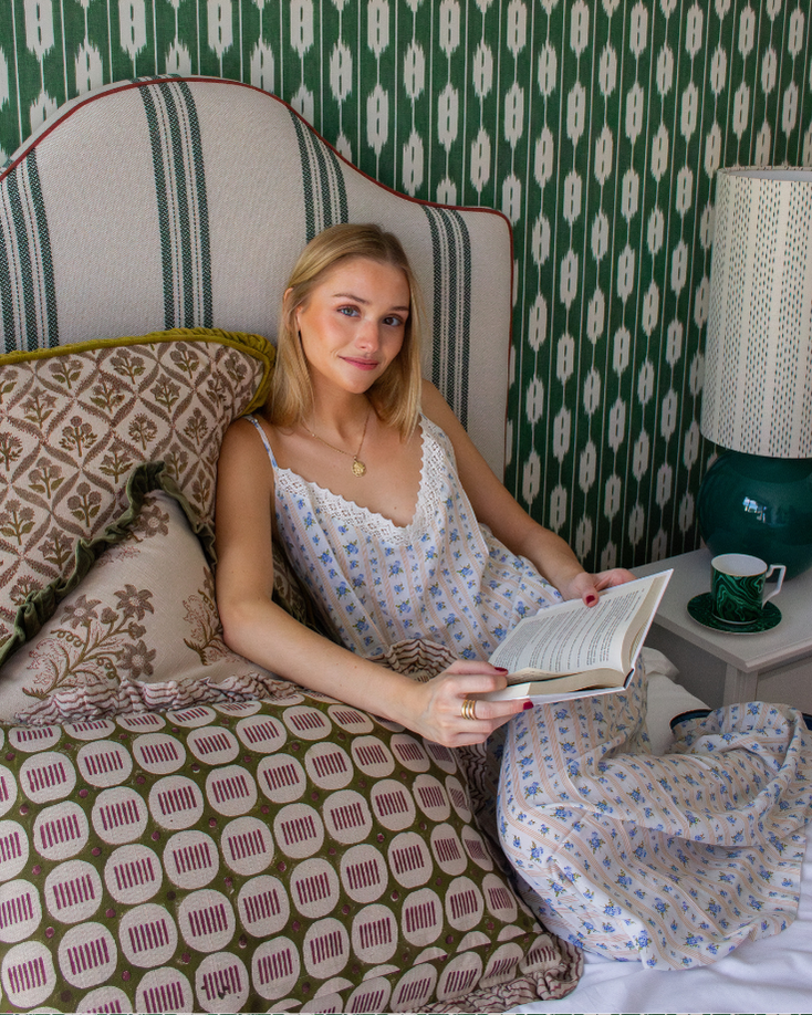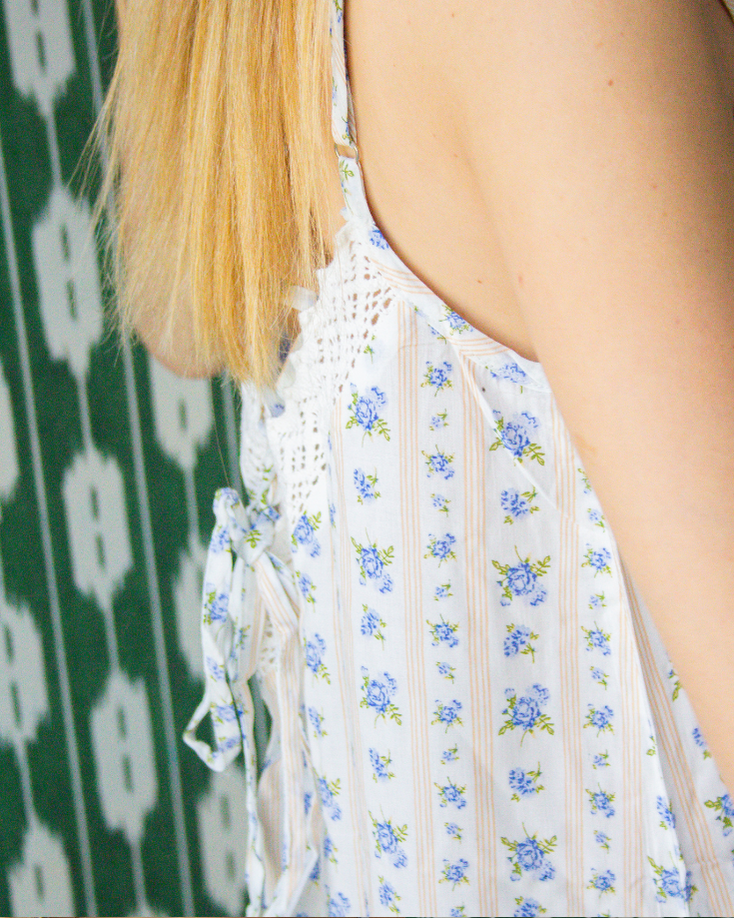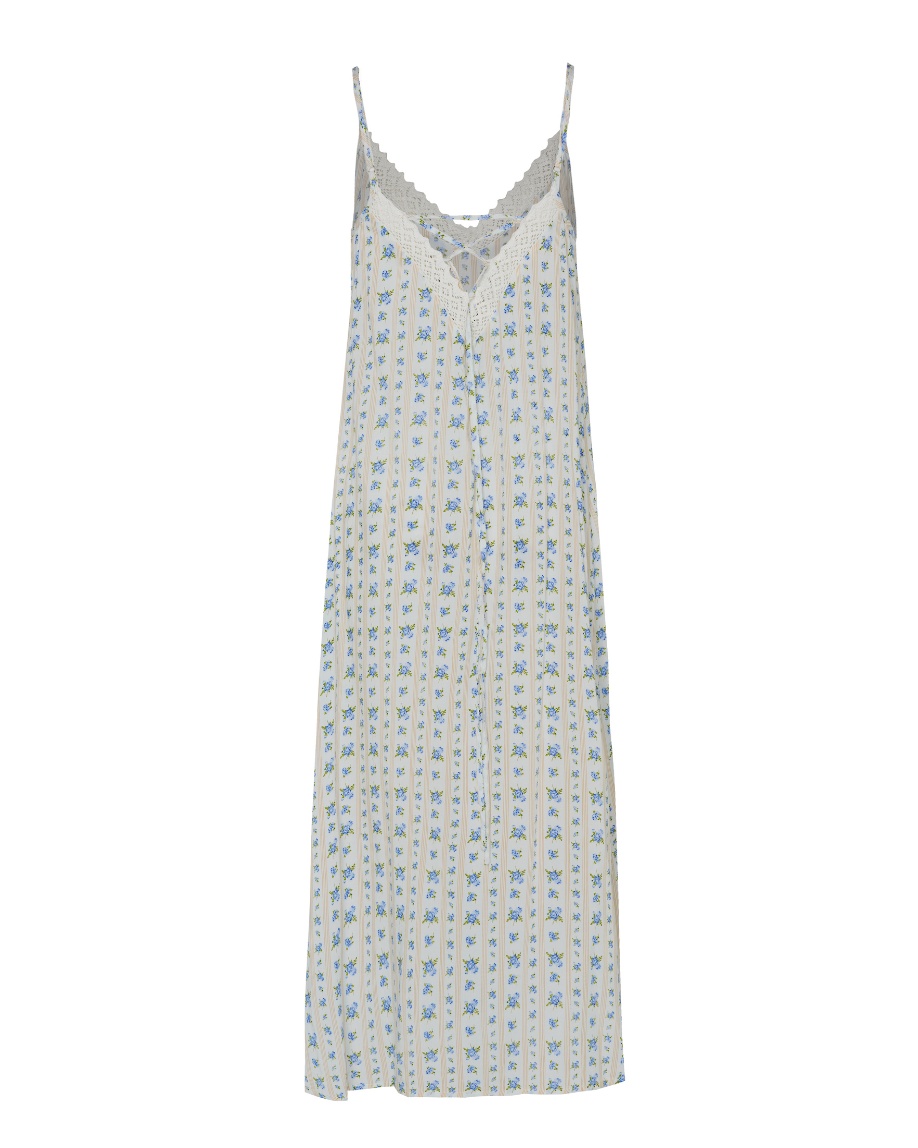 Camisón gala largo con escote en V y tirantes cruzados en la espalda. Detalles bordados en escote y espalda. Tejido de modal estampado con rayas naranja y flores en tonos azules y verdes.