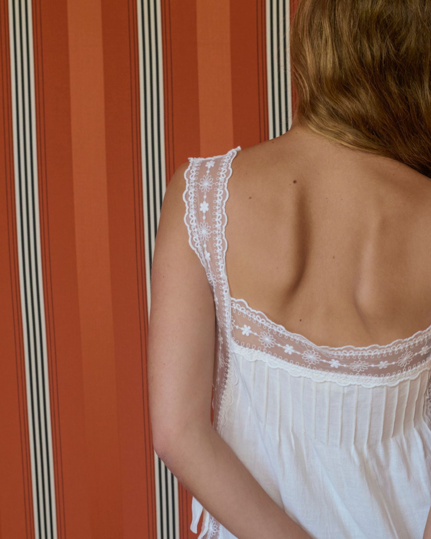 Camisón lencero en color blanco, con tirantes, escote y bajo de encaje. Anudado a los laterales con lazos.