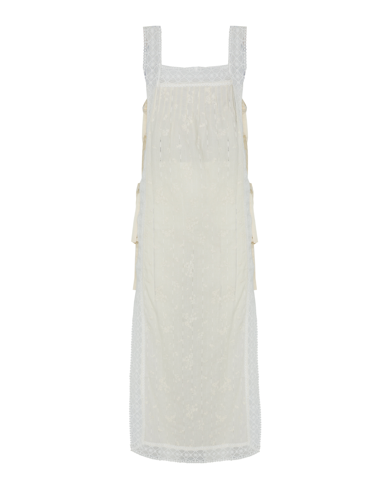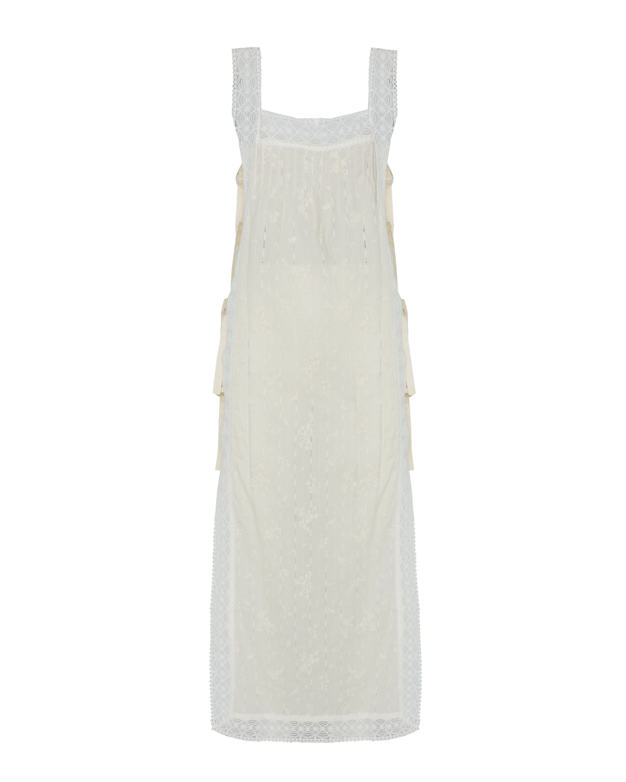 Camisón lencero en color beige con bordado floral y perforado. Tirantes, escote, laterales y bajo de encaje. Anudado a los laterales con detalles de lazos.