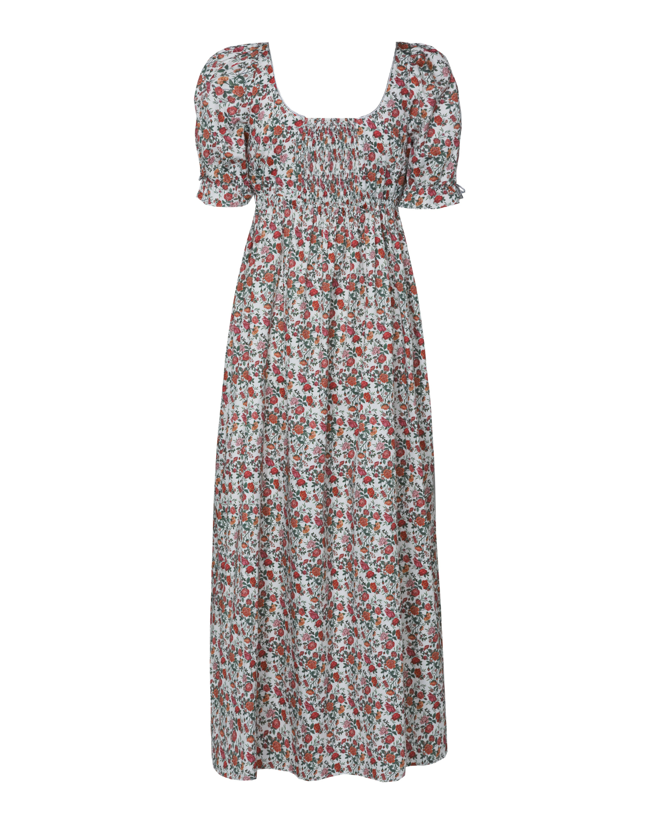 Camisón de corte imperio de algodón 100% con estampado floral exclusivo de Los Bridgerton en tonos verdes y rojo. Manga farol con volante y espalda elástica. Cintura ajustable con lazo. Detalles de lazo plateado en mangas y ribete en escote.