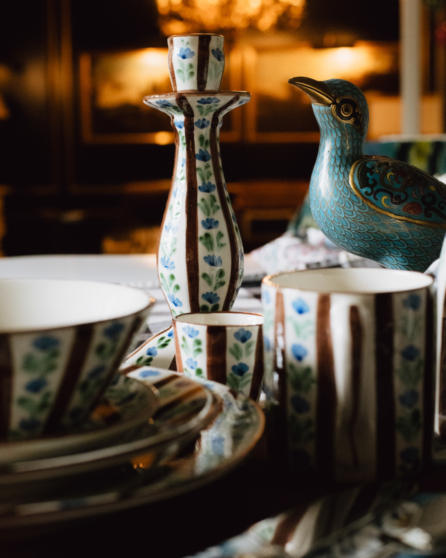 Candelabro fabricado y pintado a mano en cerámica. Su diseño es en color blanco con detalles florales en color marrón y azul.