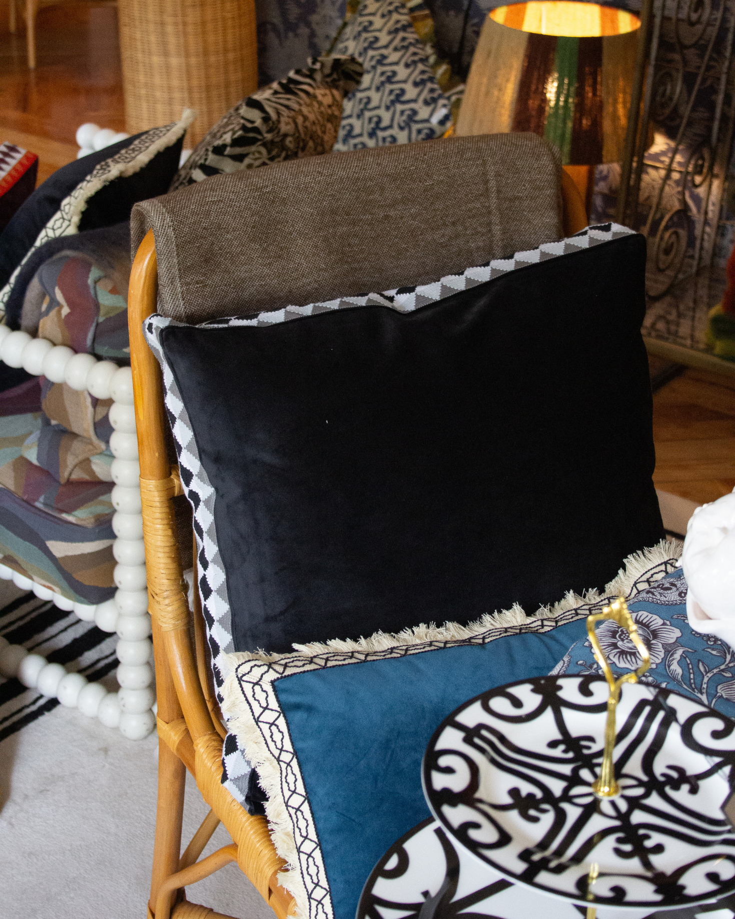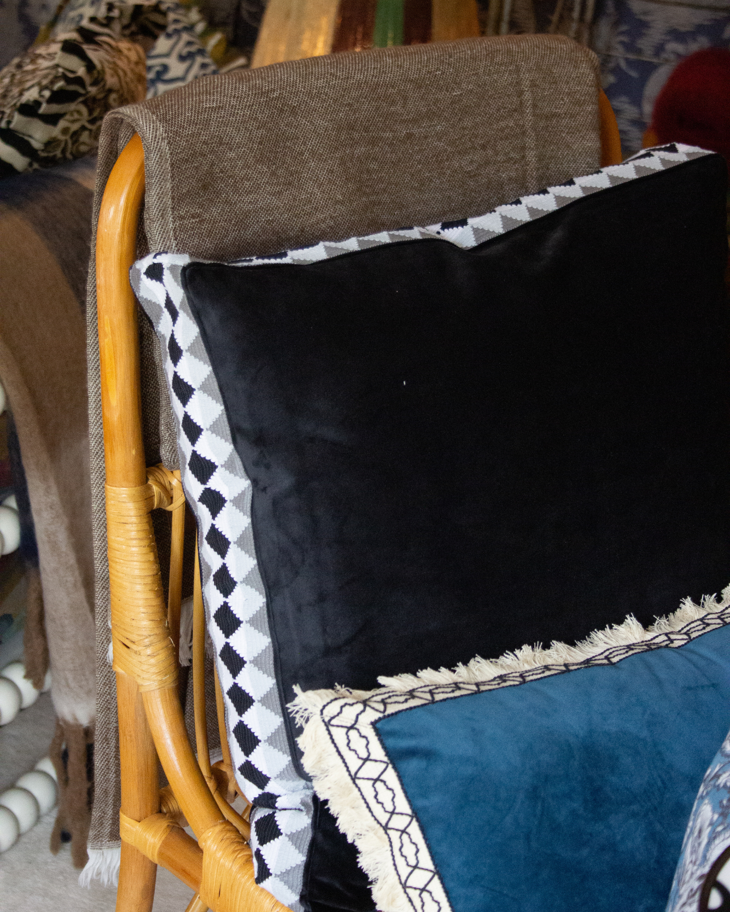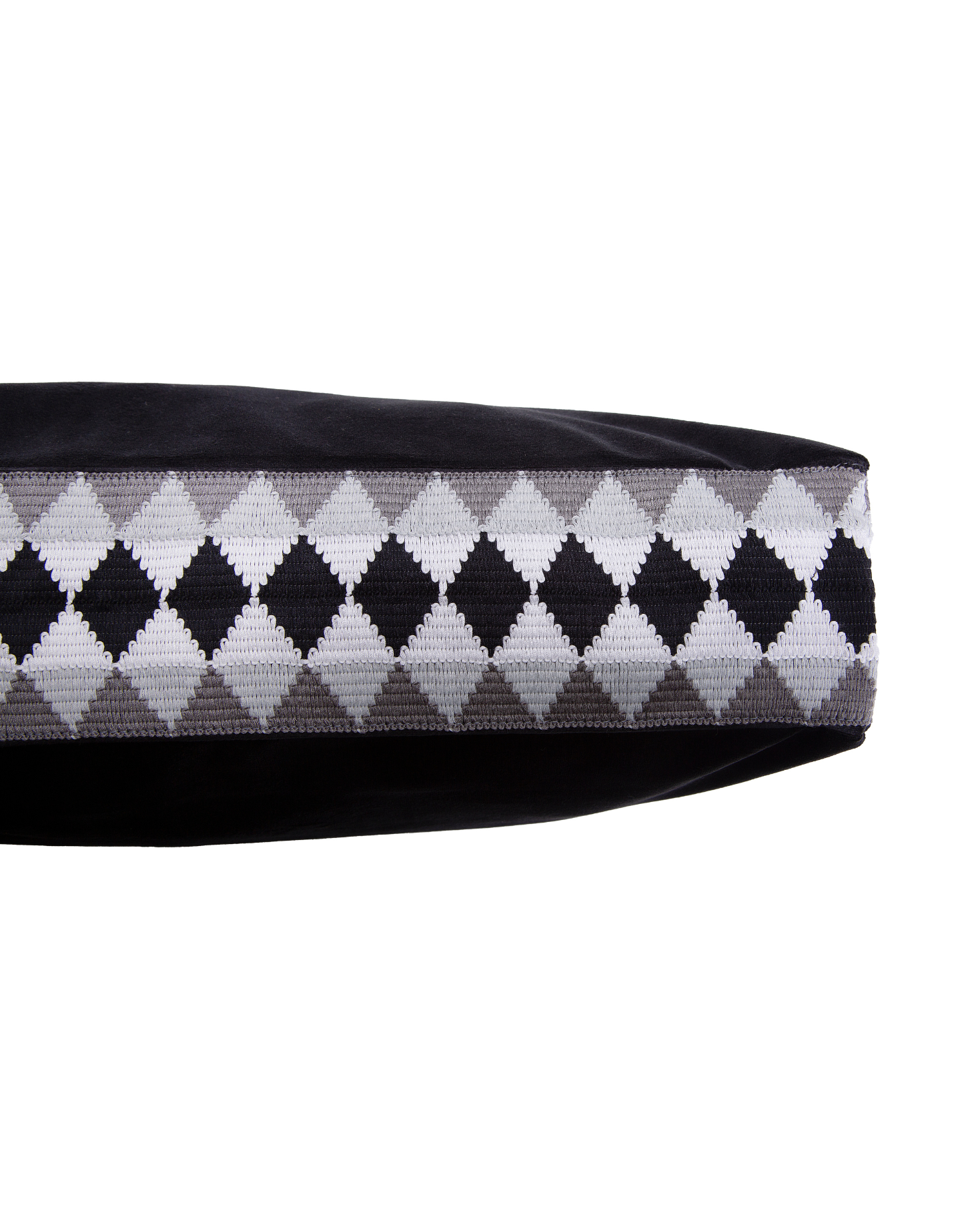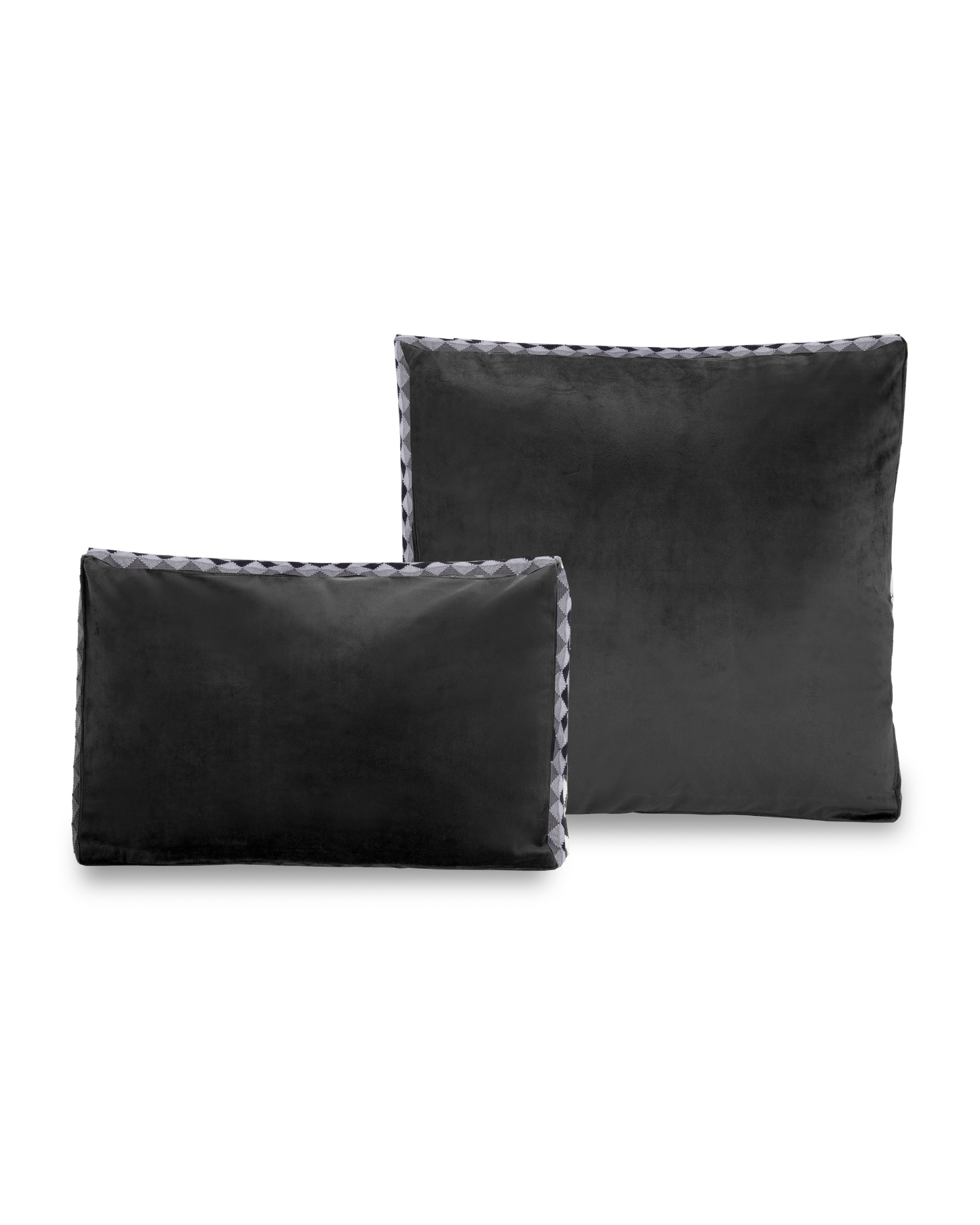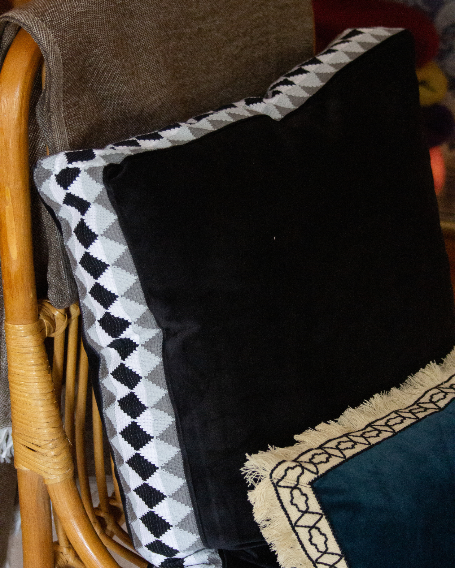 Funda de cojín grande fabricado en terciopelo con cenefa geométrica. Disponible en cuatro tonalidades: burdeos, azul, negro y verde, con greca ancha. No incluye relleno.