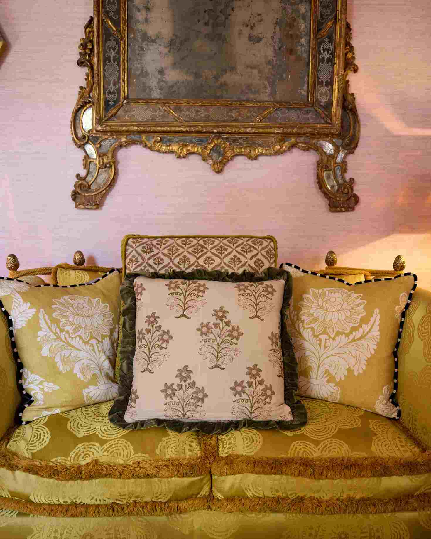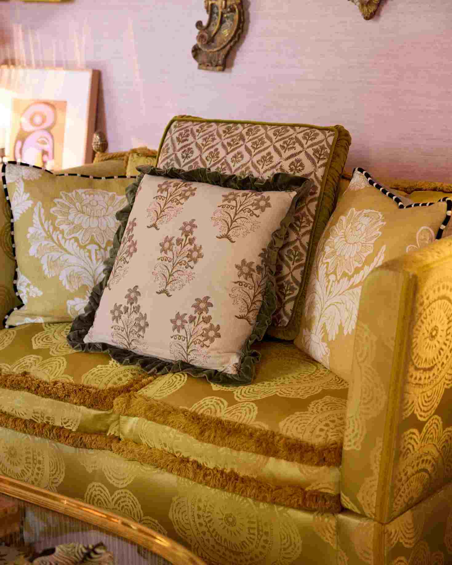 Cojín de algodón con estampado floral en tonos verdes, rosas y crema con detalle de volante de terciopelo verde. Este producto incluye el relleno.